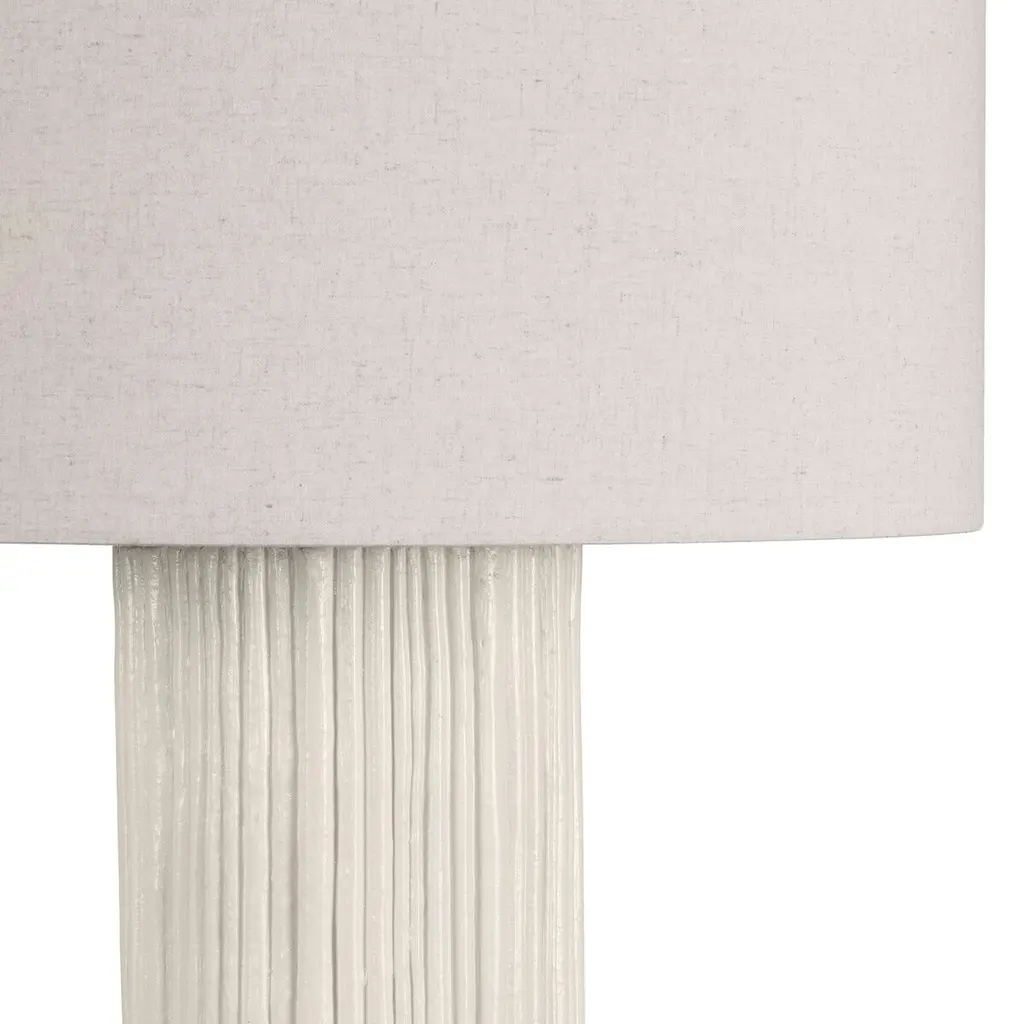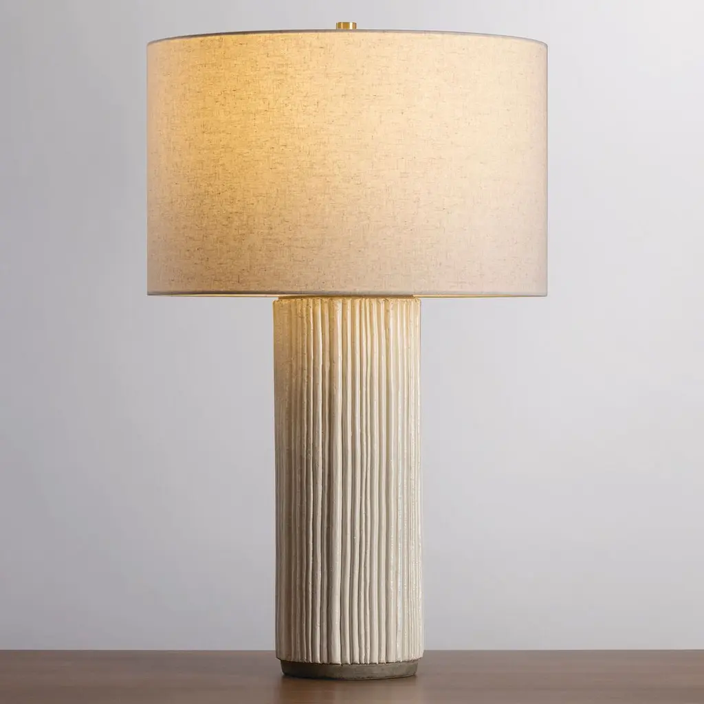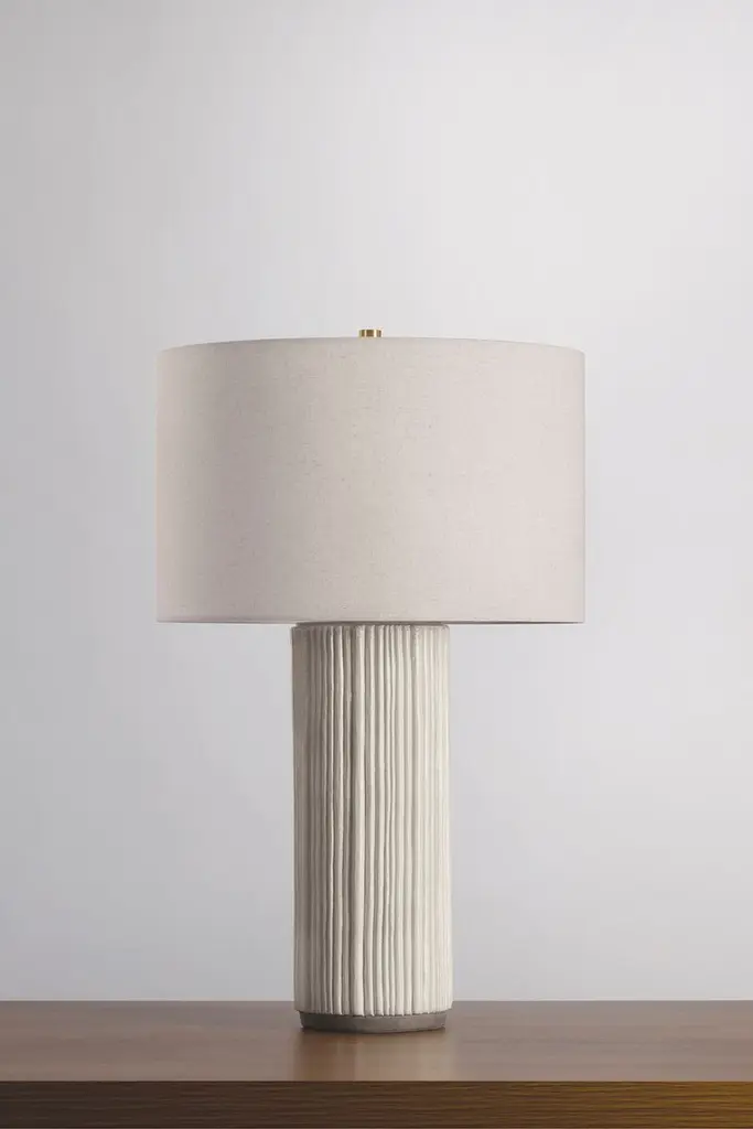 A classic mid-century modern column lamp receives a contemporary update. The allover fluting of the ceramic base adds a layer of dimension to the straightforward silhouette. A large linen drum shade imparts a fresh, airy feel, while an Aged Brass finial and stem provide refined warmth.