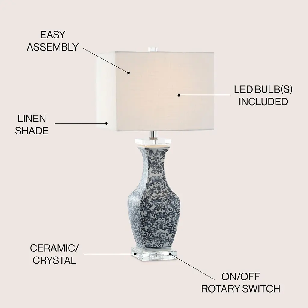 The intricate blue and white designs hand painted on the surface of this vase-shaped lamp base bring an element of chinoiserie chic to any home. In a more contemporary silhouette than the traditional ginger jar, the angles of the base are mirrored in the rectangular shade and crystal pedestal. AT 28" high, this piece would make a lovely accent on a nightstand or in a living space.