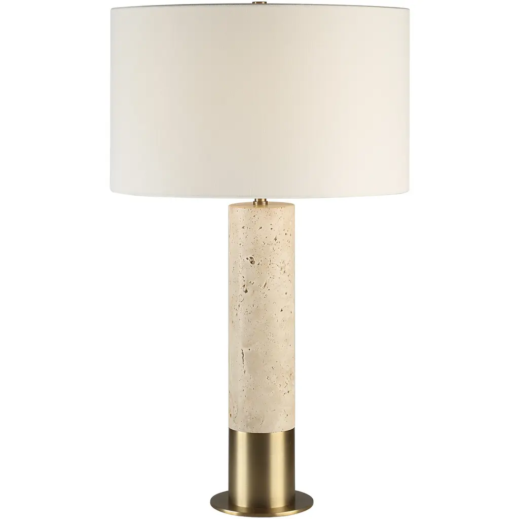 In a beautiful marriage of travertine and antique brushed brass, this table lamp delivers a timeless aesthetic thats a great fit for transitional or contemporary interiors. Youll love how it elevates any space while filtering dimmable light through its ivory linen drum shade to create the perfect ambiance for every occasion.