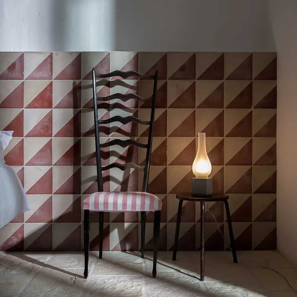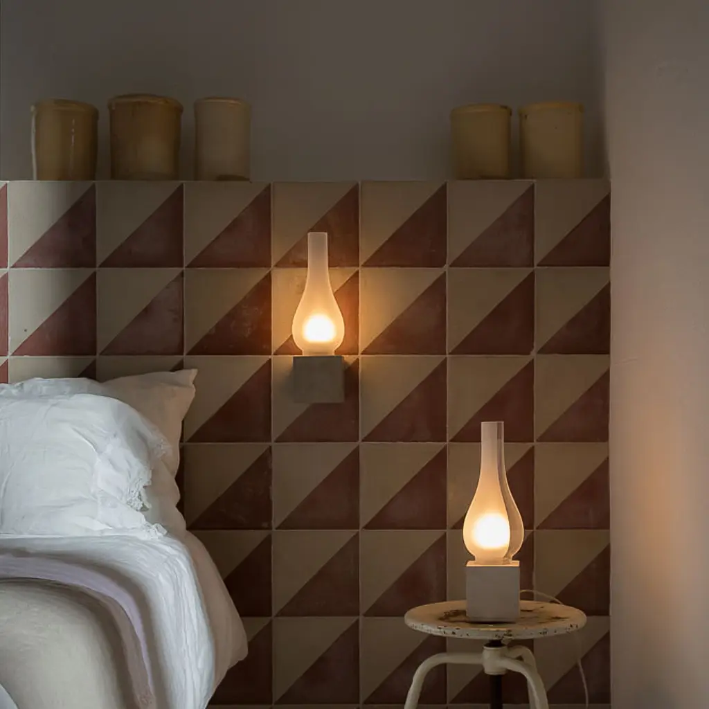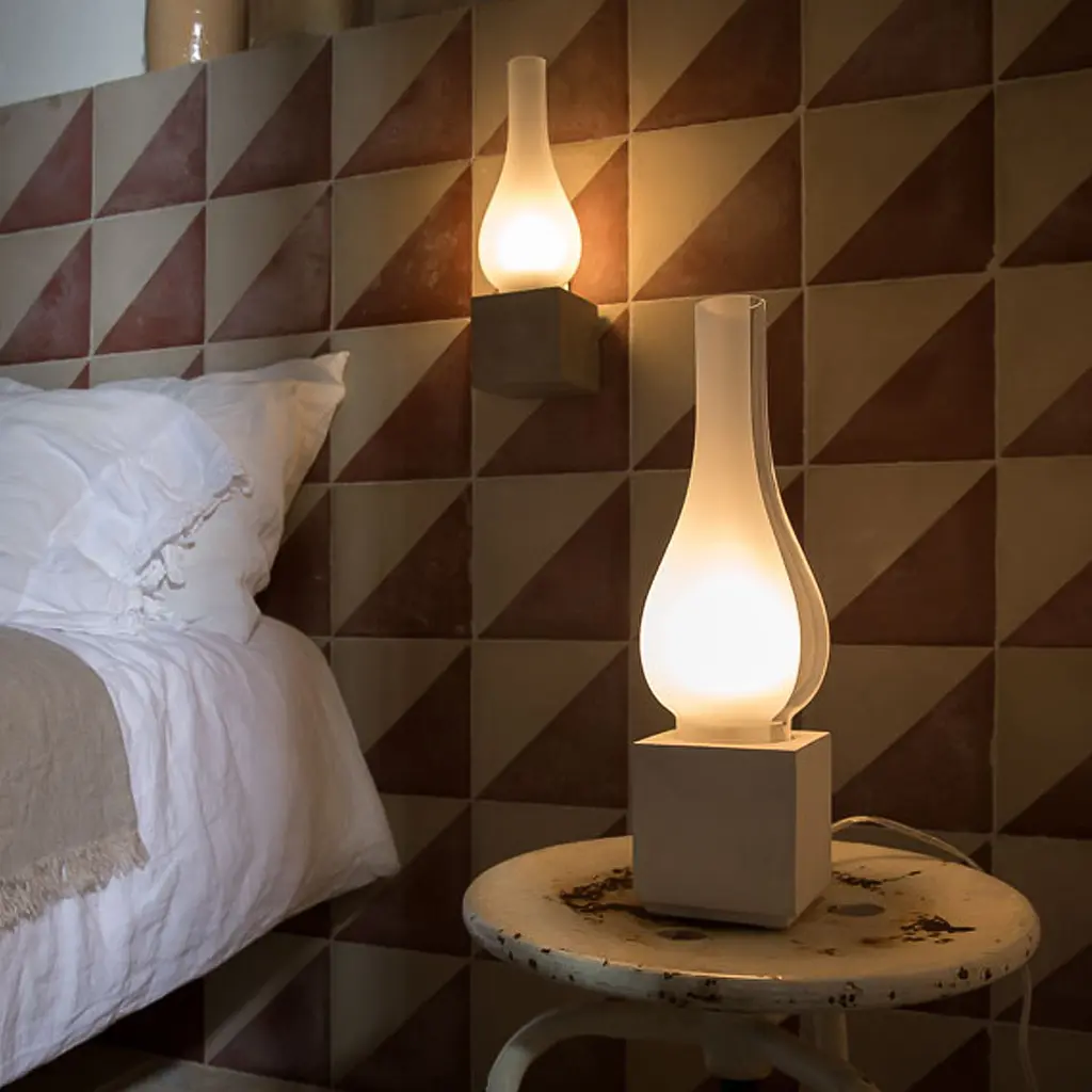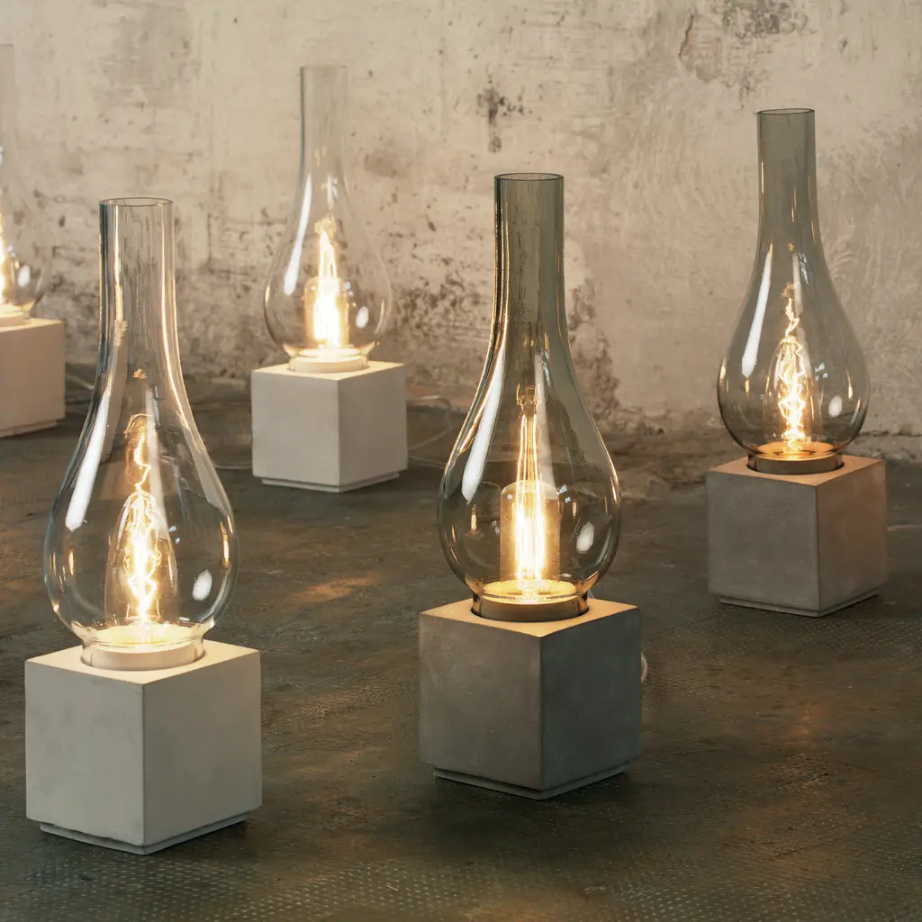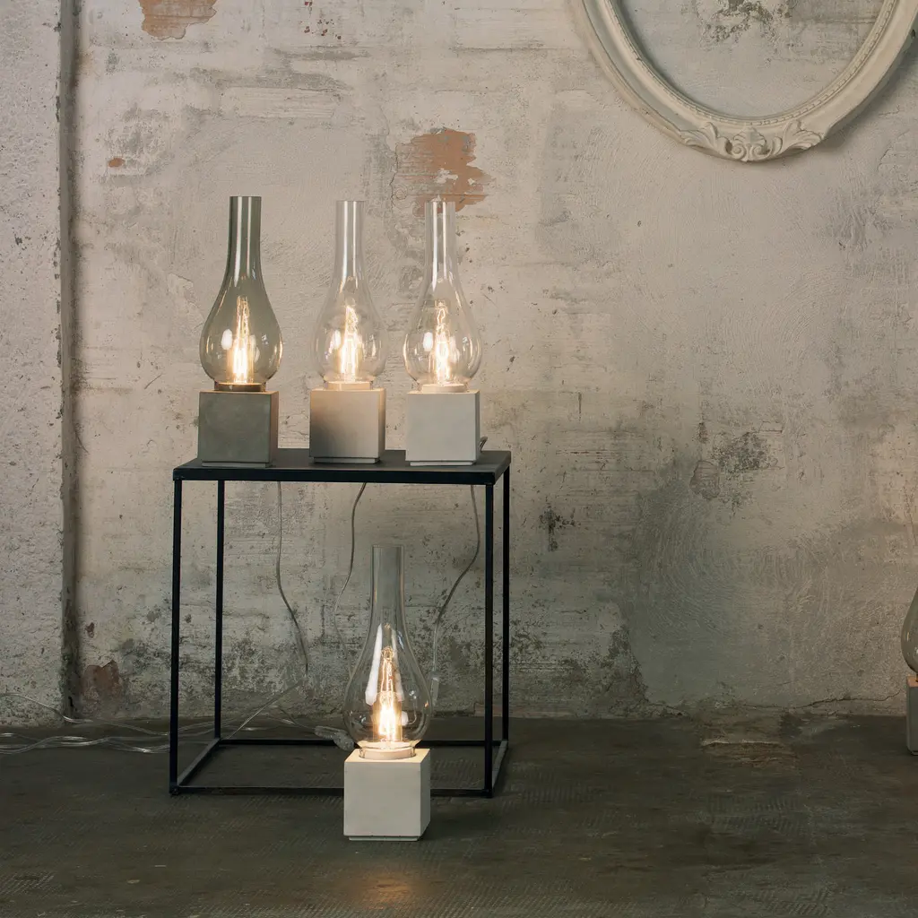 The classic oil lamp is reimagined with sleek, contemporary lines to suit modern spaces. This design evokes memories of ancient forms, blending contrasting materials harmoniously: a raw concrete or white cubic base paired with a lightweight glass diffuser available in clear, smoked, or satin finishes. The reflections mimic the flicker of a flame dancing in the wind.