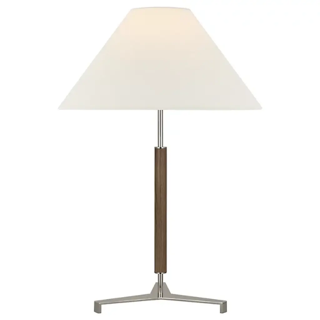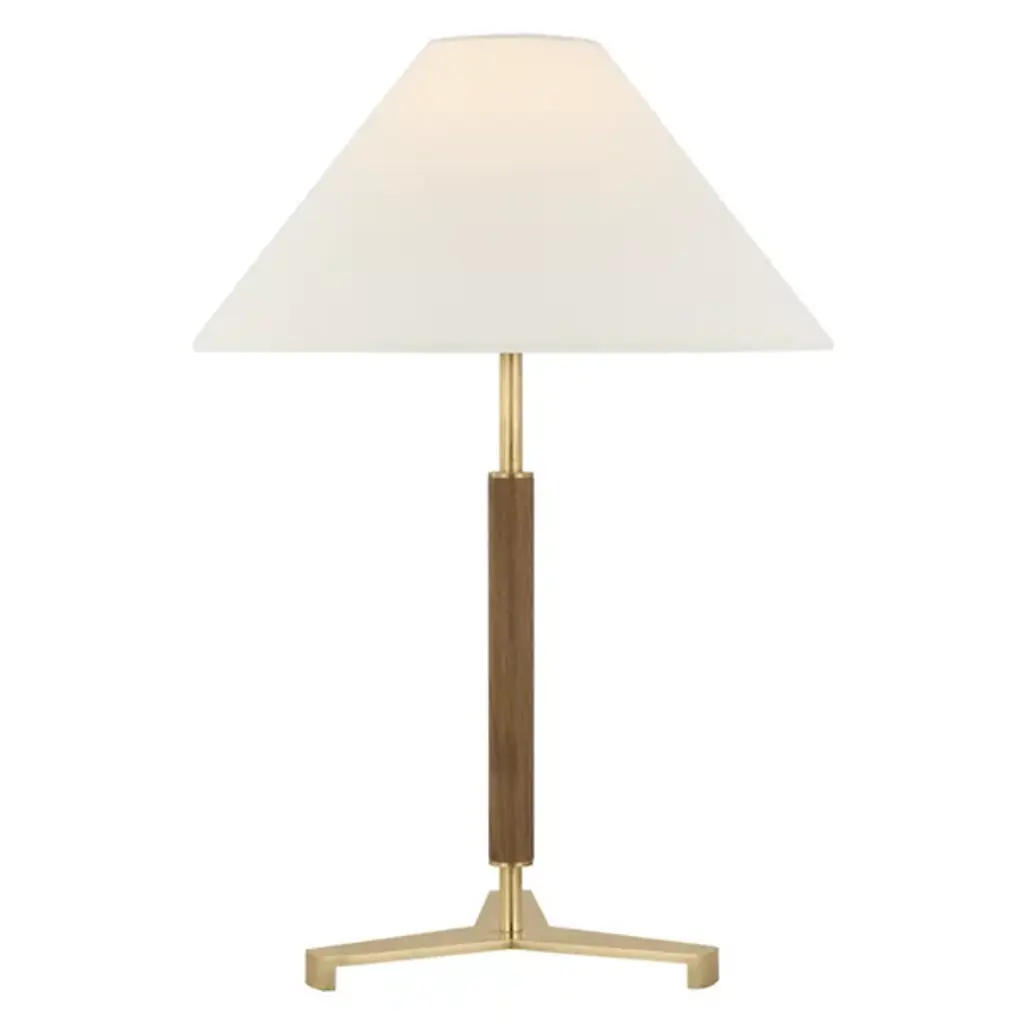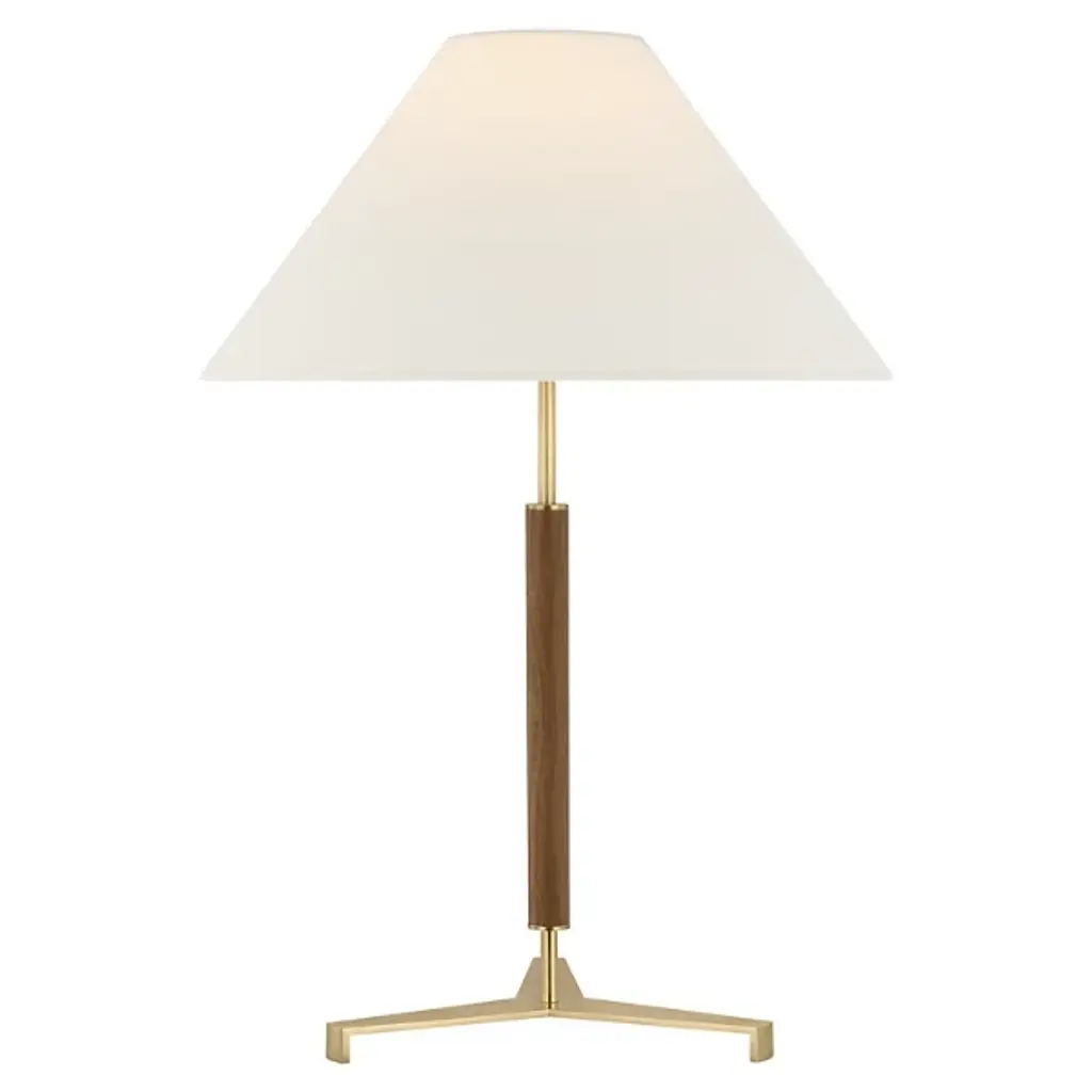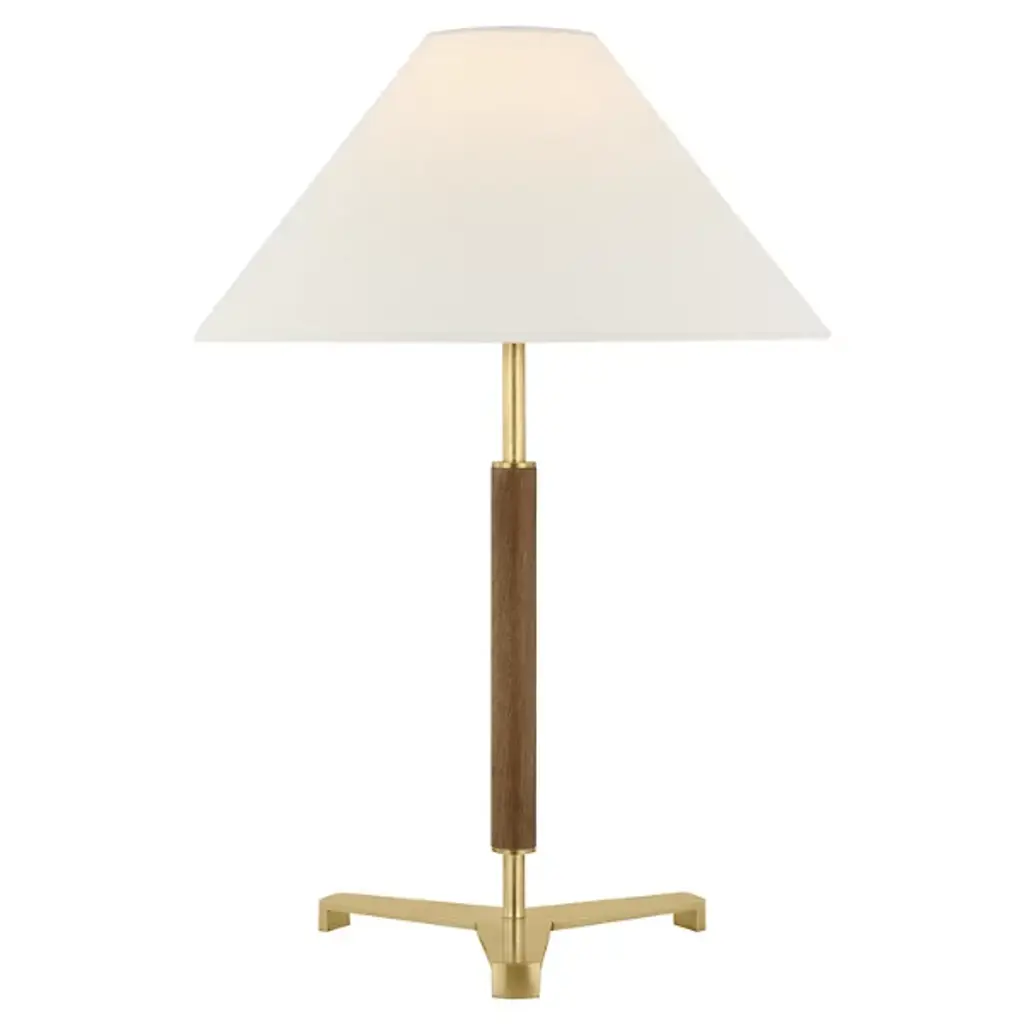 The Amaya Table Lamp from Visual Comfort Signature represents Ray Booth's thoughtful material pairing. The cylindrical wooden column adds natural warmth to the center of the design, while brass accents at the top, base, and distinctive tripod foot create structural interest. The poised proportions of this desk lamp make it ideal for executive desks, library tables, or beside drawers where its architectural presence can dialogue with other fine furnishings.