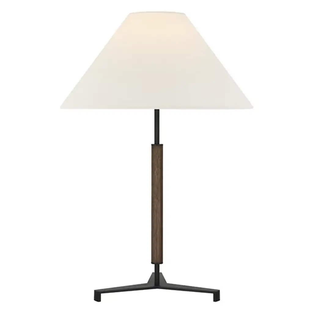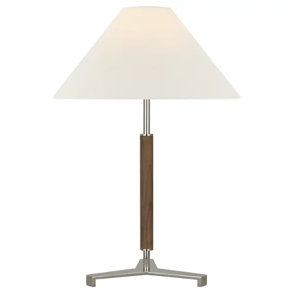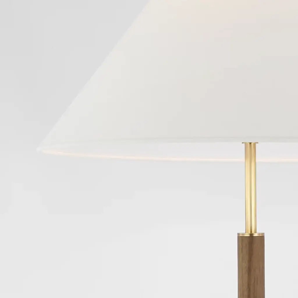 The Amaya Table Lamp from Visual Comfort Signature represents Ray Booth's thoughtful material pairing. The cylindrical wooden column adds natural warmth to the center of the design, while brass accents at the top, base, and distinctive tripod foot create structural interest. The poised proportions of this desk lamp make it ideal for executive desks, library tables, or beside drawers where its architectural presence can dialogue with other fine furnishings.