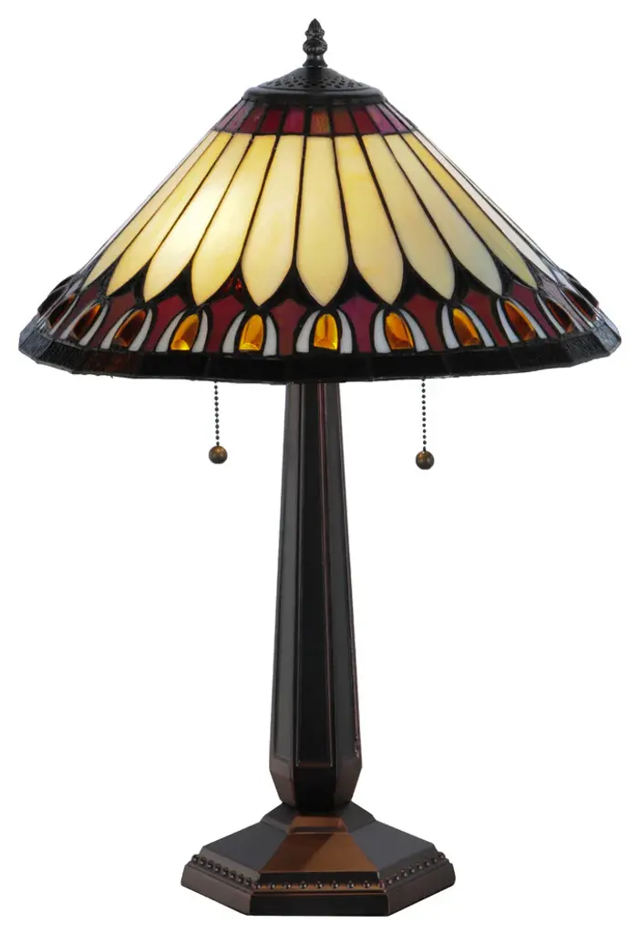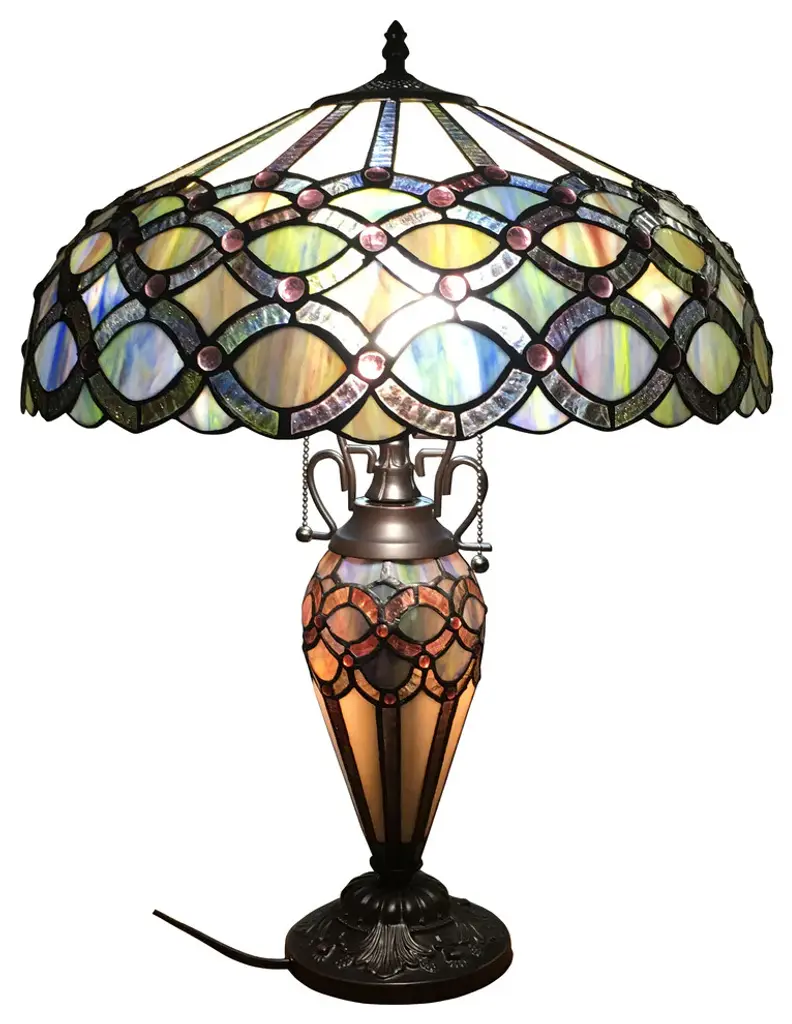 This Ambrose 2-Light Lamp draws inspiration from Victorian collections with ornate handcrafted details. A collage of 363 glass pieces, this table lamp is truly a work of art. Whether you choose to display it proudly on an end table in your living room or place it on your nightstand for an exquisite touch, the Ambrose 2-Light Lamp will shed warm light on your space with style.Dimensions: W 16.54" x D 16.54" x H 21.9"Materials: Glass, resin, metalPull chain switchRequires 2 100-watt max E26 Type A Bulb (not included)Indoor use onlyDue to the handcrafted nature of this lamp, exact color of glass pieces may varyFirst photo shows lamp with the light onUse a soft dry cloth to clean the shade