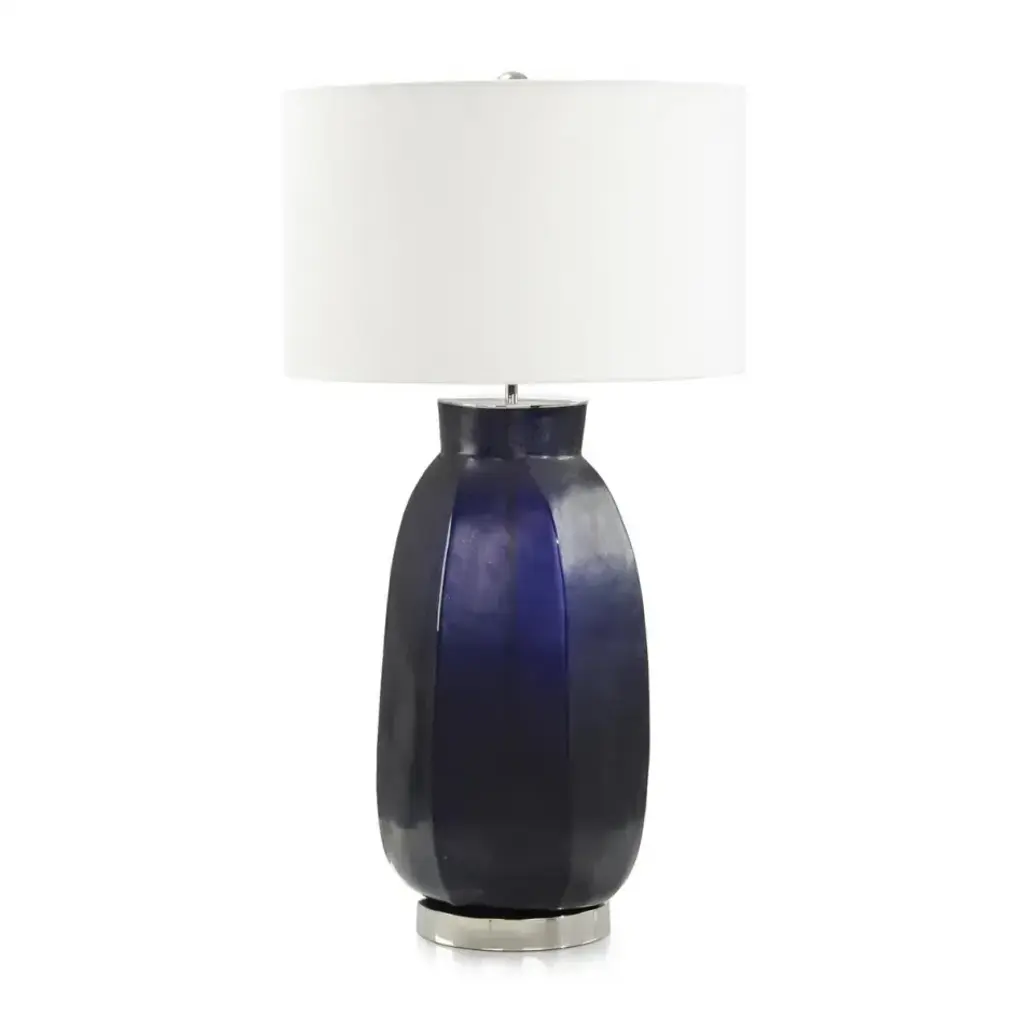 The Ambu Table Lamp features a strikingly dark midnight blue color, returning a gorgeous cerulean shine when under strong illumination. A robust body of hand-blown glass communicates a human element to the piece, which beautifully juxtaposes metallic elements from the rounded base, as well as the matching neck accent and finial, crafted from brass in a polished nickel finish. Metallic motifs from a polished nickel finish in the brass base, neck accent, and finial, provide gorgeous juxtaposition to the human element present in the robust body of mouth-blown glass.