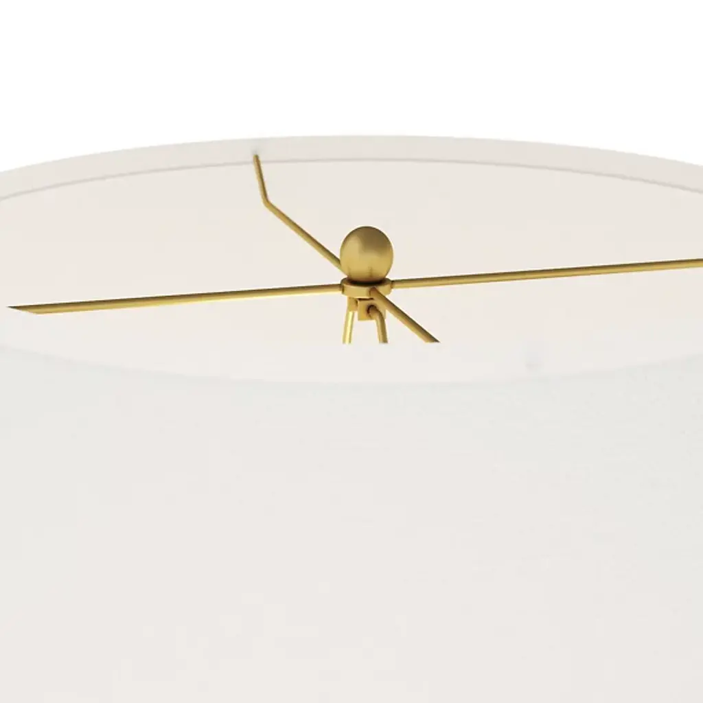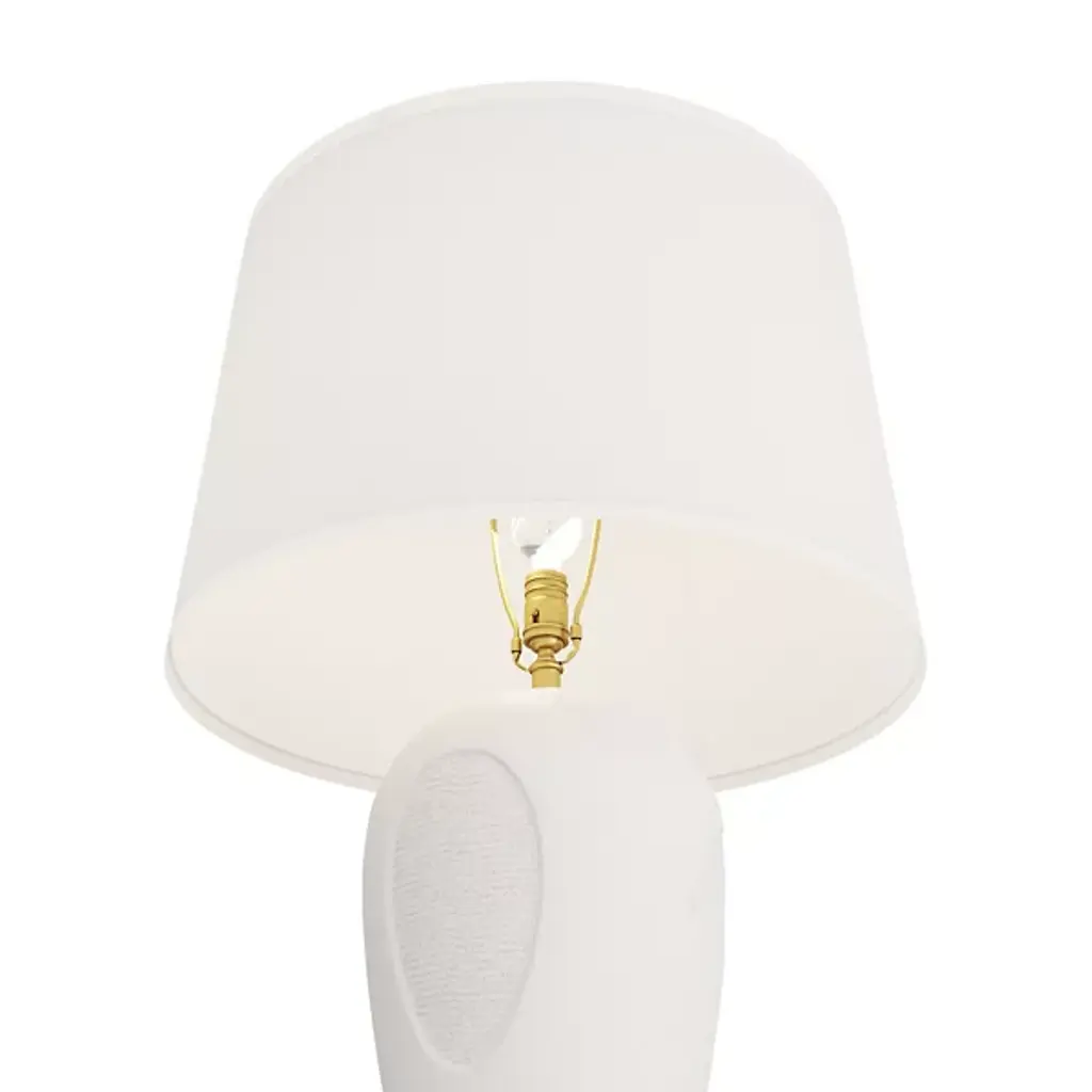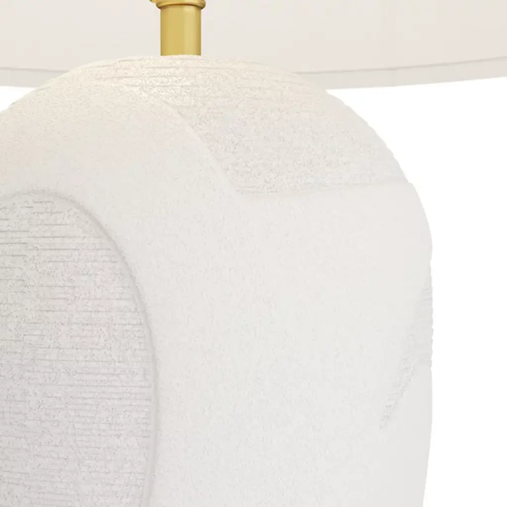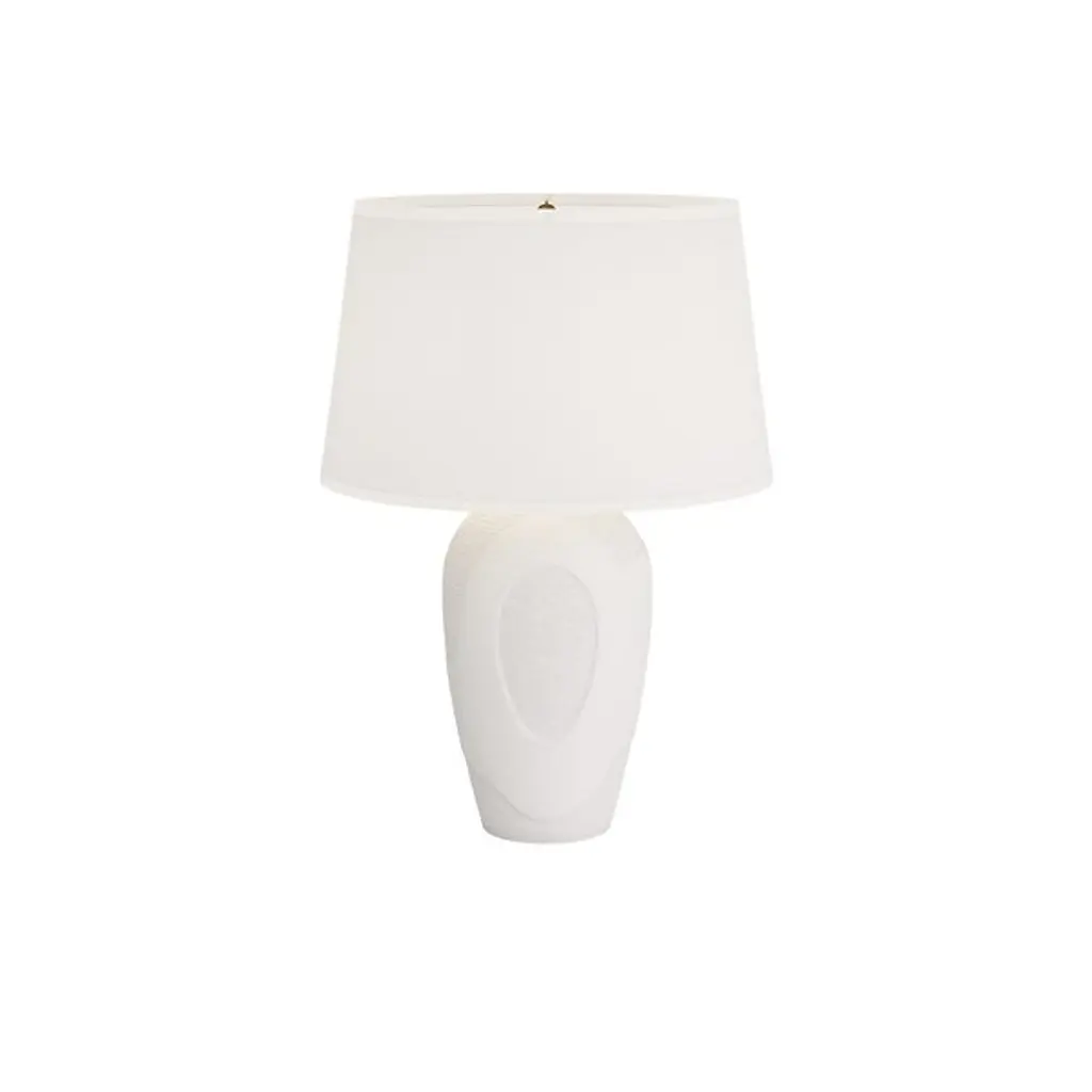 The Amelia Table Lamp from Arteriors embodies an organic aesthetic, featuring a porcelain base that artfully contrasts rough and smooth patterns, captivating both the eye and touch. The monochromatic bas-relief pattern, glazed in matte white, harmonizes with a matching drum shade of off-white linen lined in cotton. Enhanced with antique brass hardware and a taupe cloth cord, it has a three-way rotary switch. This lamp effortlessly combines tactile allure with visual charm, creating a serene presence in any space.