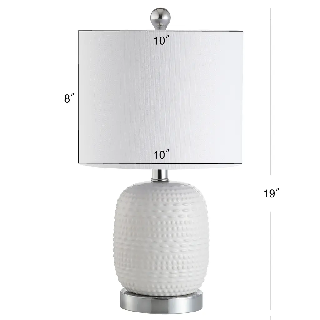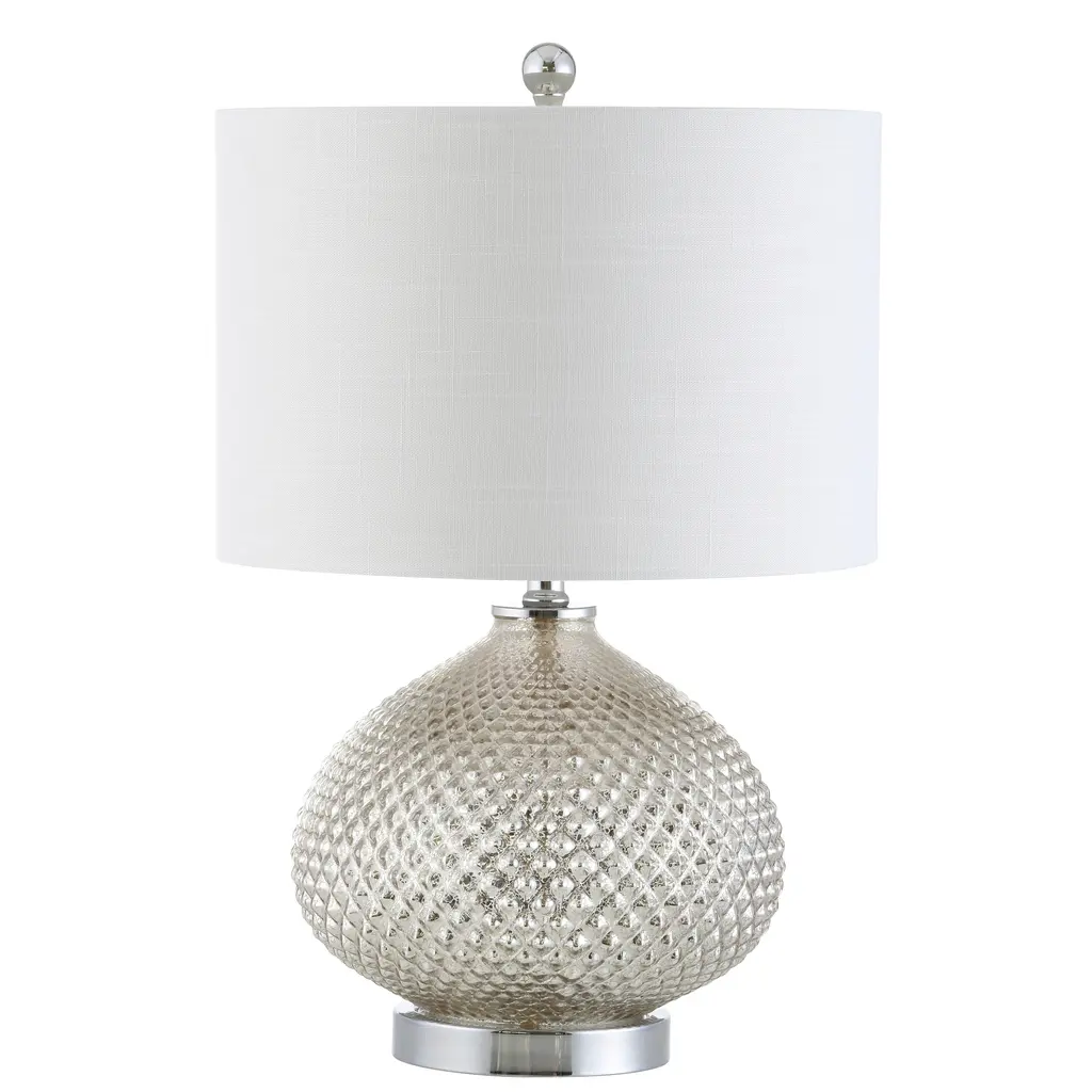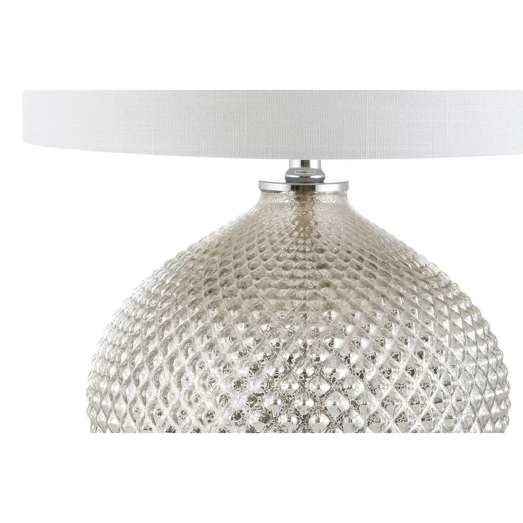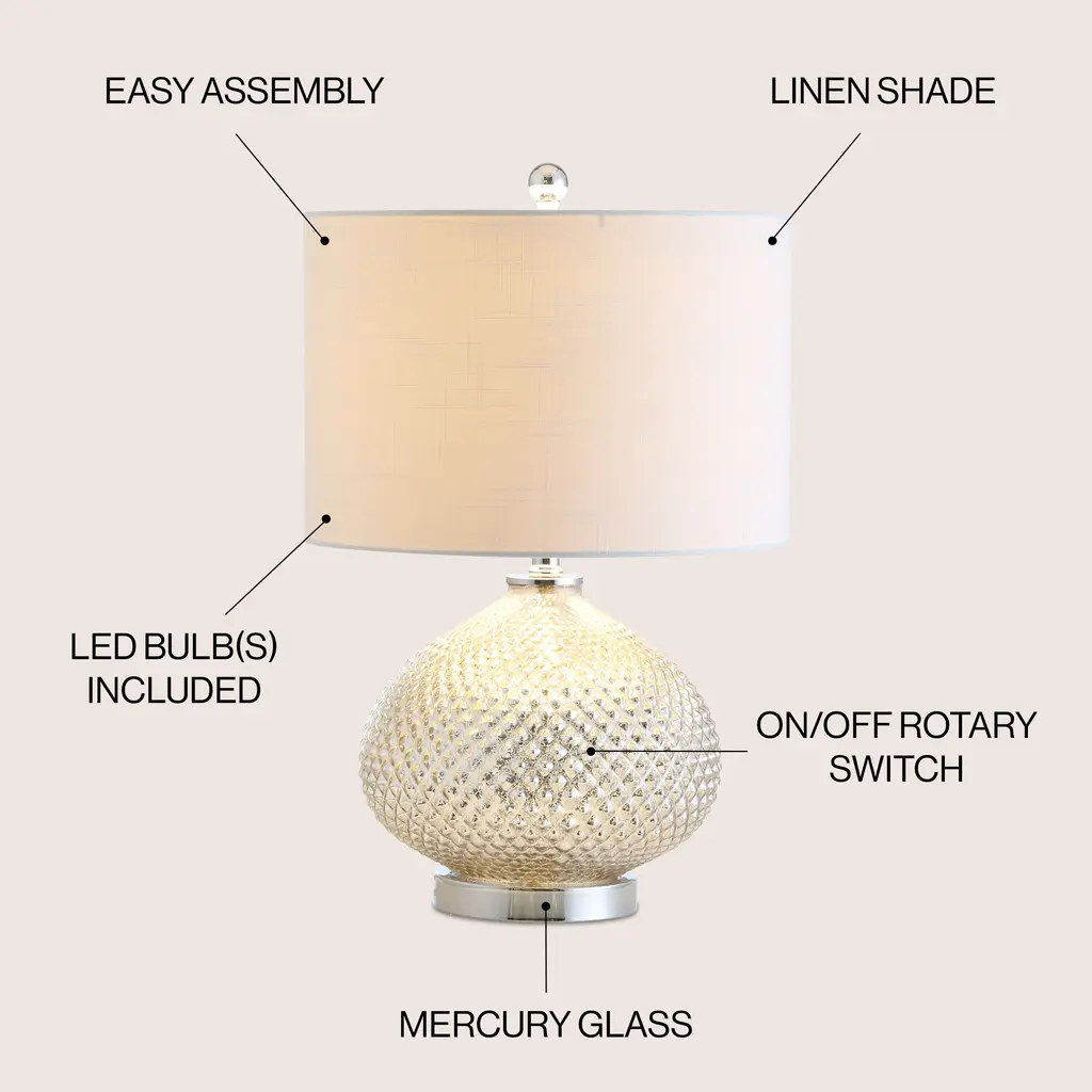Bring casual elegance to a side table or nightstand with this beautiful mercury glass table lamp. Subtly glam and contemporary, this lamp boasts a textured mercury glass body with a softly curved silhouette. A clean shade ensures true and diffused illumination that's perfect for creating ambiance and illuminating space in any room.Features:Dimensions:About us:You see a lamp.We see a decorative work of art.A perfectly curved shade casts a dramatic shadow on a floor. A silk cord you never want to hide. LED lightbulbs: as easy on the environment as they are on the eyes. The JONATHAN Y Lighting collection considers every detail from impeccably sourced materials to designer styling. And our prices are so attractive, we've transformed a functional necessity into a fashion accessory.JONATHAN Y Lighting - a fashion revolution in home decor.