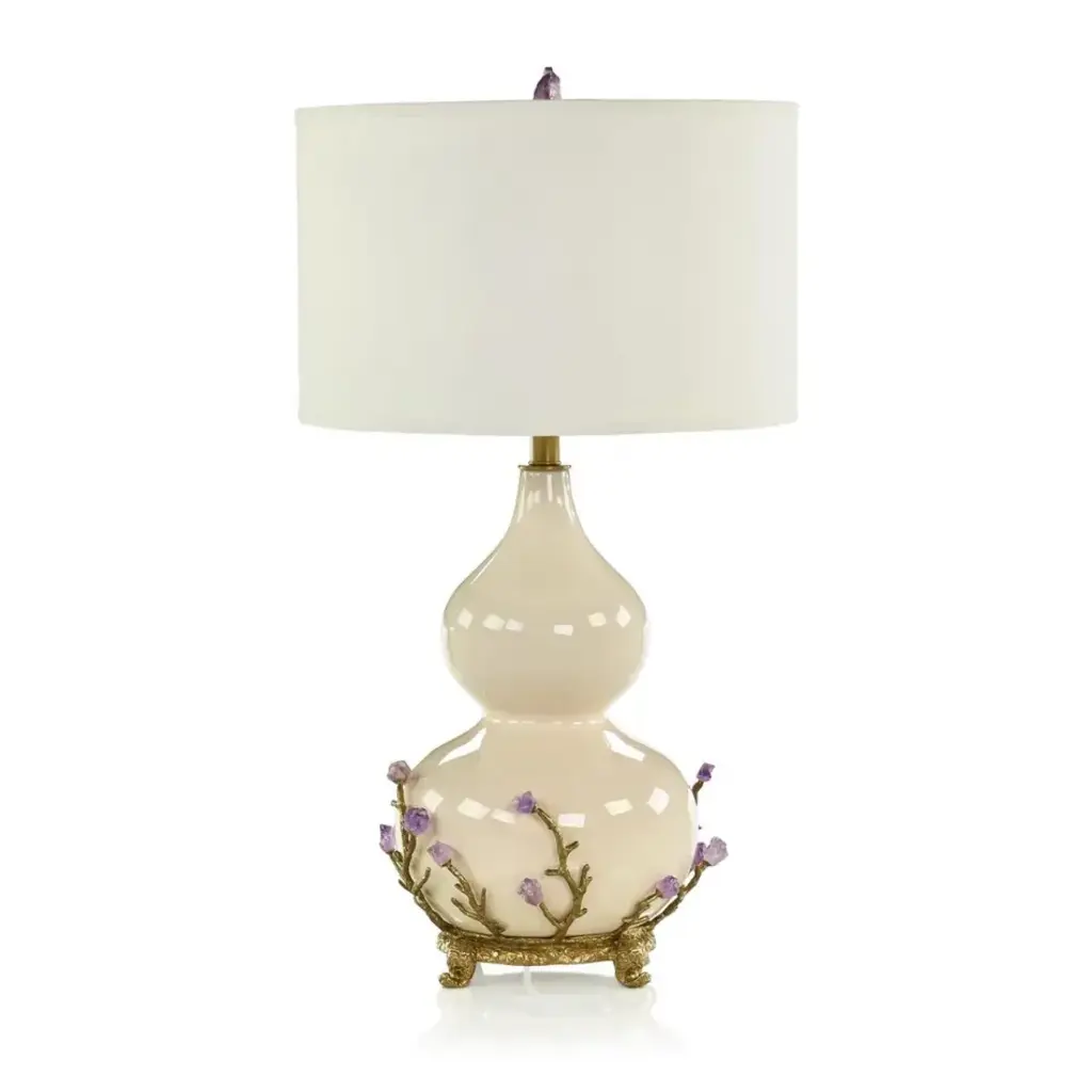 The Amethyst Gardens Table Lamp is a stunning, naturally inspired design statement. This glazed porcelain lamp with a curvaceous white body is gently nested within a beautiful brass base, shaped to resemble intricately detailed branches with amethyst embellishments. The look is completed by brass hardware, an amethyst cluster finial, and a white drum shade.