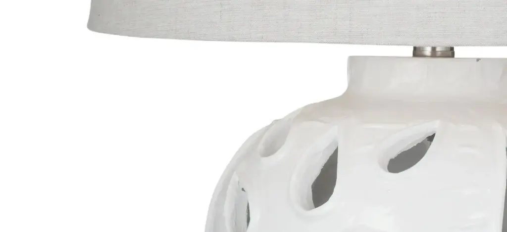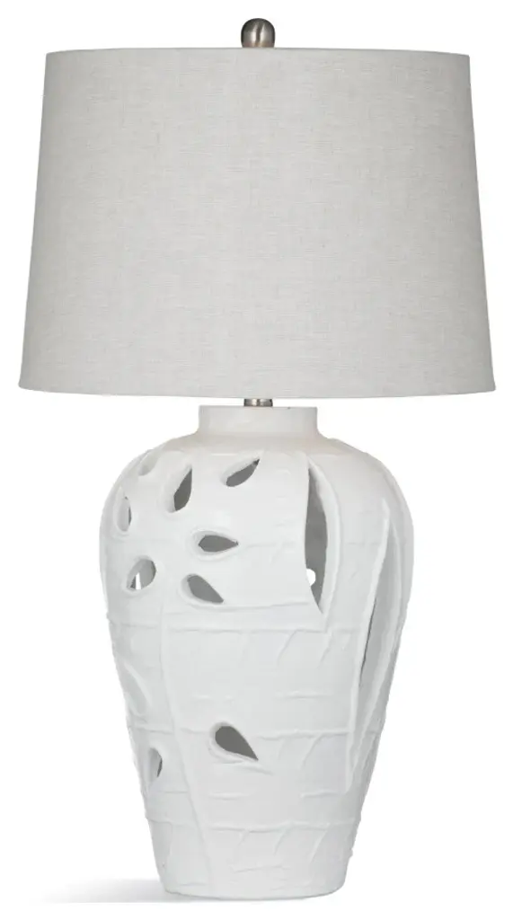 The Amur Table Lamp is crafted of resin in a matte white finish. The lamp body features a textured cutout floral design for a boho style. The table lamp is completed with a tapered drum grey linen tapered shade and brushed silver finial.