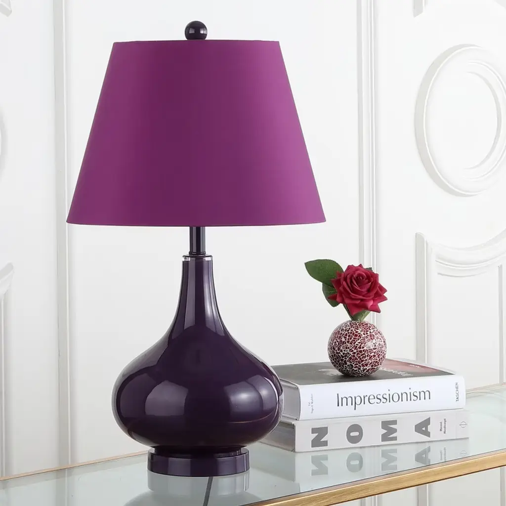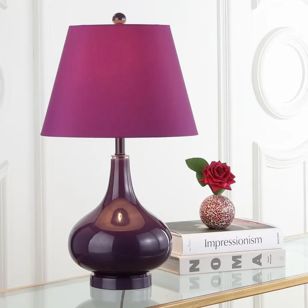 Elevate your space with the 26 inch table lamp, boasting a rich and bold dark purple hue. Crafted from stunning glass and metal, this lamp exudes a modern and artistic ambiance. Its graceful silhouette is complemented by a hardback linen shade, offering an understated elegance that fits seamlessly into any decor. Whether placed on a bedside table or a living room console, this lamp adds a touch of sophistication and warmth. The chic design and smooth finish create a striking visual appeal, making it a delightful focal point in any room. Illuminate your environment with style and flair, enhancing your homes charm and character.