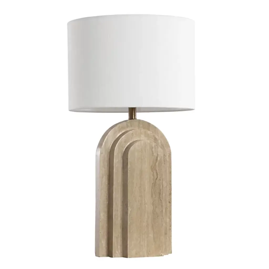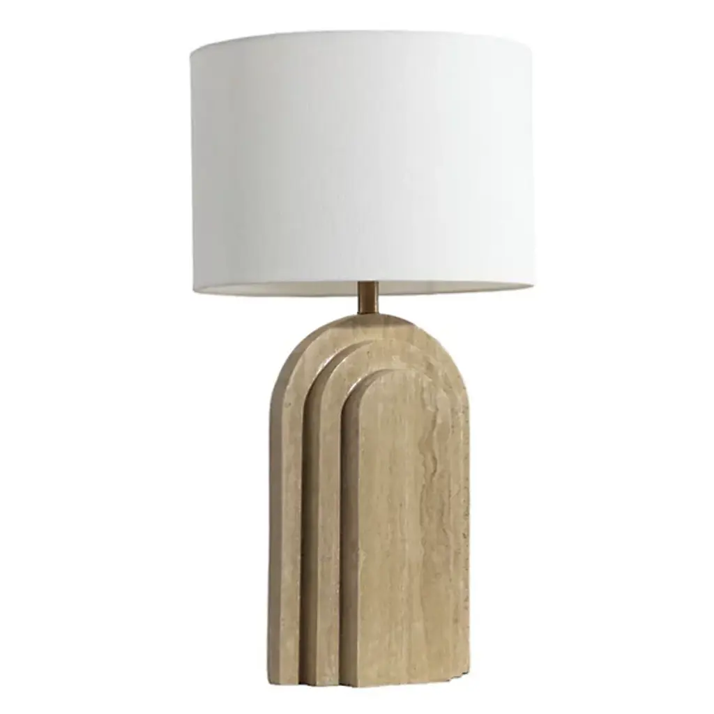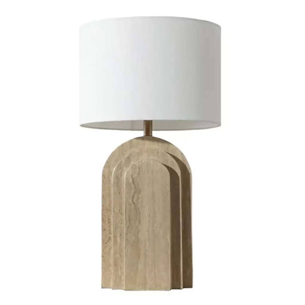 The Ancona Table Lamp by Sunpan brings a sense of visual harmony with its balanced proportions and alluring rustic aesthetic. Handcrafted from natural travertine, this piece features graduated tiers of smooth curves and clean lines, forming a striking geometric base. Topped with a cream linen shade, this lamp blends contemporary design with a tactile, natural warmth, making it a memorable addition to any space.