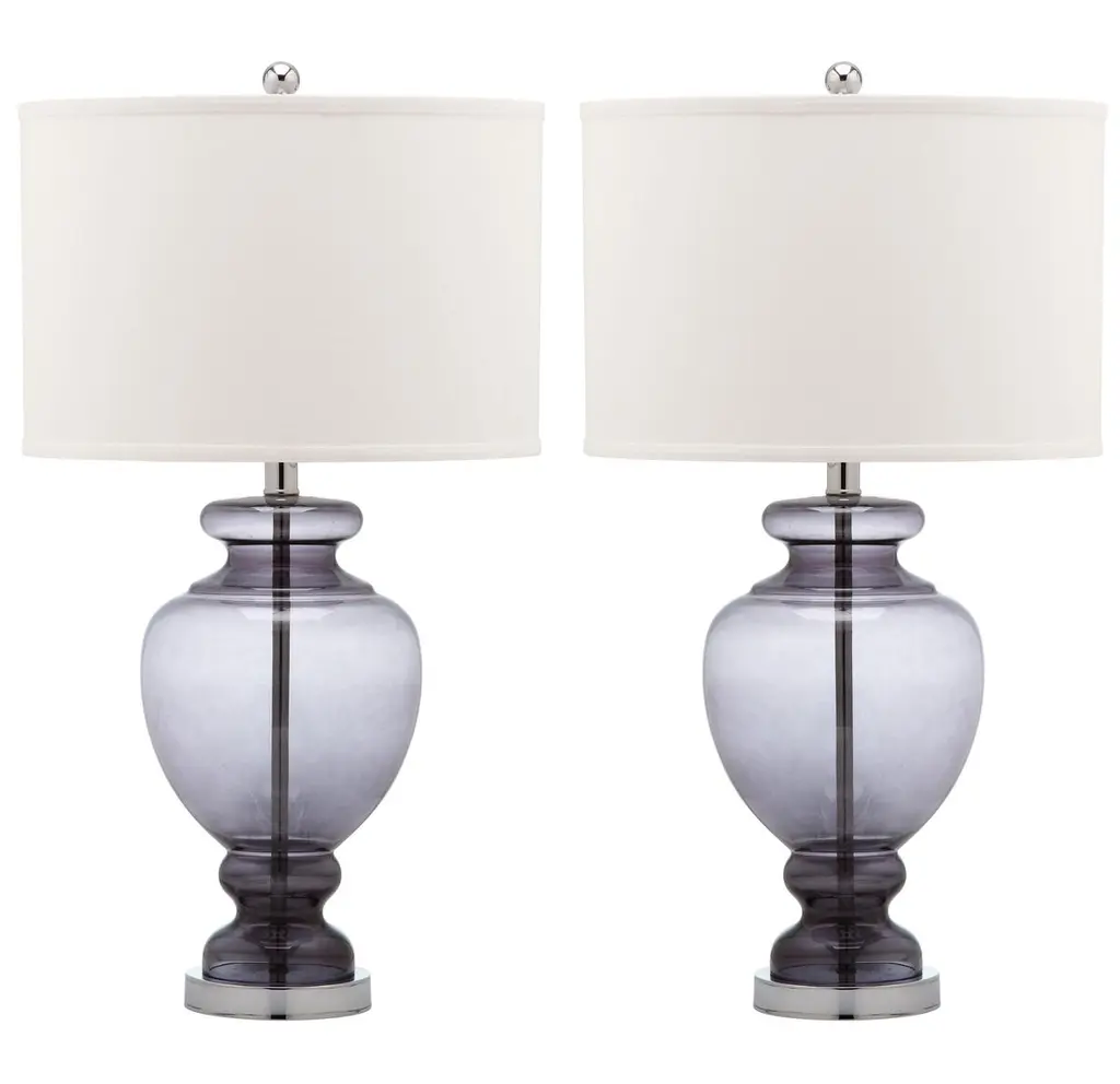 Standard Lamp Specifications for #GM843:Product Type: Table LampHeight: 30Finish: Gunmetal with SmokeConstruction: Steel/GlassSocket: (1) Aluminum 3-way E26 Med. Base Type A 150W Max socket(s) - Bulb(s) not incSwitching: (1) 3-way turn knob switch(es) located on the socket.Cord: 6.5" long (from base) brown SPT-2 cord set with a 2 prong polarized plug.UL/CUL and/or ETL listed: YesHarp Size: 9.5 inches (including the saddle)