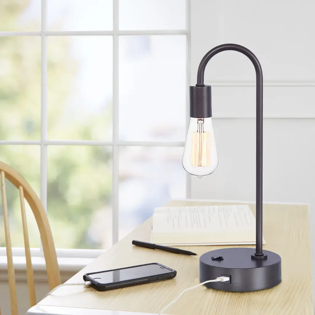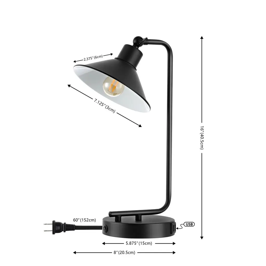 Illuminate your space with the sleek and chic presence of our Anden table lamp. Our streamlined lamp elevates any corner with its sophisticated, mid-century appeal. The slender arm and flared cone shade accentuate the chic presence of the lamp. Its pivoting metallic shade helps in directing a warm and pleasant glow to your desired area. Our table lamp offers sleek style and a dose of functionality to your reading nook, bedside, or home office. It includes a USB port to keep your devices charged and ready.