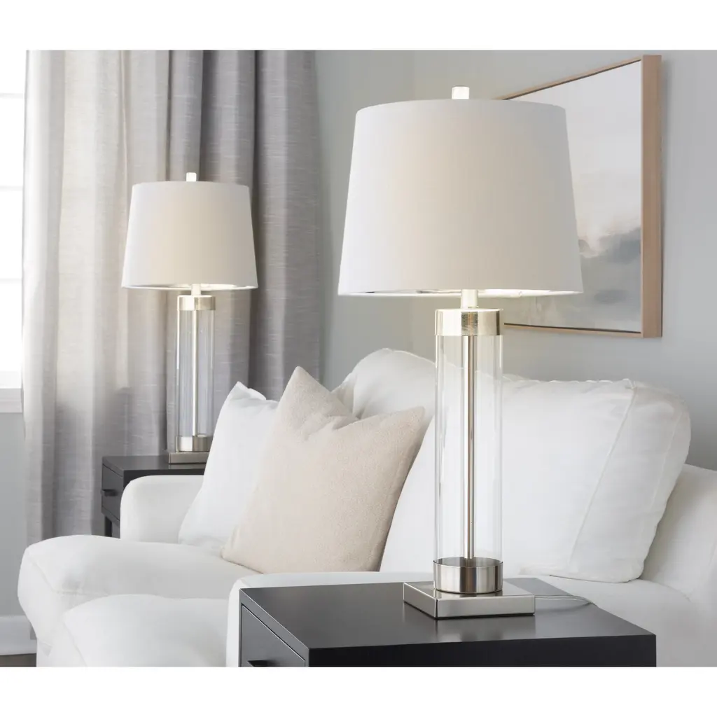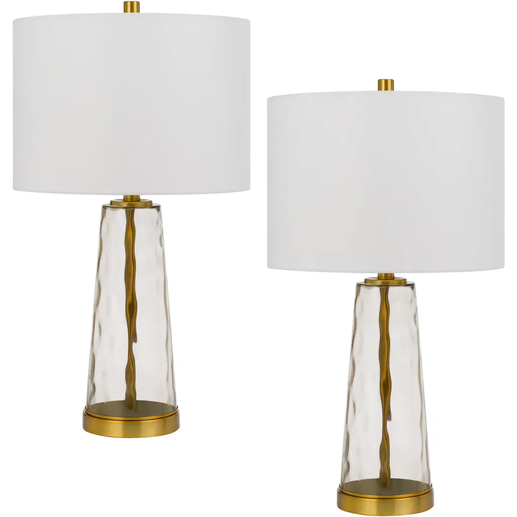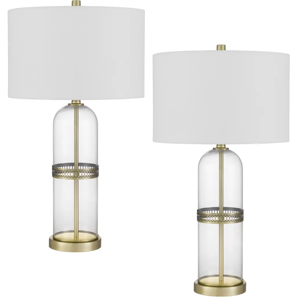 Introducing the Anders 22.25 inch clear brass glass table lamp set of 2, where form and function come together in perfect harmony. These lamps offer a sophisticated touch to any living space with their clear glass body and brass accents that create an aura of modern elegance. Their sleek design complements both contemporary and classic interiors, making them a versatile addition to your decor. Each lamp is fitted with a fabric shade that gently diffuses light to create a warm, inviting ambiance, ideal for relaxation or intimate gatherings. Perfectly sized to fit on side tables, bedside stands, or office desks, these lamps are designed to provide an appealing visual element without overwhelming the space. Enhance your environment effortlessly with the Anders lamp set and let its subtle charm take center stage. Its tasteful aesthetics and practical function make this a delightful choice for those who seek understated beauty in their home decor.