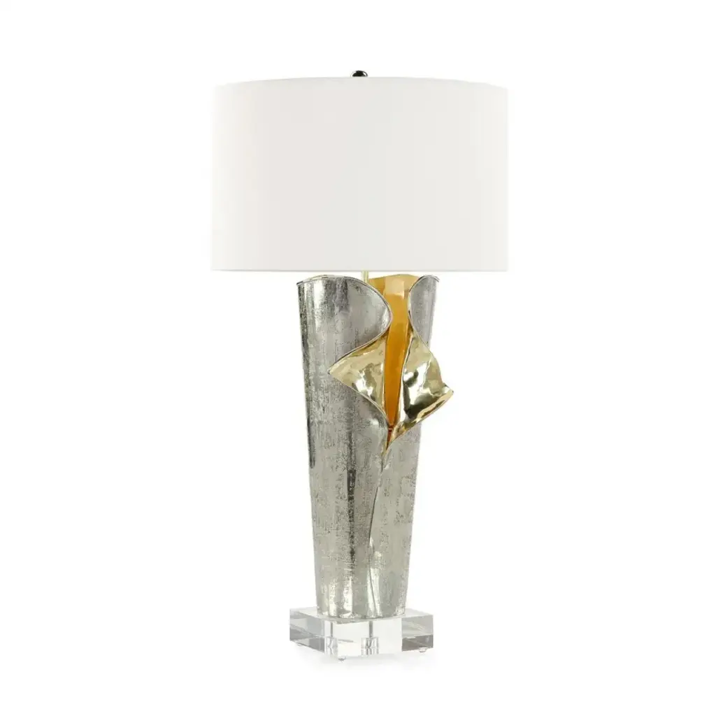The Andiamo Table Lamp is a stylish home accent that elevates a space through artistic forms and opulent tones. This gorgeous metal lamp features folds that evoke the look of fabric, showcasing a Polished Brass interior juxtaposed against textural Nickel on the outside. A square base of clear acrylic provides hard angles and clear tones to the curvaceous, metallic piece.