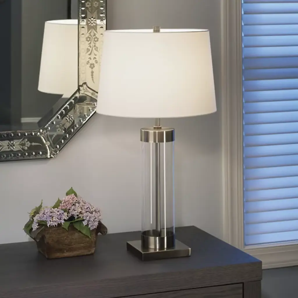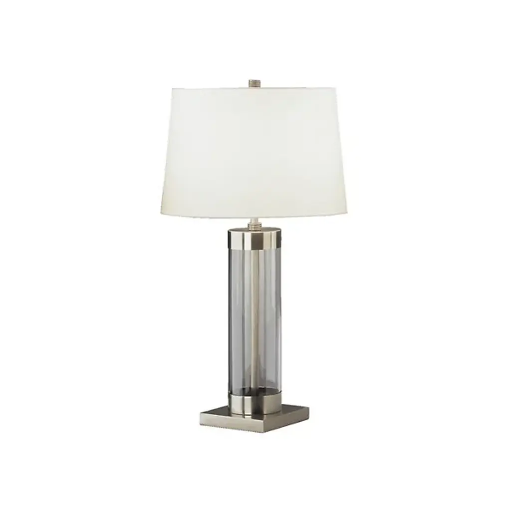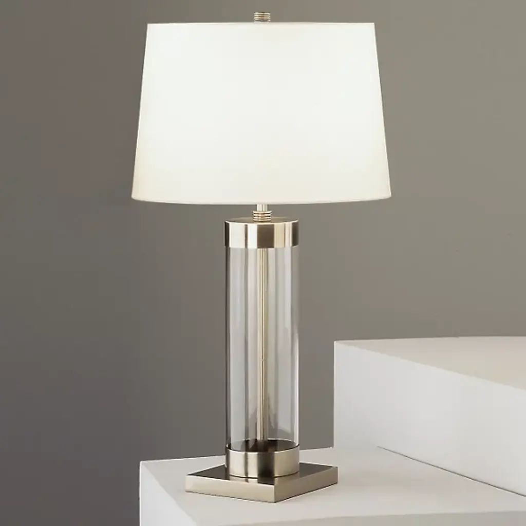 The remarkable Andre Table Lamp from Robert Abbey plays on transparency and uniformity within its design. A clear glass cylinder houses the fixture's metal skeleton, creating visual depth, and an off-white cotton shade with rolled hem adds a final tailored touch to the lamp. The product’s shape is simple, and its style is sleek and modern, making it ideal for a variety of different settings and established decors. It features a full range dimmer, so you can accurately select the correct mood you want for your space.