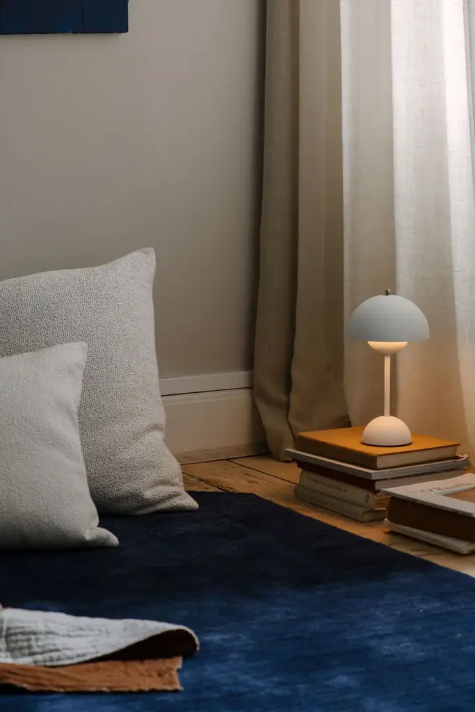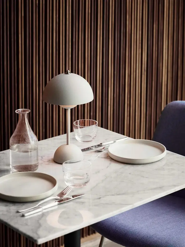 The Flowerpot, a vividly coloured lamp with a rounded pendant that hangs from the semi-domed upper shade, embodies the experimental attitude of Verner Panton. Slightly smaller in size than the table lamp version, and deliberately lightweight, the portable VP9 comes equipped with a USB charging cable. It is available in a wide range of contemporary colours and will bring a cozy atmosphere to indoor and outdoor settings.Production processThe base and the lamp shade are molded in polycarbonate (PC). The dimmer is made from steel.EnvironmentThis lamp is for indoors use only. It can be taken outdoors, but must be kept and stored indoors.MaterialPolycarbonate (PC), steelVoltage:Recharge input: 5.0V, 2ABatteryOperating time when fully charged: 10 hoursCharging time: 8 hoursReplaceable &Tradition battery. Can be purchased at &Tradition.Light Source & Energy Efficiency3W LED boardLight output: 104 lumenCRI: >90Colour temperature (Kelvin): 2700KLED life time: 50.000 hoursThe luminaire is compatible with bulbs of energy class A++ – A.Replaceable &Tradition light bulb. Can be purchased at &Tradition.Dimmability3 levels (100% – 50% – 20%)Charging CableMicro USB, 200cm / 78.7inCertificationsCE, CB, IP44, Class IIICleaning instructionsWipe the surface of the lamp with a soft, damp sponge or cloth, and wipe immediately with a dry cloth.