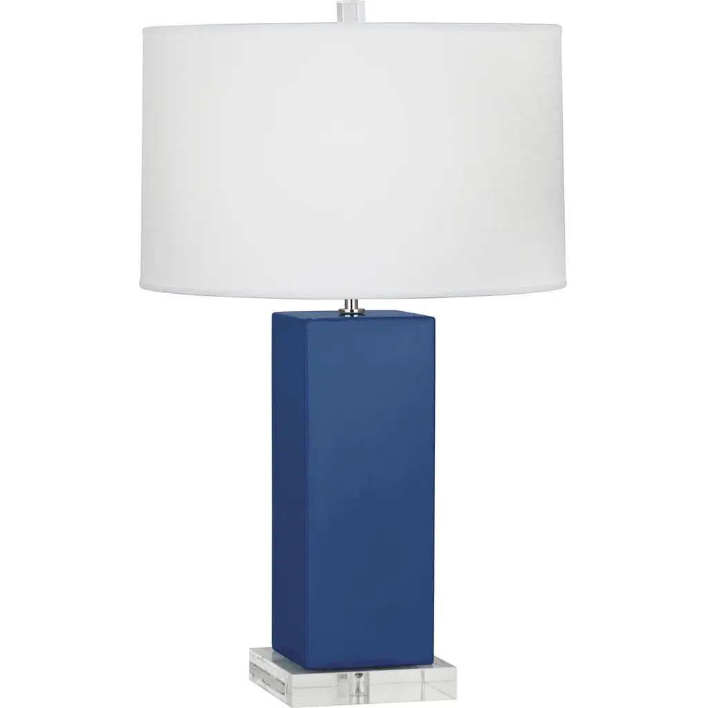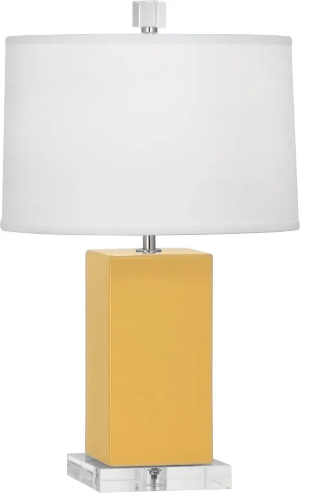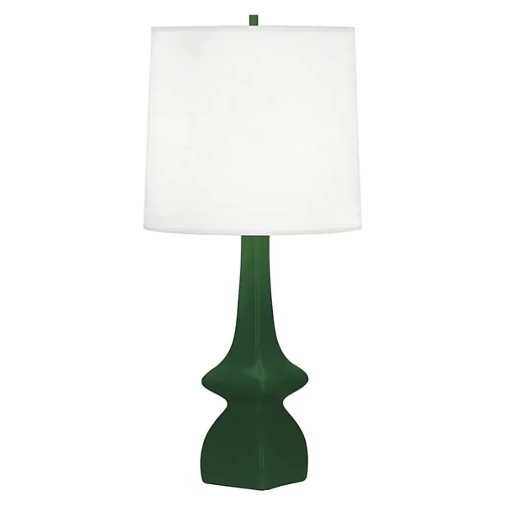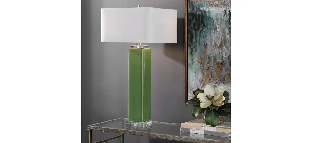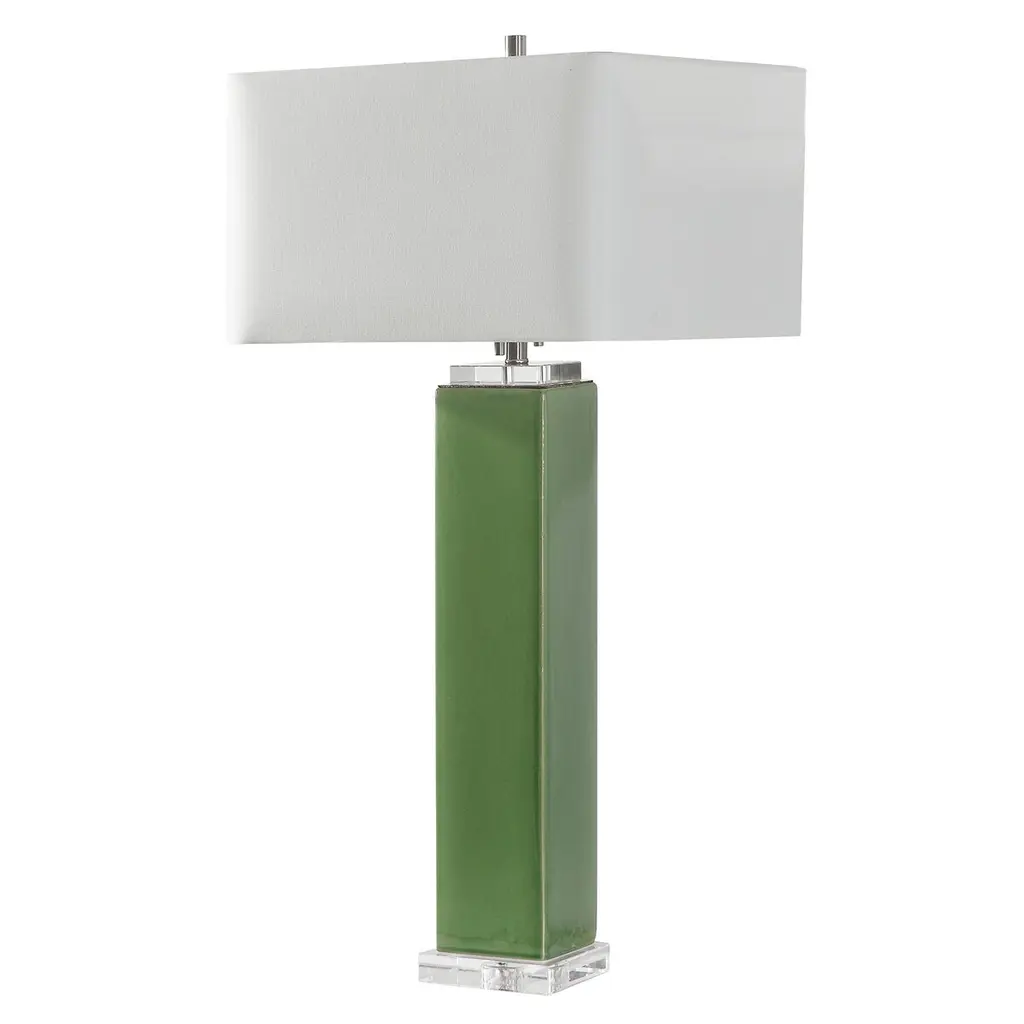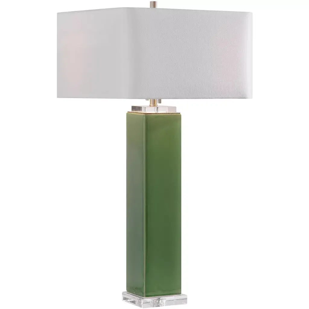 Finished in a striking tropical green glaze, this ceramic table lamp is accented by thick crystal ornaments and brushed nickel accents. The square hardback shade is a white linen fabric.