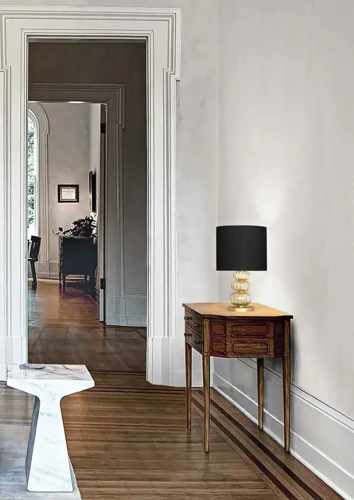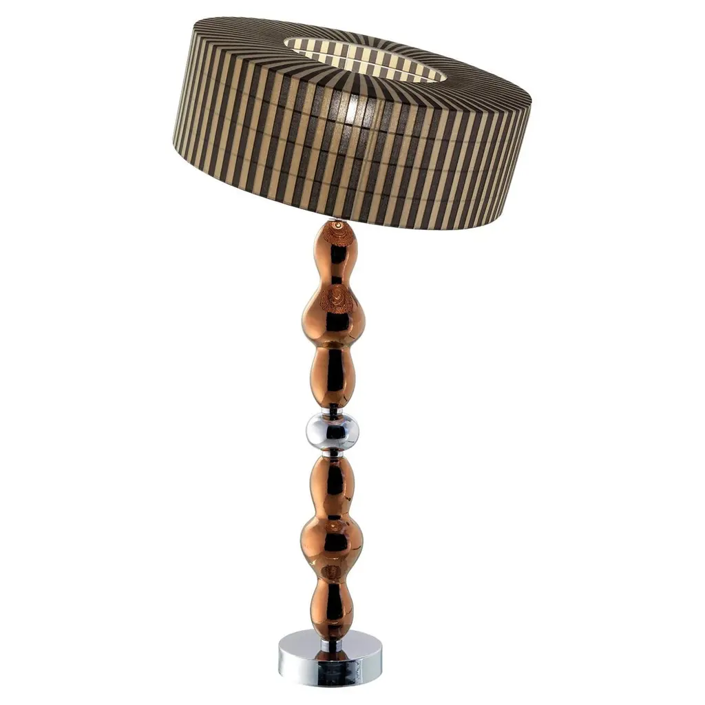 Angela is a light table lamp in blown glass and schirm, an object meticulously worked, selecting a range of metallic finishes, glass colours and precious details that make it unique and handcrafted.