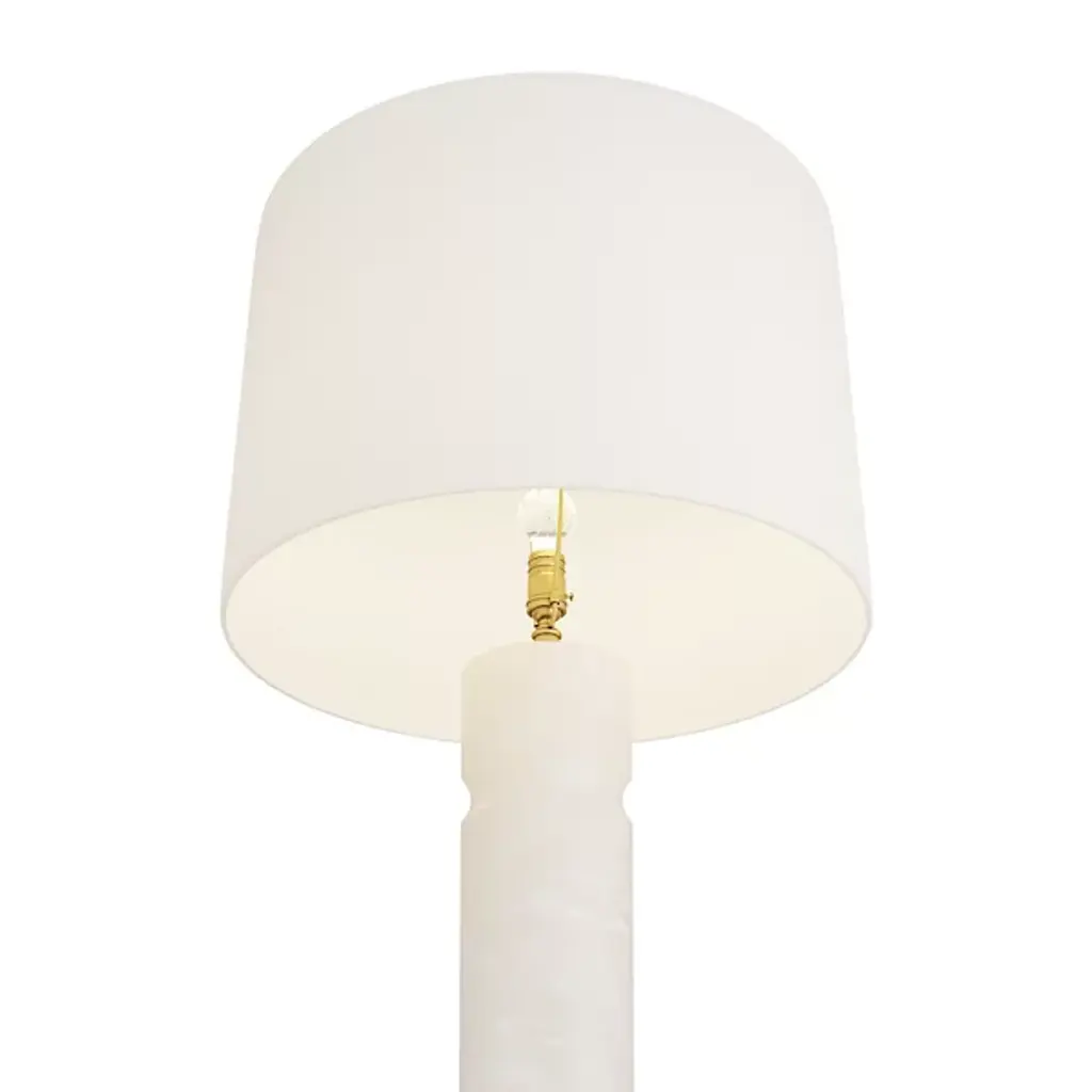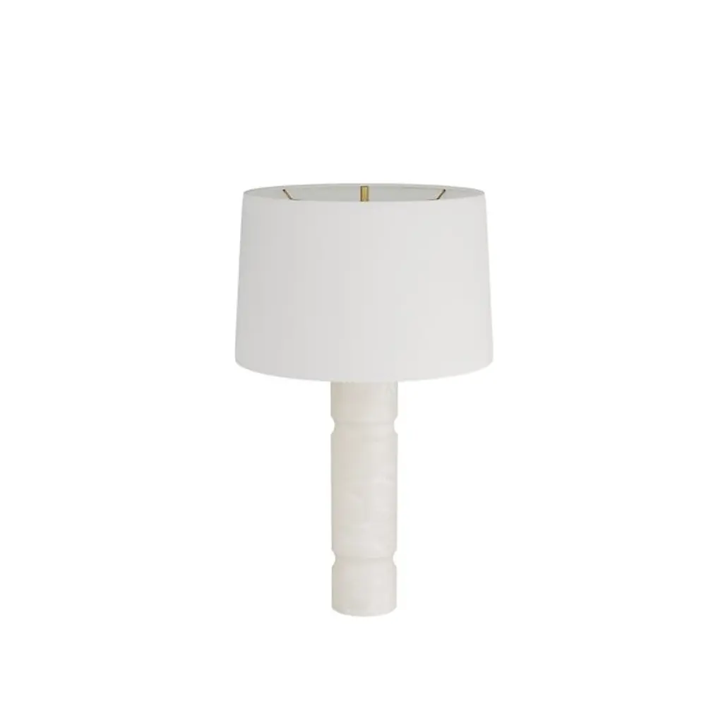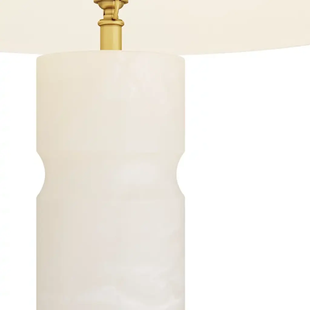 The Angelina Table Lamp from Arteriors will elevate your decor with understated elegance. Crafted from pristine white alabaster, this essential lamp brings a timeless sophistication to any setting. Its refined silhouette is complemented by a drum microfiber shade, lined in cotton, and adorned with antique brass finish hardware. The taupe cloth cord and three-way rotary switch add to its versatility, making it an ideal accent for desks or tables, seamlessly blending beauty with functionality.