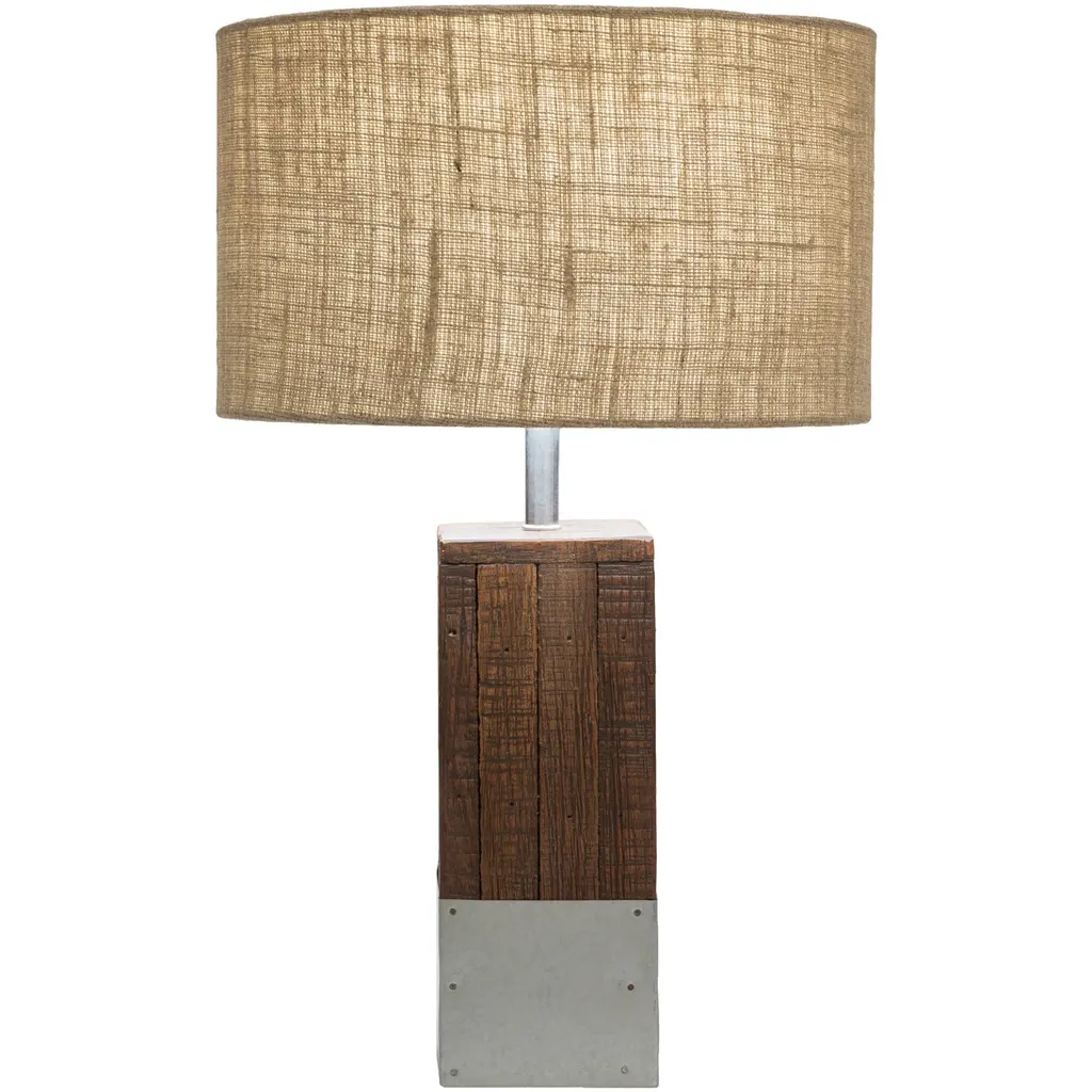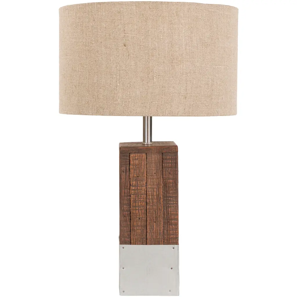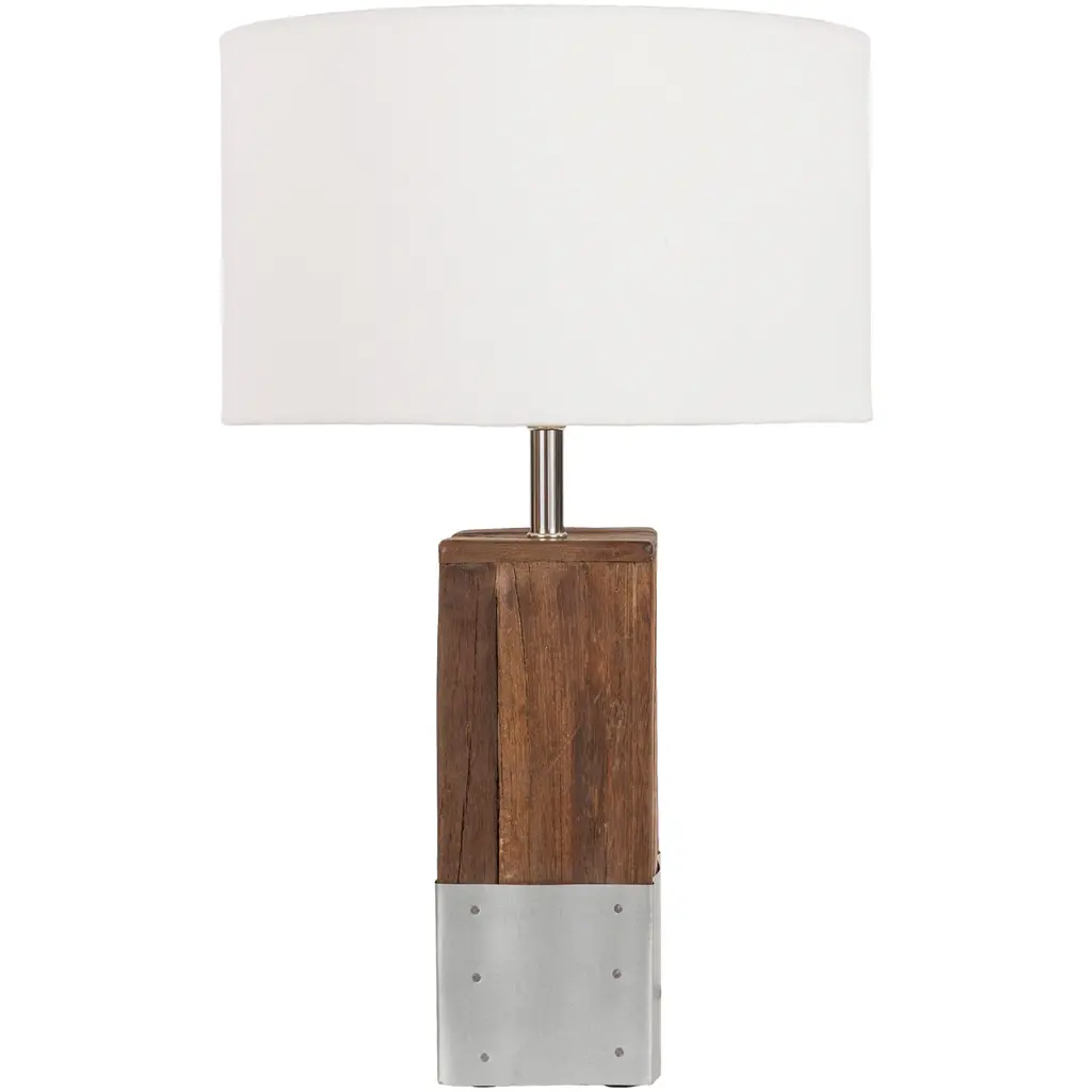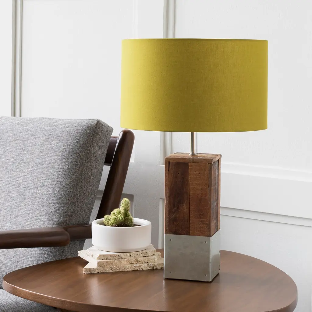 Position optimal lighting in and around your reading nook with this table lamp. This table lamp's wood base boasts a natural finish to offset the metal accent and fabric shade. Fabric color options let you complement and contrast your chosen color scheme, and a classic rotary on/off switch makes for easy operation. Table lampSingle 60 watt bulb6 foot cordUL listedWood and metal baseNatural finishCotton thread drum shadeWhite, tan, or green fabric optionsDownlightOn/off rotary switch11.81 inches long x 11.81 inches wide x 19 inches high