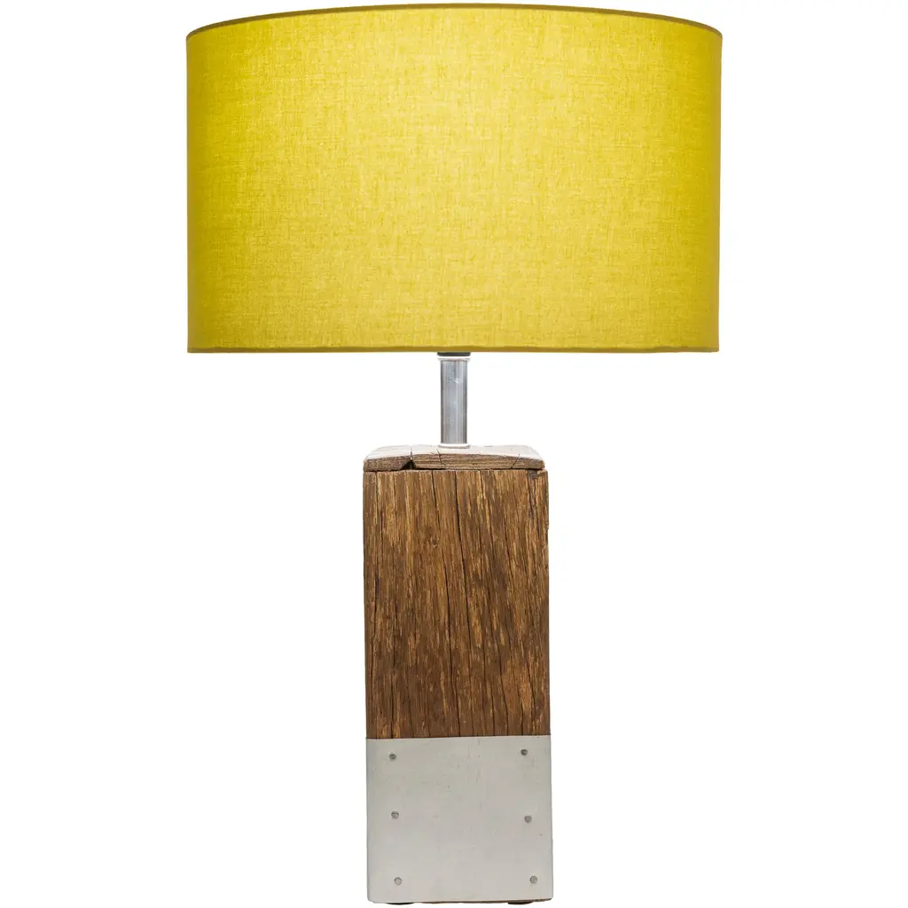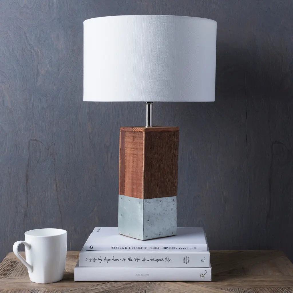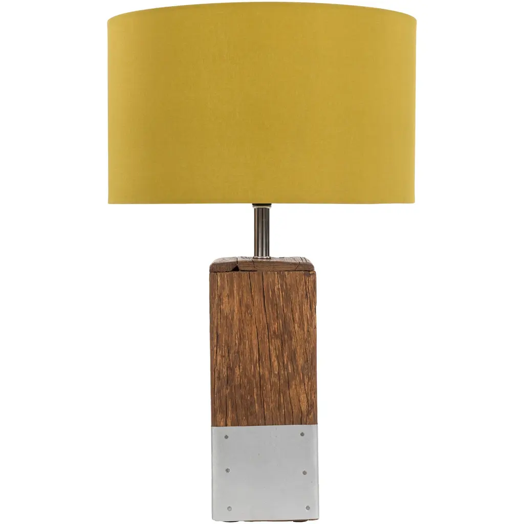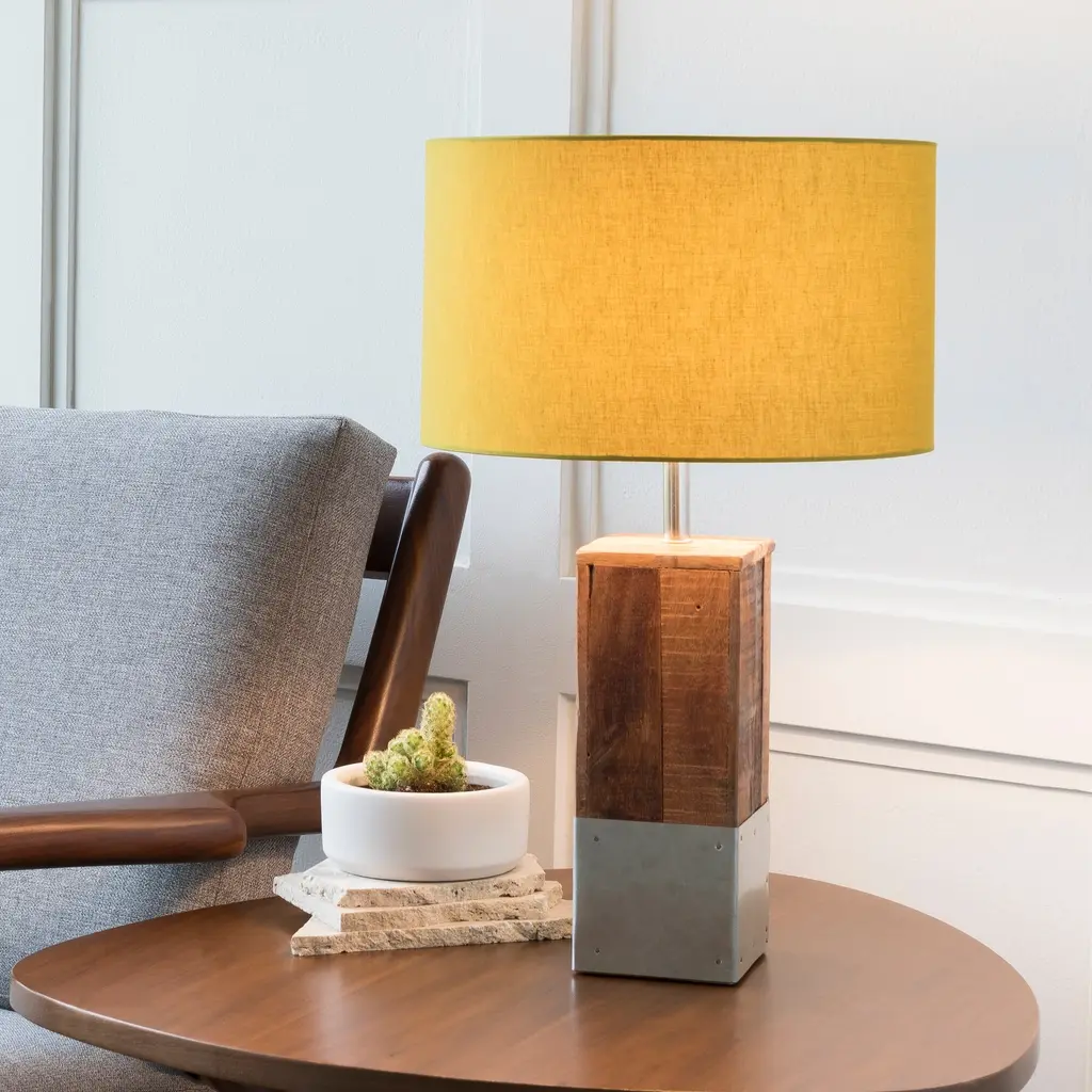 Position optimal lighting in and around your reading nook with this table lamp. This table lamp's wood base boasts a natural finish to offset the metal accent and fabric shade. Fabric color options let you complement and contrast your chosen color scheme, and a classic rotary on/off switch makes for easy operation. Table lampSingle 60 watt bulb6 foot cordUL listedWood and metal baseNatural finishCotton thread drum shadeWhite, tan, or green fabric optionsDownlightOn/off rotary switch11.81 inches long x 11.81 inches wide x 19 inches high