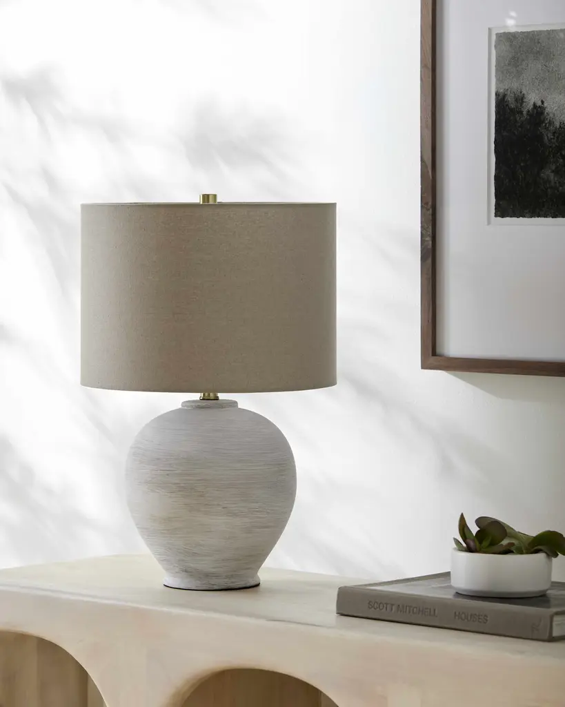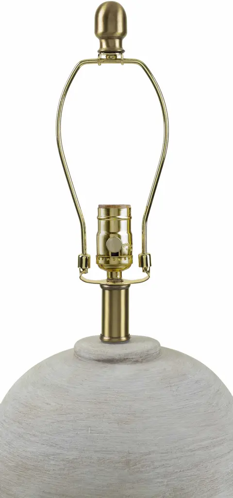 Collection: Anglesola Colors: Cream, Beige, Metallic - Brass, Translucent Material: Body: Ceramic / Shade (Outside): Linen / Shade (Inside): Polyester / Finial: Iron Styles: Traditional Made In: China Lighting Type: Accent Table Lighting Shade Material: Linen, Polyester Shade Color: Beige, Beige Cord Length: 6' Switch Type: 3-Way Number of Bulbs: 1 Socket Type: E-26 Bulb Wattage: 100W