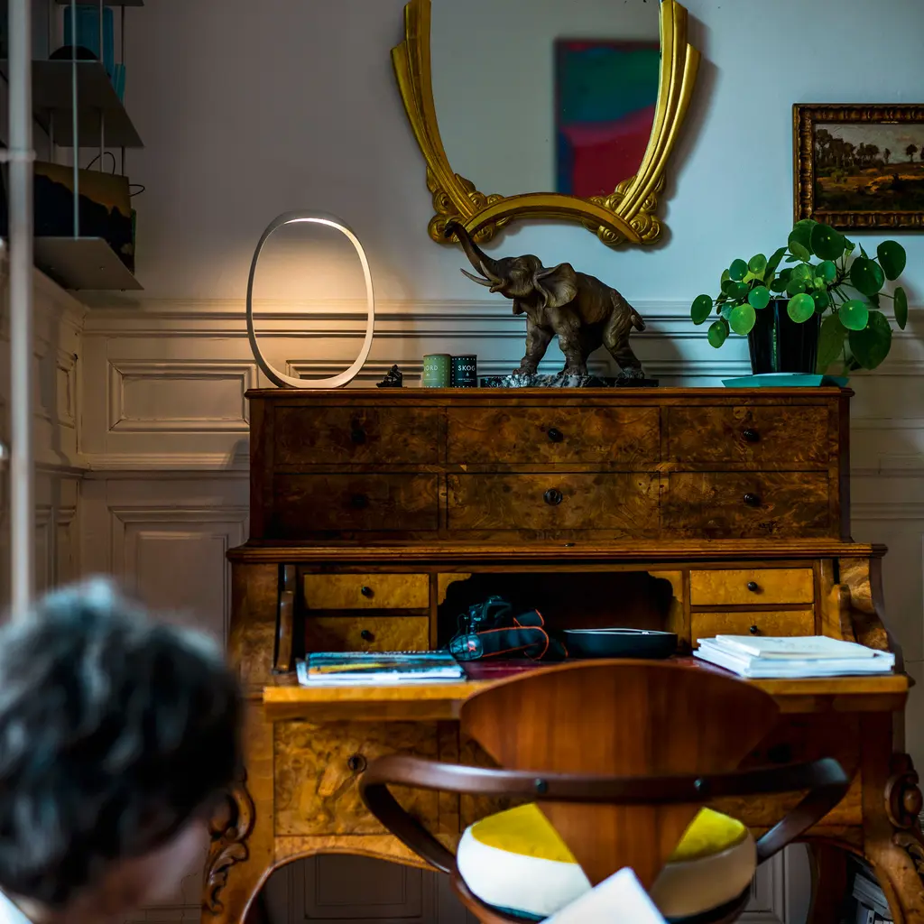 Anisha greets you like a quiet gesture frozen in mid-air. Designed for Foscarini by Lievore Altherr Molina, its sculptural ring of injection-molded ABS surrounds a pocket of space that seems to glow from nowhere, with an integrated LED so well concealed the light appears to bloom from thin air. A feather-light tap on the discreet touch switch brings the lamp to life, filling the interior curve with a soft, even radiance—ideal for an entry console, night-stand, or desk where ambient glow matters more than seeing a bulb. Available in two sizes—just over eight inches tall or a bolder thirteen—the monochrome white finish lets Anisha dissolve effortlessly into modern interiors while still holding its own as a piece of fluid sculpture. Lightweight yet rigid, the ring’s seamless surface keeps the eye moving in an uninterrupted line of light and shadow, turning any small patch of tabletop into a quietly dramatic stage.