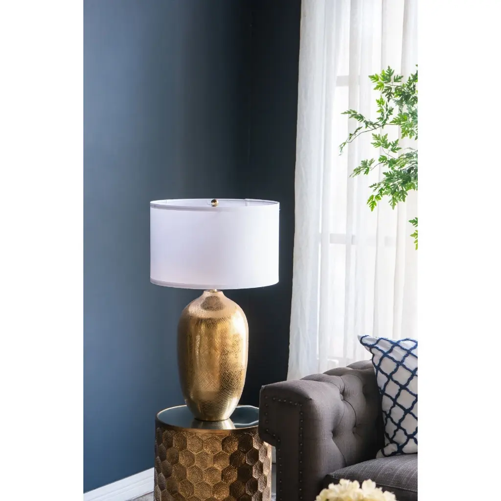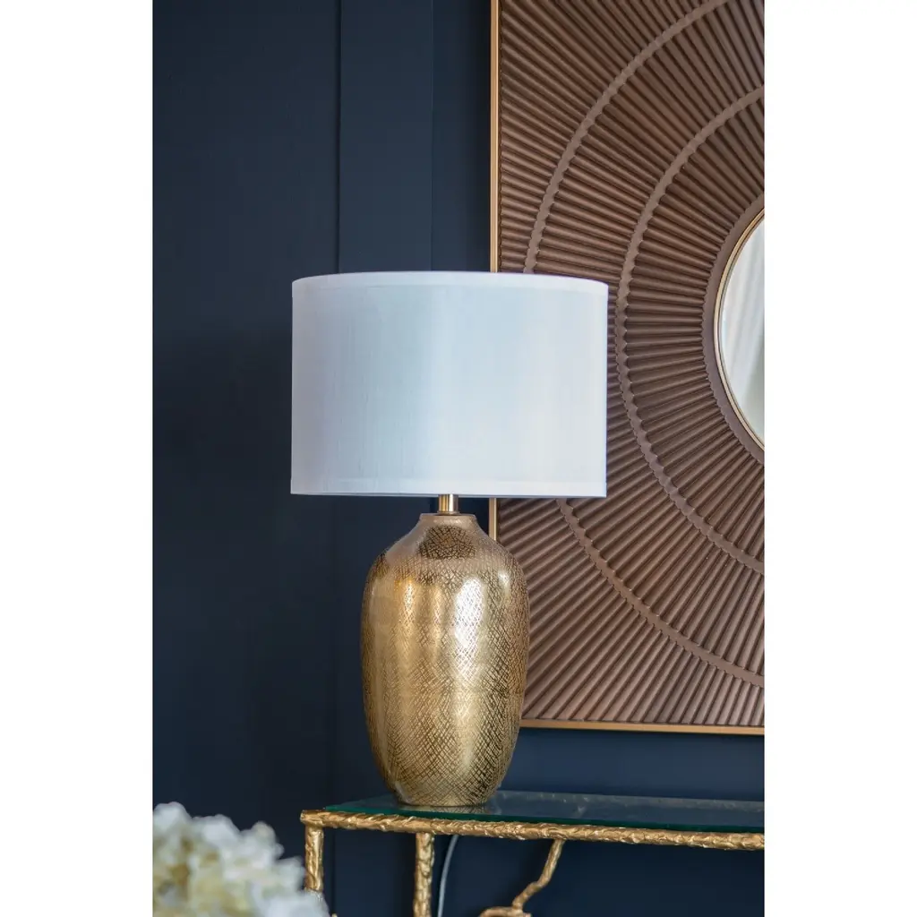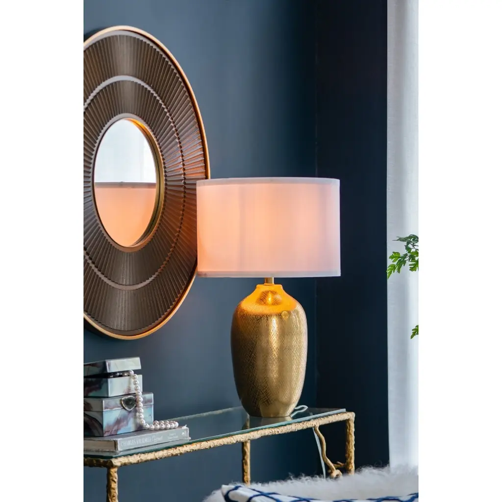 Reinventing the traditional urn silhouette, this elegant table lamp features a round shape, a white fabric drum shade, and intricate artistic detailing across the surface. It is an ideal size for your bedside table, a desk in your study, or an end table anywhere in your house. Minimal assembly is required for the collapsible drum shade.