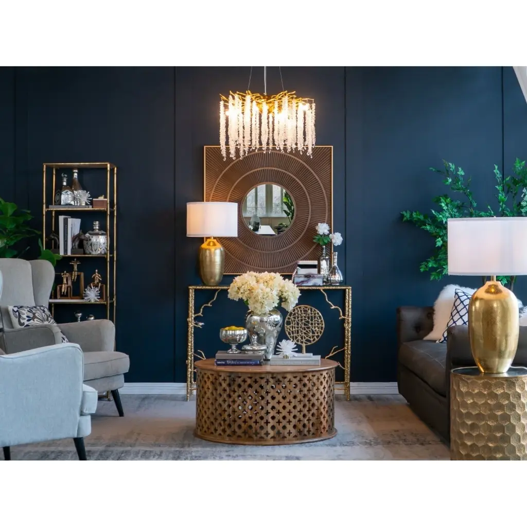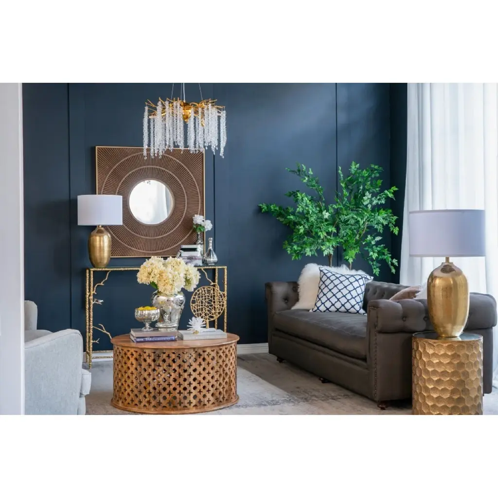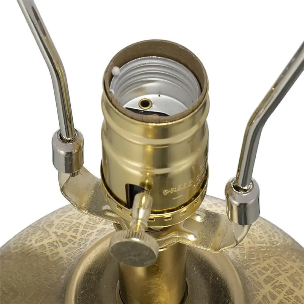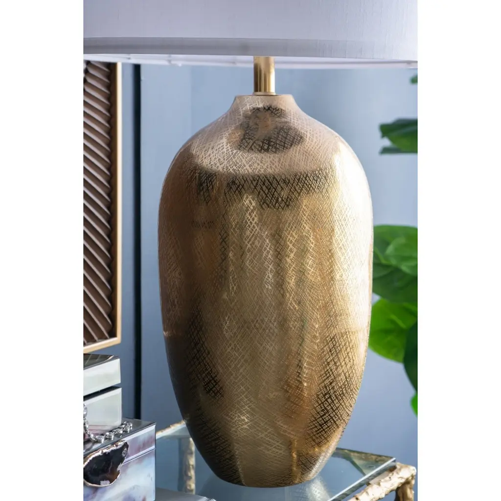 Reinventing the traditional urn silhouette, this elegant table lamp features a round shape, a white fabric drum shade, and intricate artistic detailing across the surface. It is an ideal size for your bedside table, a desk in your study, or an end table anywhere in your house. Minimal assembly is required for the collapsible drum shade.