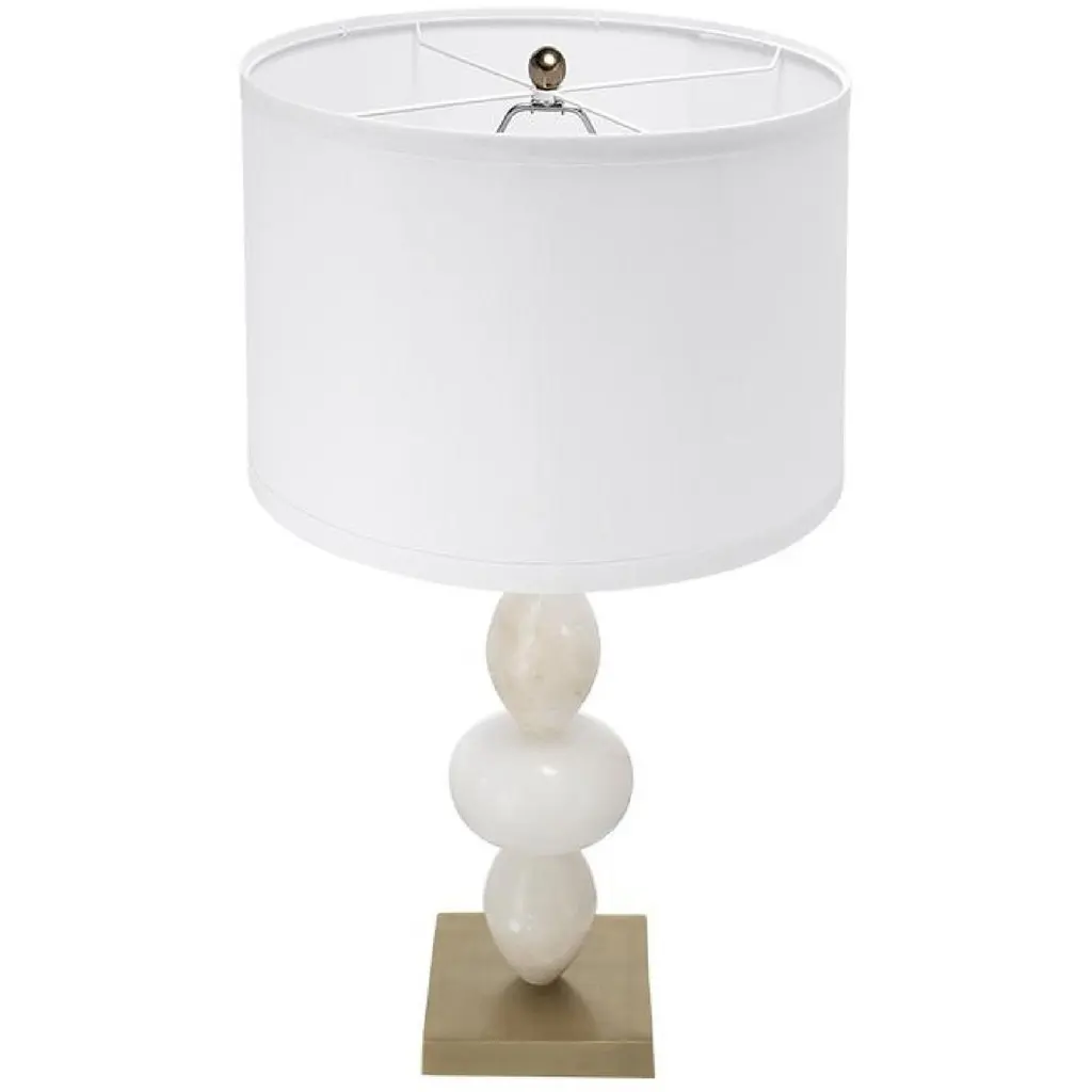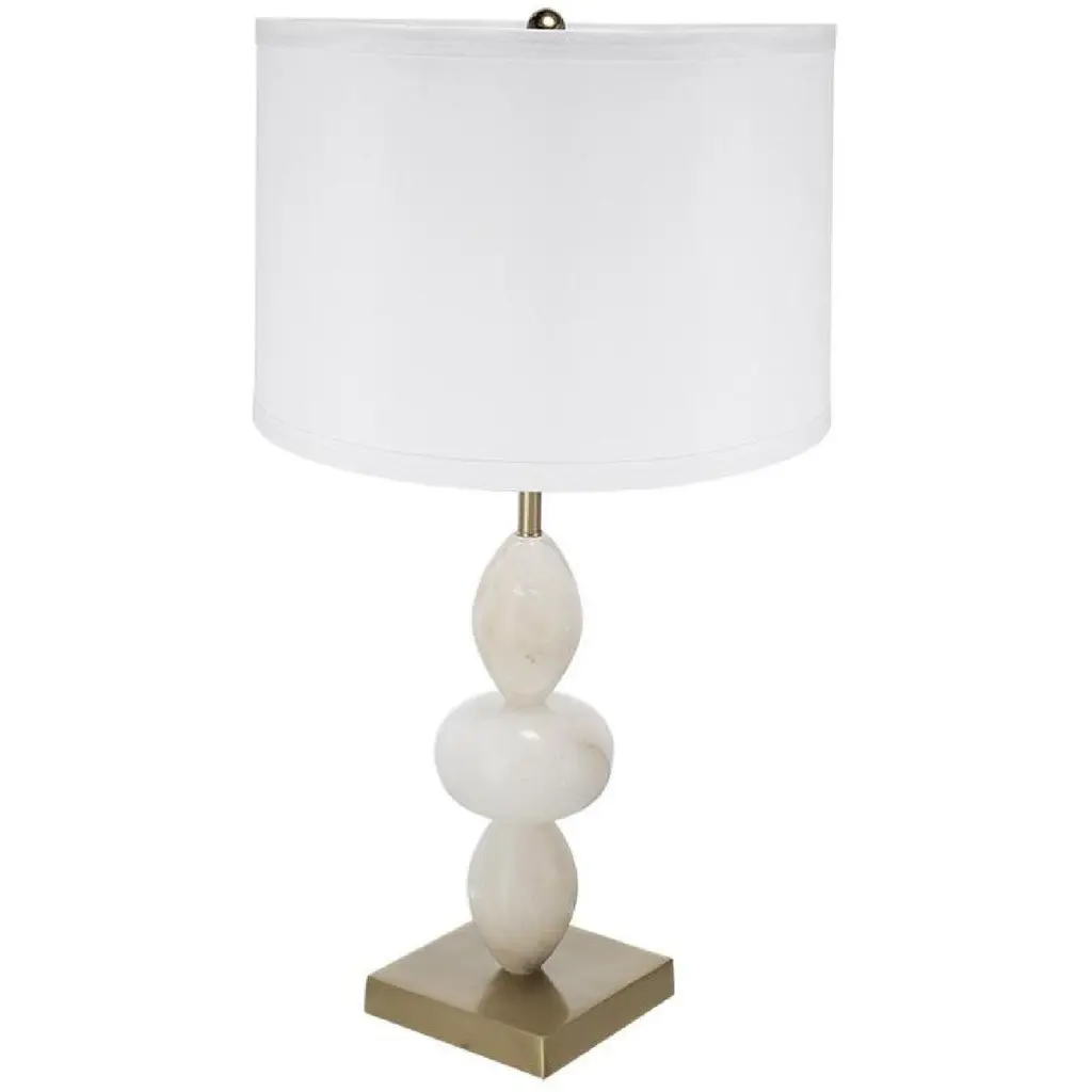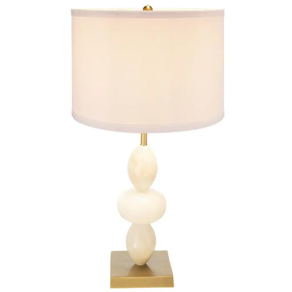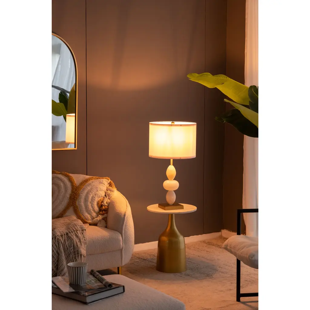 As contemporary as it is intriguing, this table lamp features three round alabaster accents, two vertical and one horizontal, a classic white drum shade, and a gold aluminum base. Measuring 26H x 14D x 14W, it is an ideal size for your bedside table, a desk in your study, or an end table anywhere in your house. Minimal assembly is required for the collapsible drum shade.
