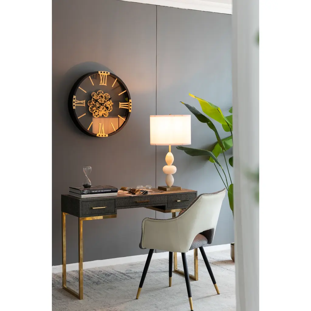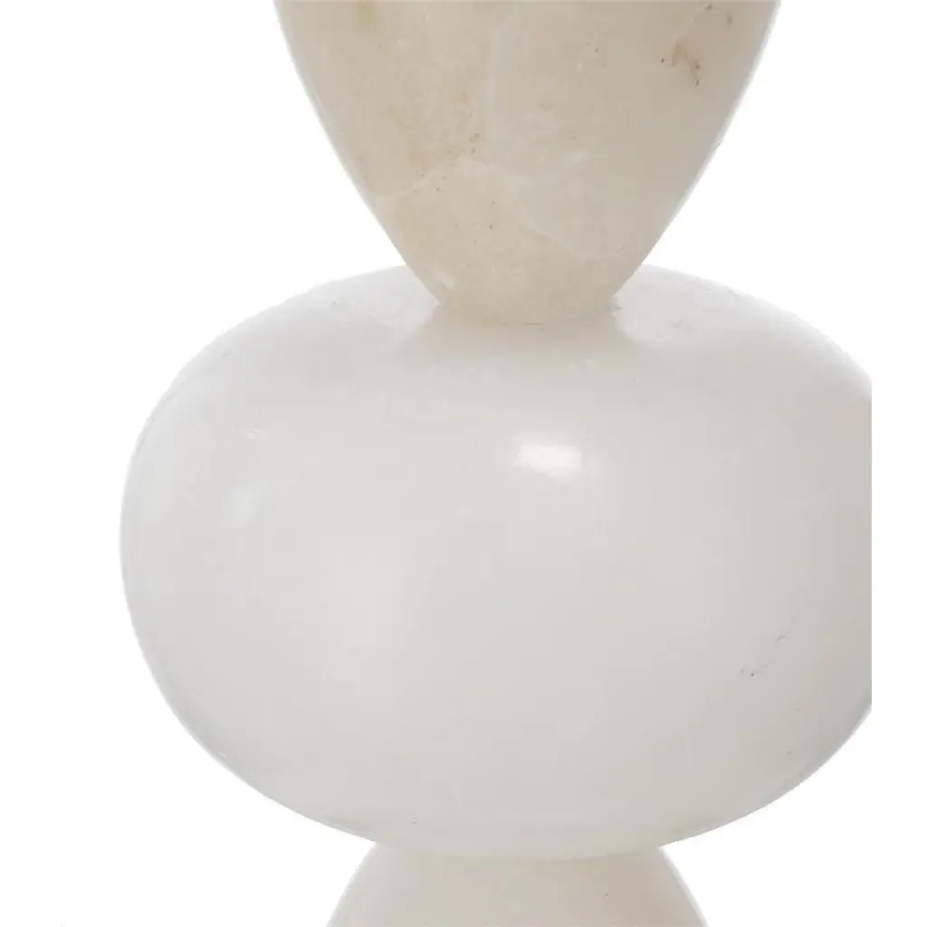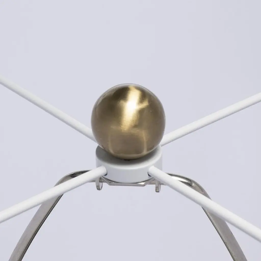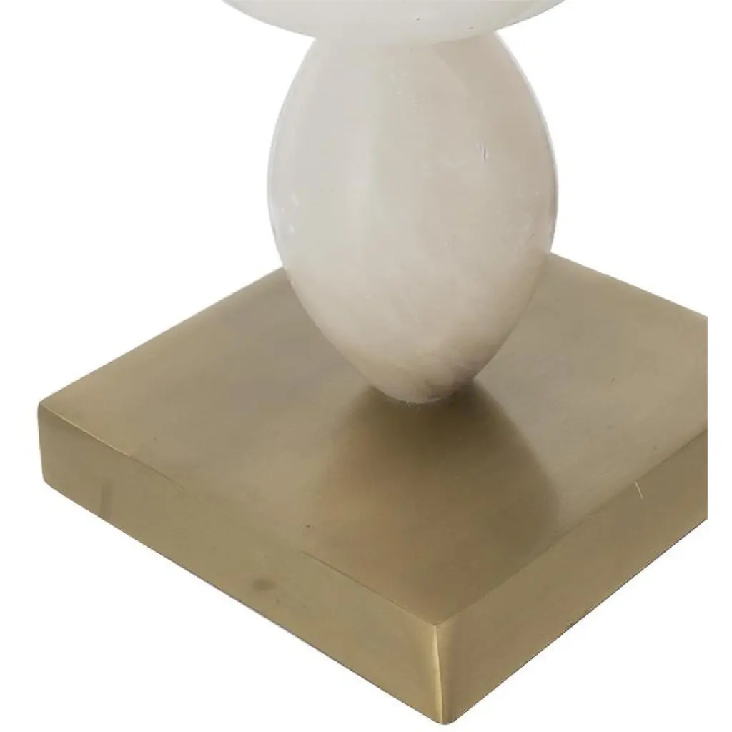 As contemporary as it is intriguing, this table lamp features three round alabaster accents, two vertical and one horizontal, a classic white drum shade, and a gold aluminum base. Measuring 26H x 14D x 14W, it is an ideal size for your bedside table, a desk in your study, or an end table anywhere in your house. Minimal assembly is required for the collapsible drum shade.