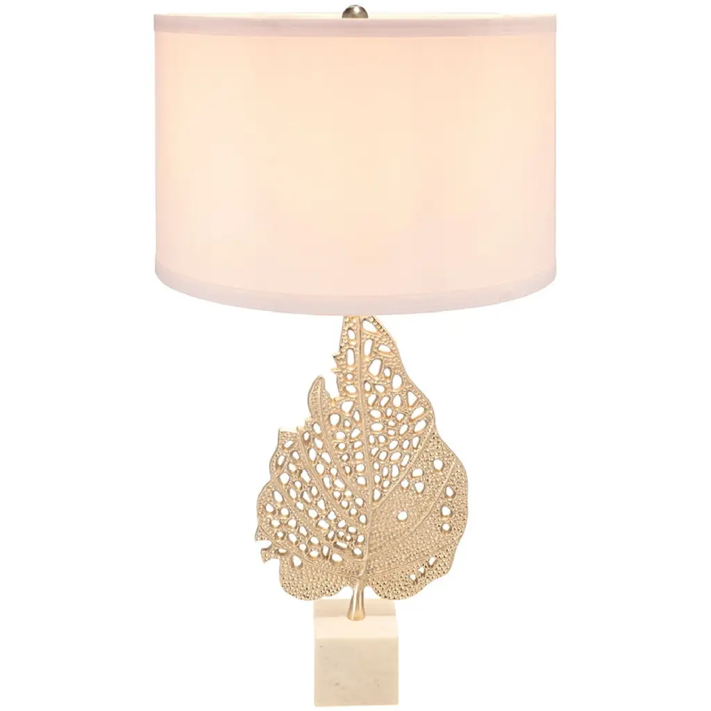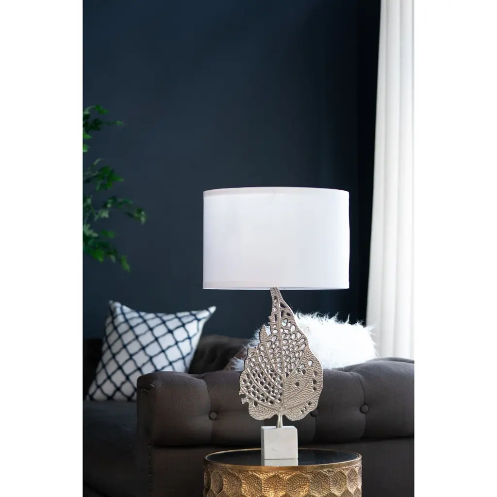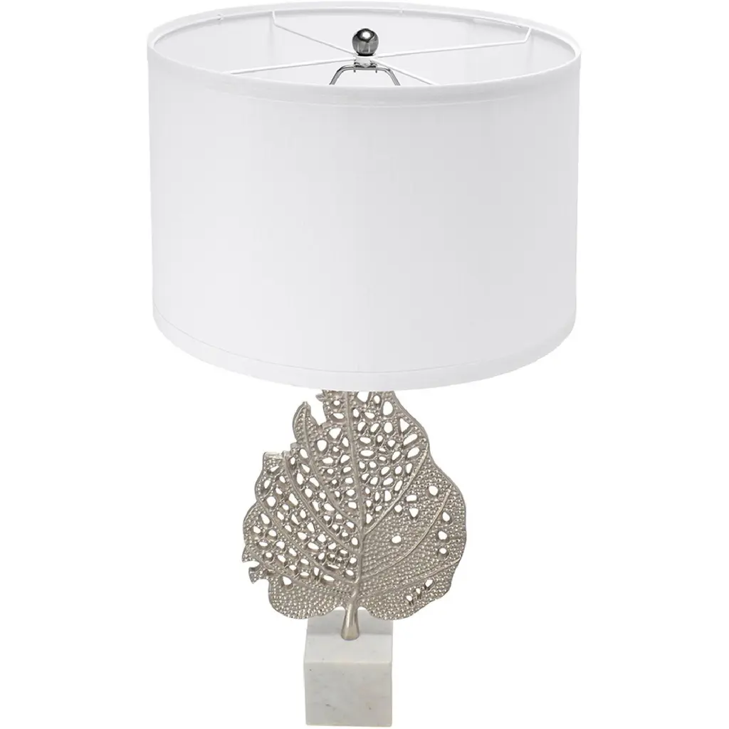 Bring an artistic, modern accent to your home decor with this table lamp. Featuring a marble cube pedestal base, a white drum shade, and a leaf silhouette coated in a nickel finish, this piece is sure to attract the eye of your guests. It is an ideal size for your bedside table, a desk in your study, or an end table anywhere in your house. Minimal assembly is required for the collapsible drum shade.