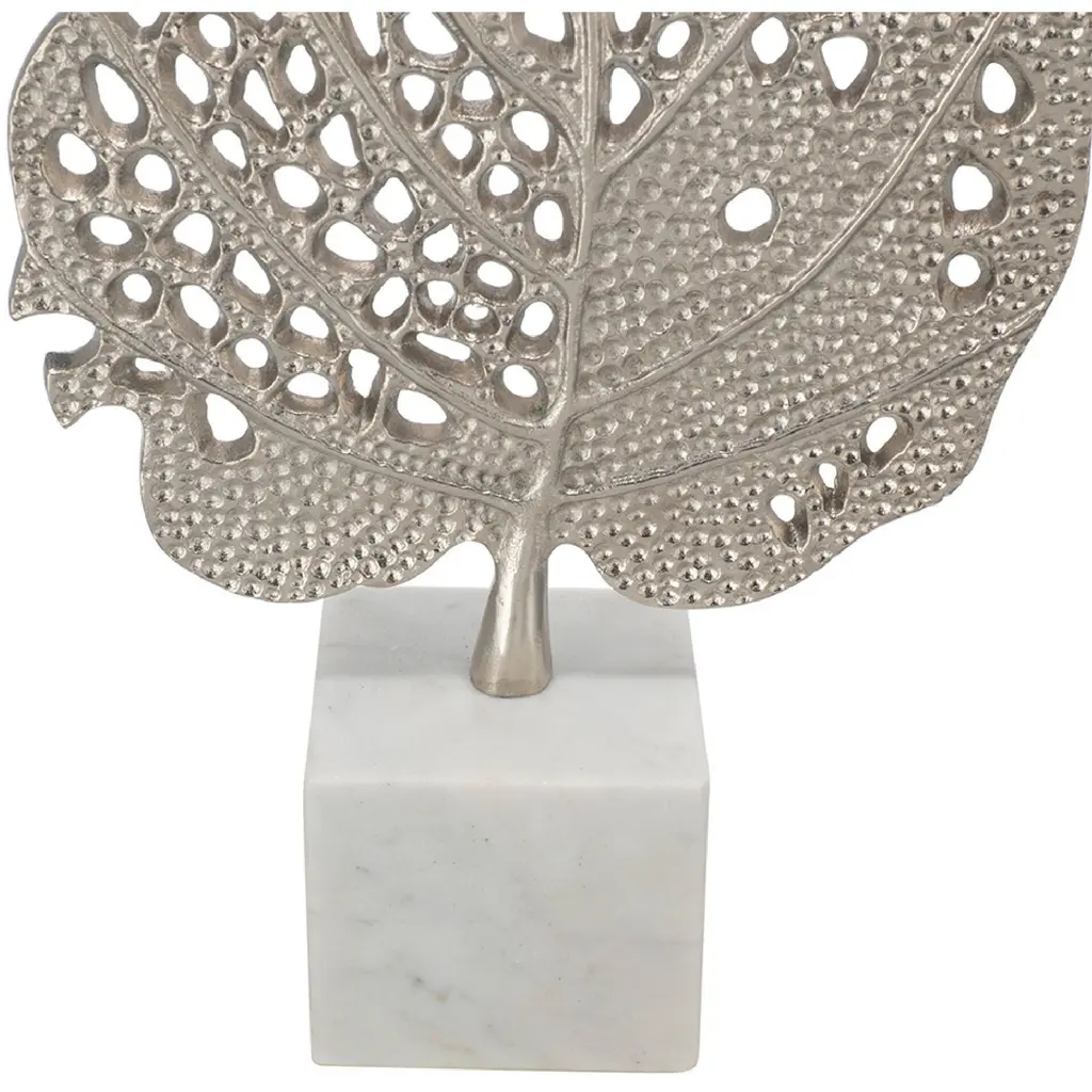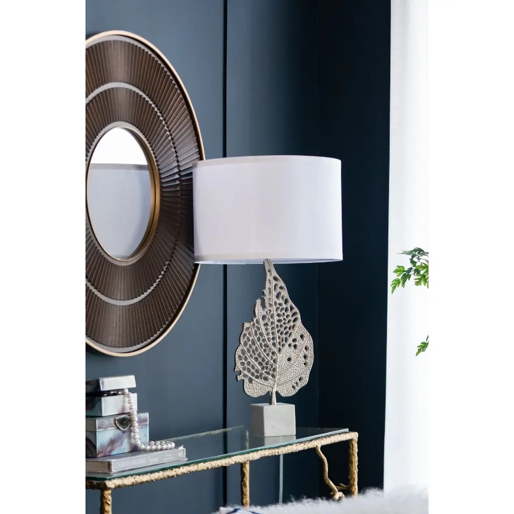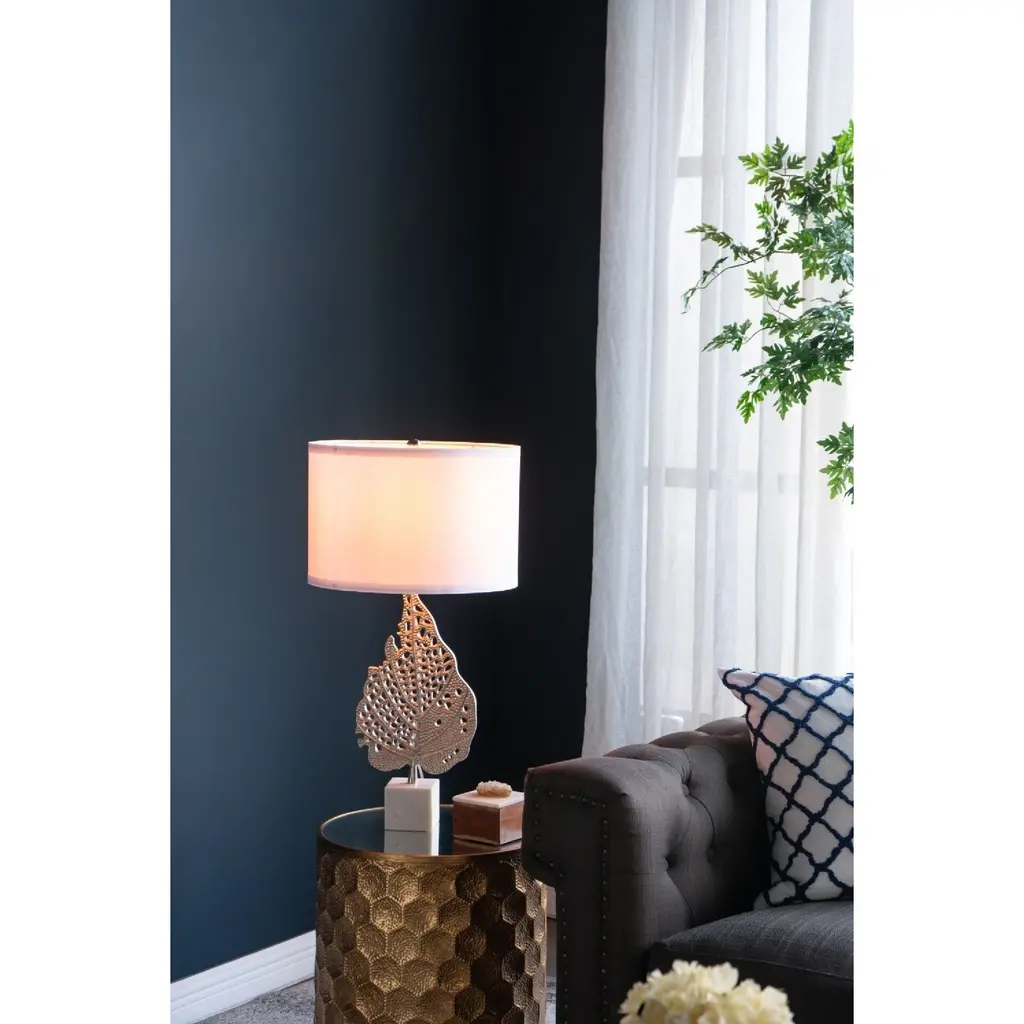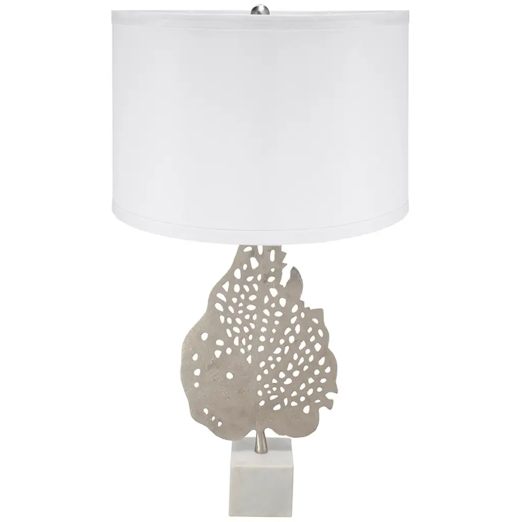 Bring an artistic, modern accent to your home decor with this table lamp. Featuring a marble cube pedestal base, a white drum shade, and a leaf silhouette coated in a nickel finish, this piece is sure to attract the eye of your guests. It is an ideal size for your bedside table, a desk in your study, or an end table anywhere in your house. Minimal assembly is required for the collapsible drum shade.