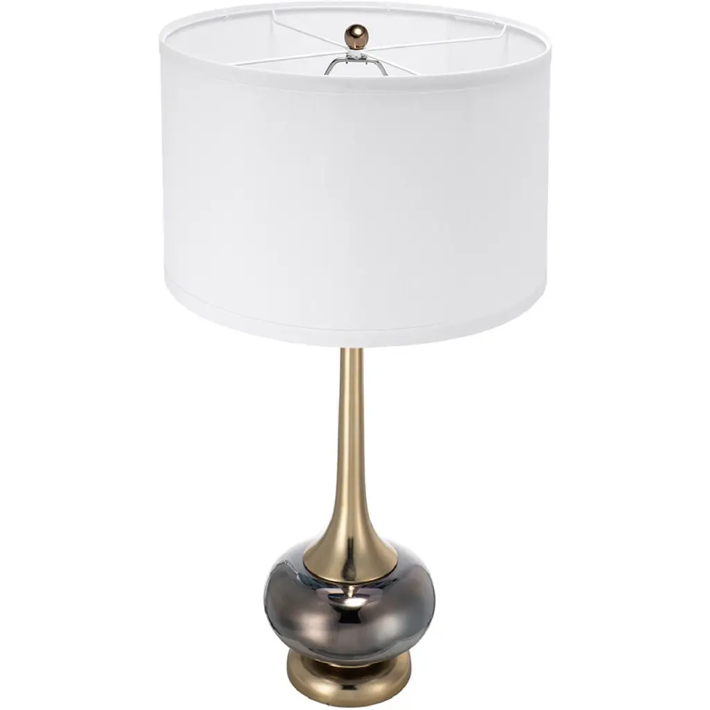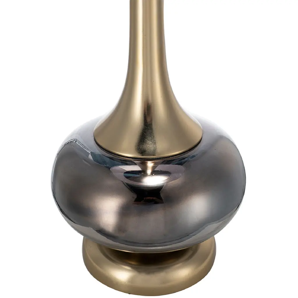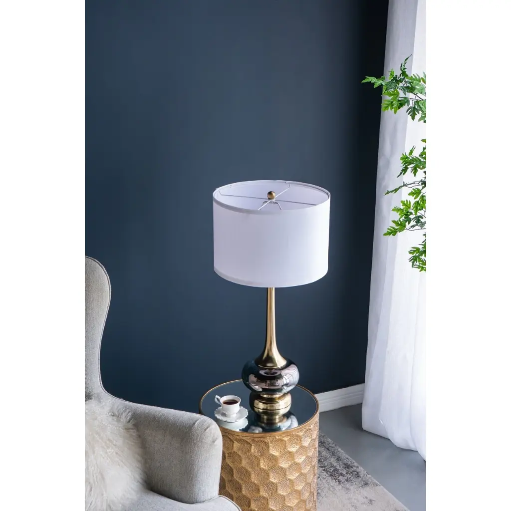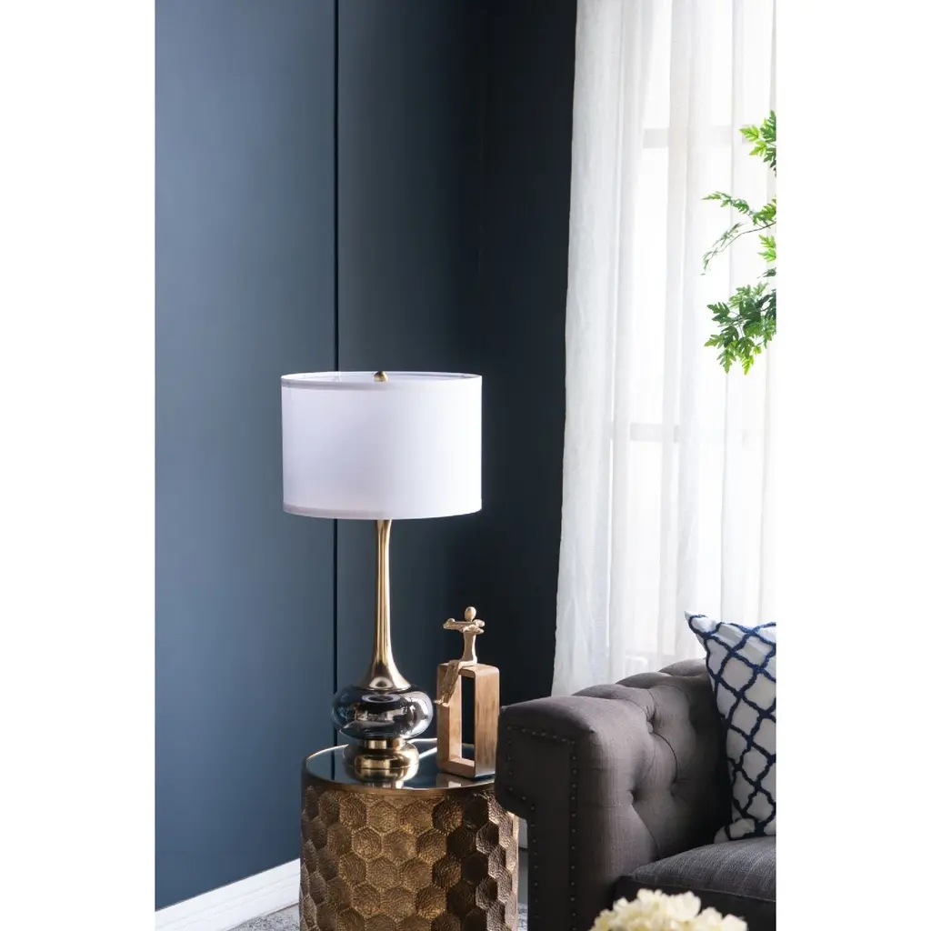 Crafted from a mix of sturdy aluminum and glass, this table vase features an artistic silhouette, a pedestal base, a long fluted neck, and a white drum shade. Striking a bold contrast between gray and golden hues, this lamp will capture the eye of your guests from your bedside table, a desk in your study, or a living room end table. Minimal assembly is required for the collapsible drum shade.