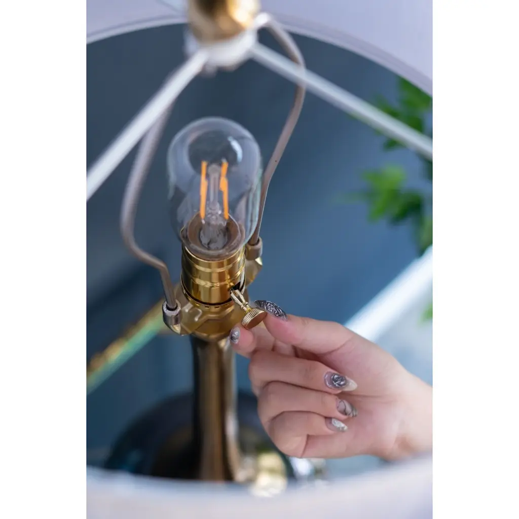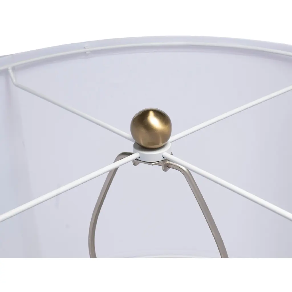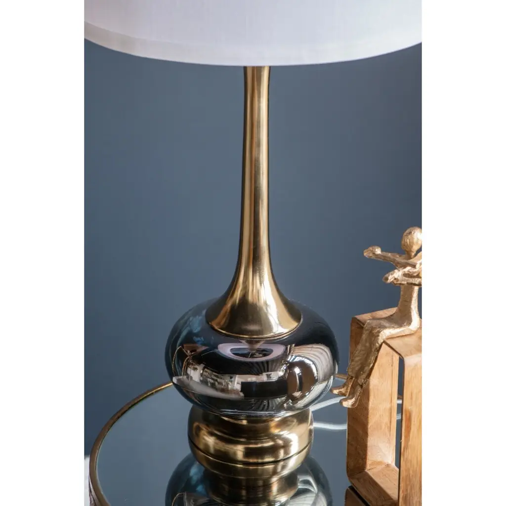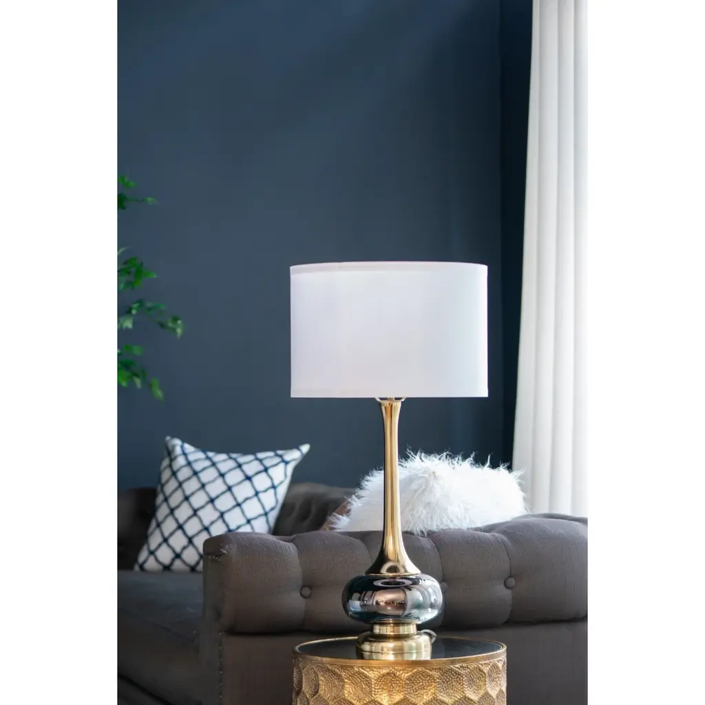 Crafted from a mix of sturdy aluminum and glass, this table vase features an artistic silhouette, a pedestal base, a long fluted neck, and a white drum shade. Striking a bold contrast between gray and golden hues, this lamp will capture the eye of your guests from your bedside table, a desk in your study, or a living room end table. Minimal assembly is required for the collapsible drum shade.