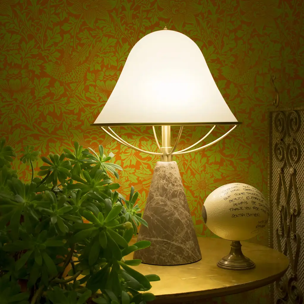 This stunning table lamp was designed by Lorenza Bozzoli and is part of the Anita collection. It features a stunning conical base in Emperador marble with a structure of satin-finished brass made up of curved elements that support the mushroom-shaped glass shade in satin white. Inspired by the magical allure of the city of Venice, this piece will imbue a delicate ambiance and a luxurious quality to a modern or classic interior.