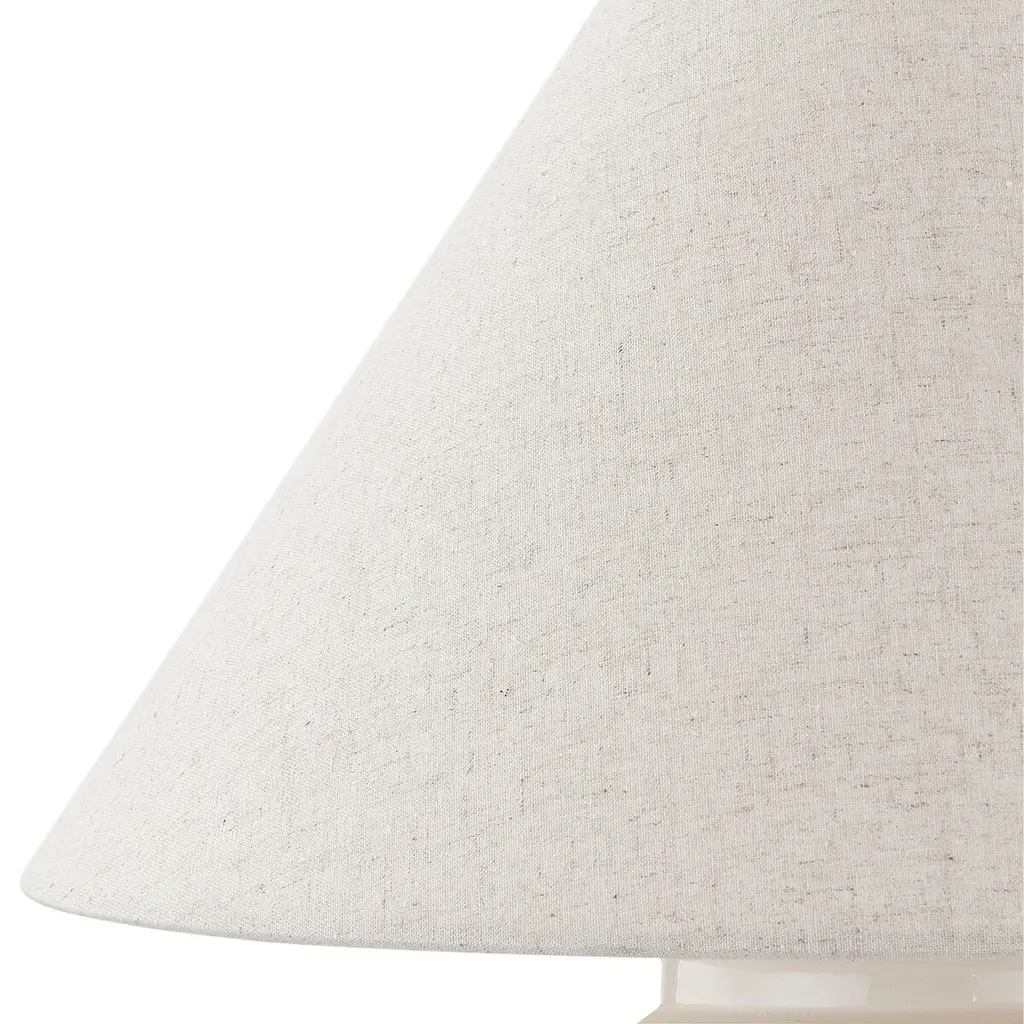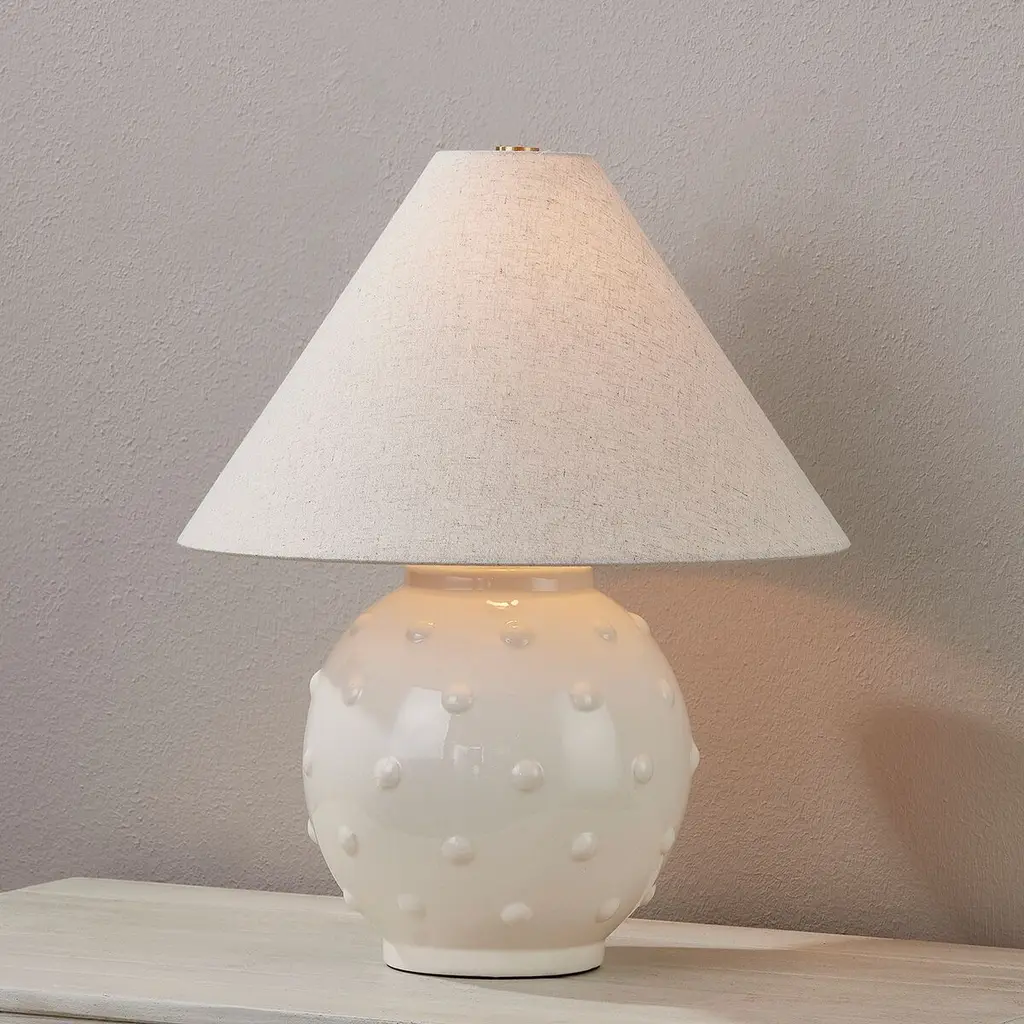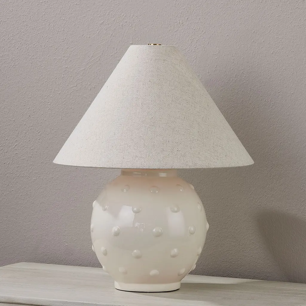 With its raised dots and crackled finish, this table lamp has the retro charm of hobnail glass. The tapered linen shade is a perfect finishing touch.