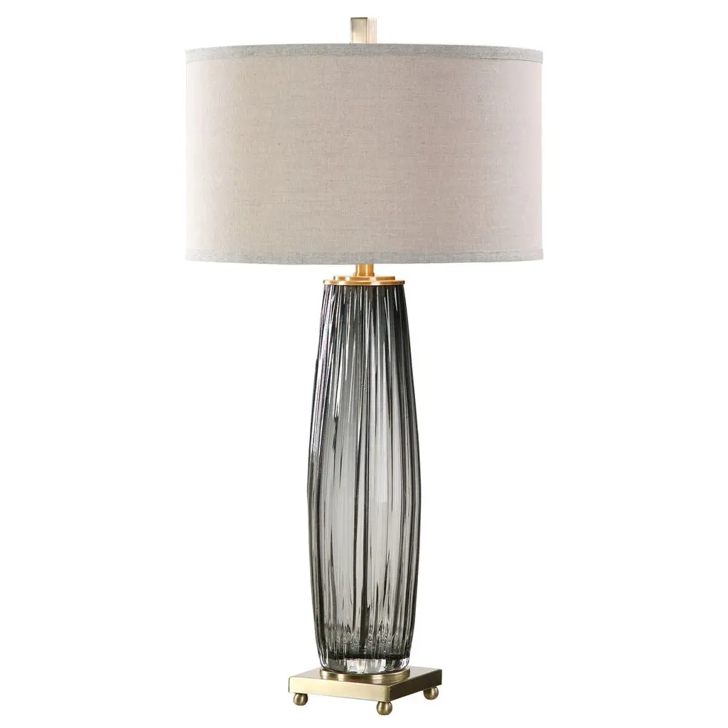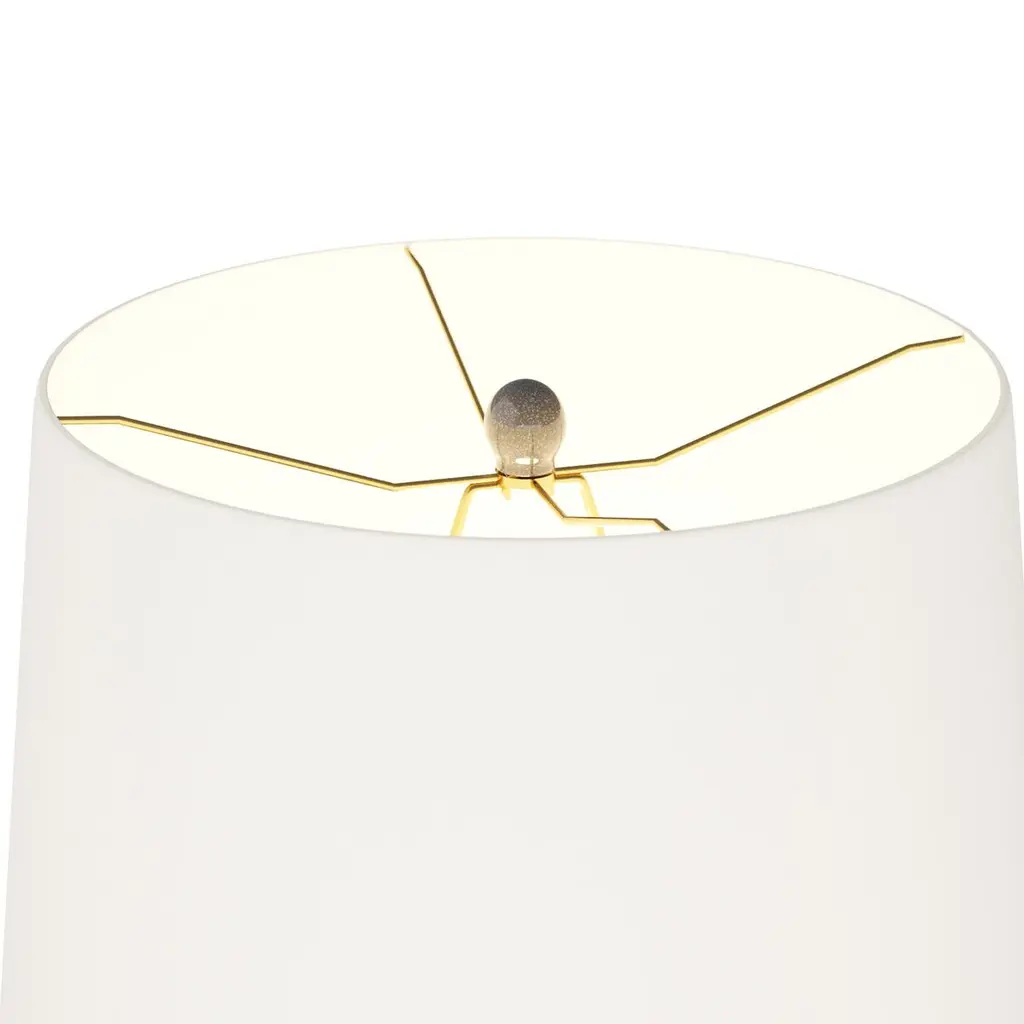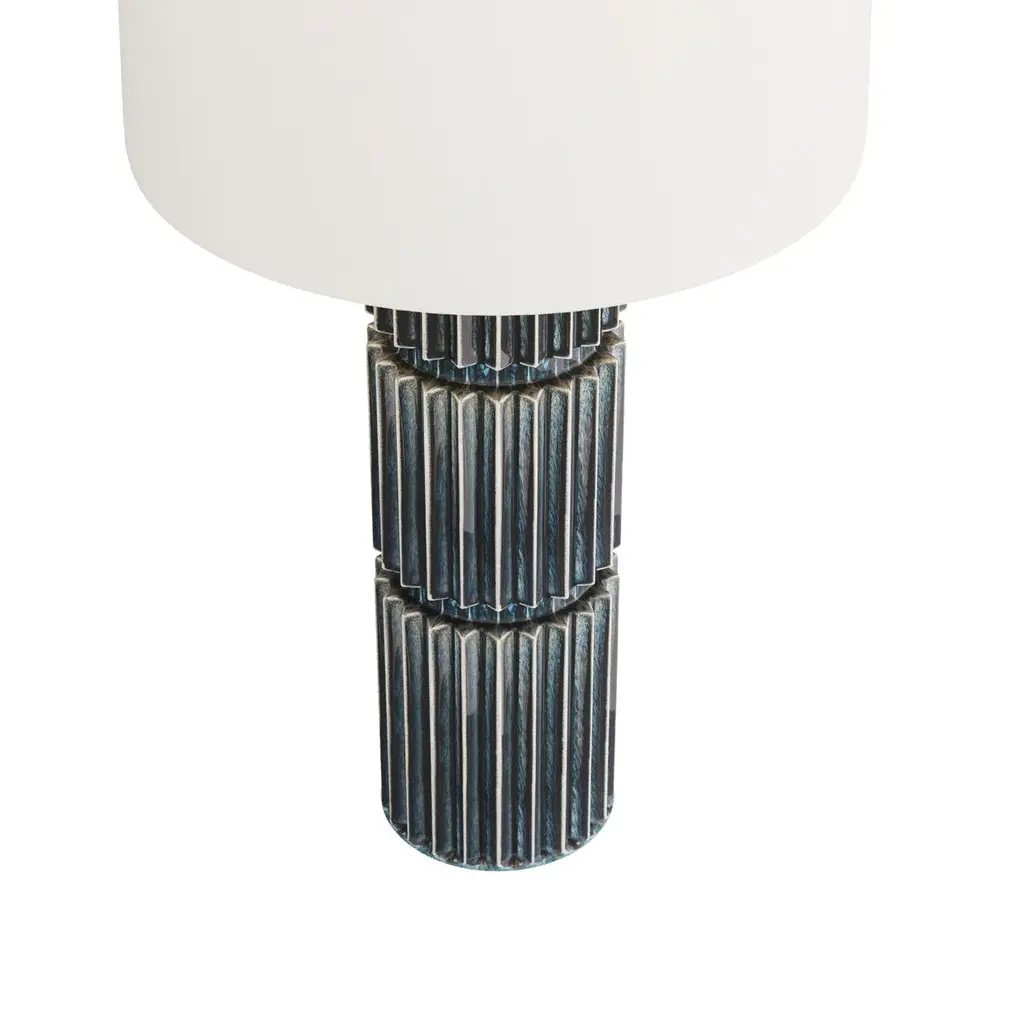 Sculpted in ceramic and finished in a reactive glaze of ocean, the Annika’s textural fluting is reminiscent of mechanical gears. Accented with an antique brass finished support and linen drum shade, it delivers the perfect marriage of industrial and modern design. Matching ocean ceramic finial, clear silver cord, and three-way rotary switch.