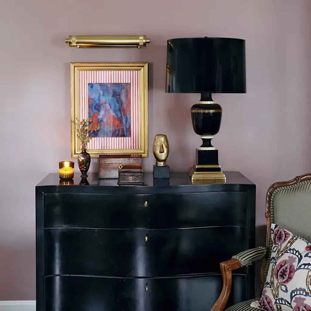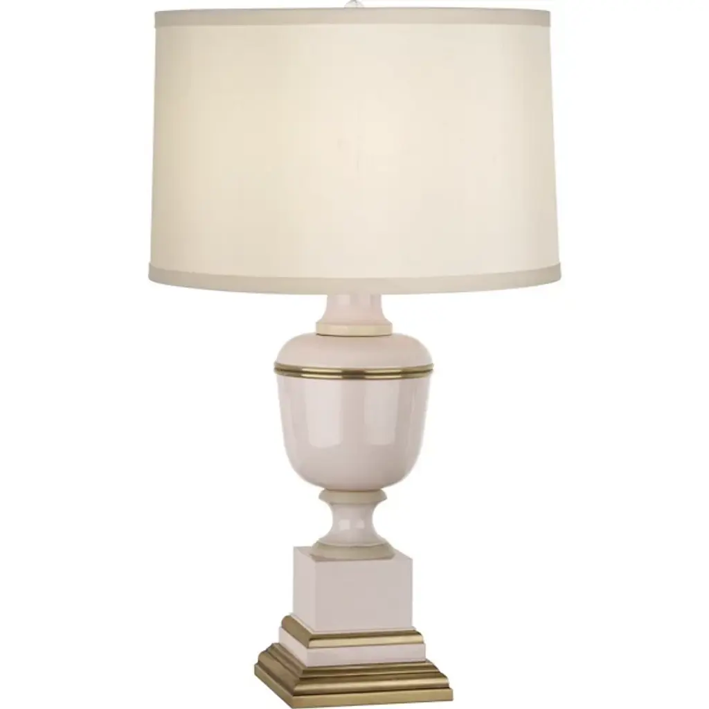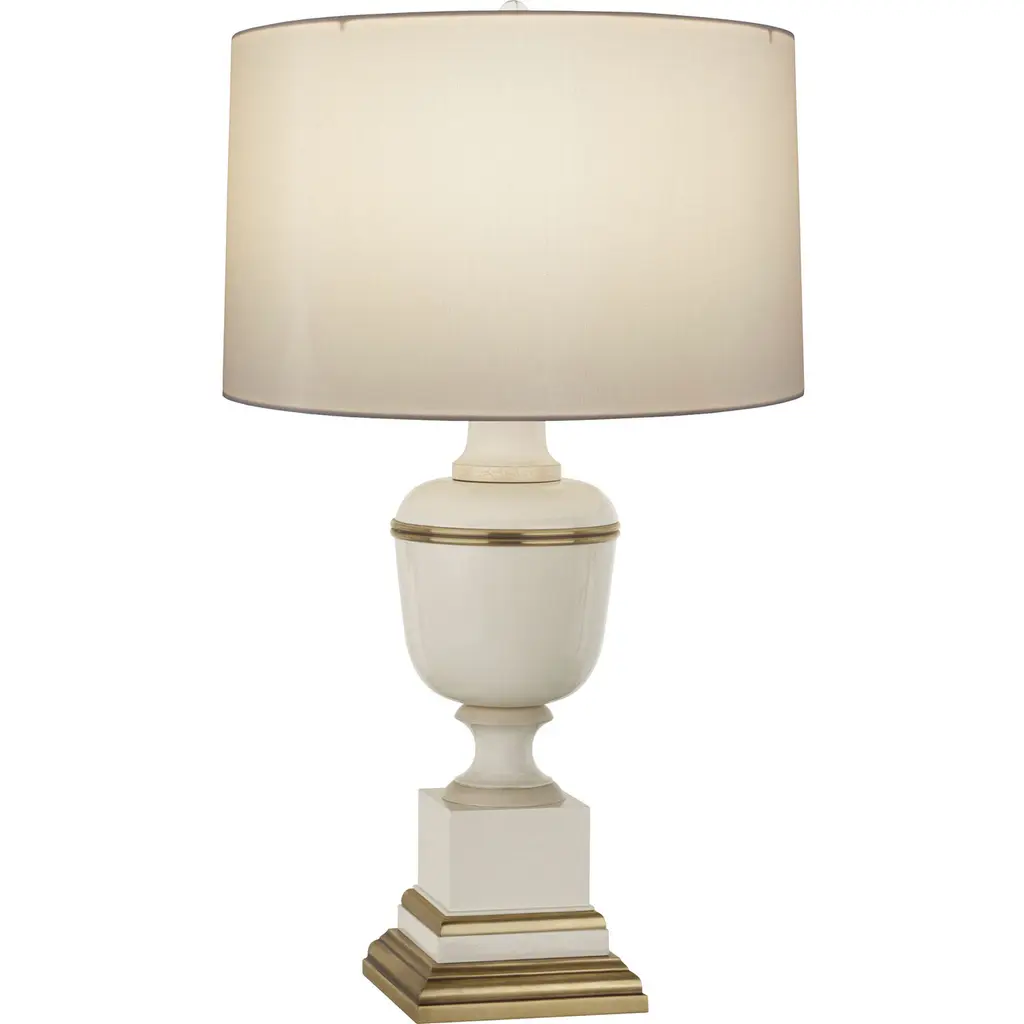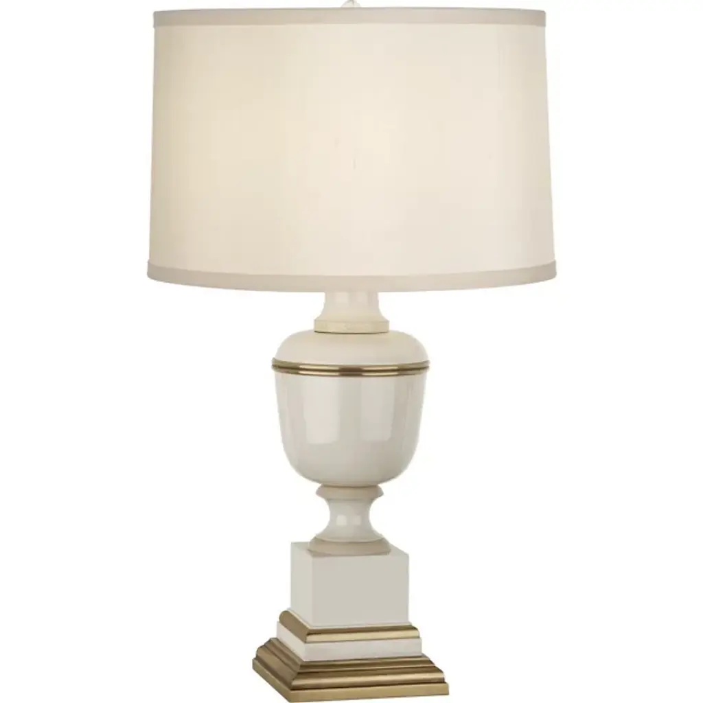 Classic luxury with modern appeal. The Annika Drum Table Lamp by Robert Abbey is exquisitely designed with a combination of geometric lines and curves and a sleek glossy lacquered column base. The metal base features contrasting ribbons of molding-like accents which serve to break up and accentuate each shape while adding a regal touch. Its rounded fabric shade complements the lamp’s sheen as it diffuses warm light throughout the space.