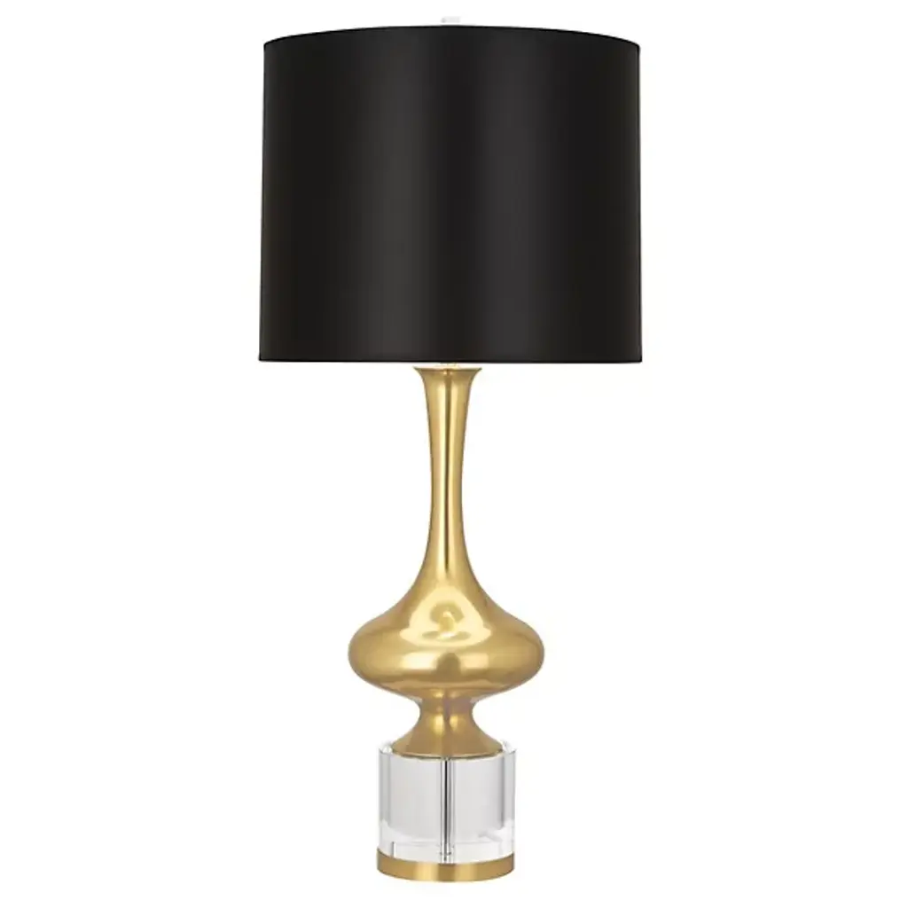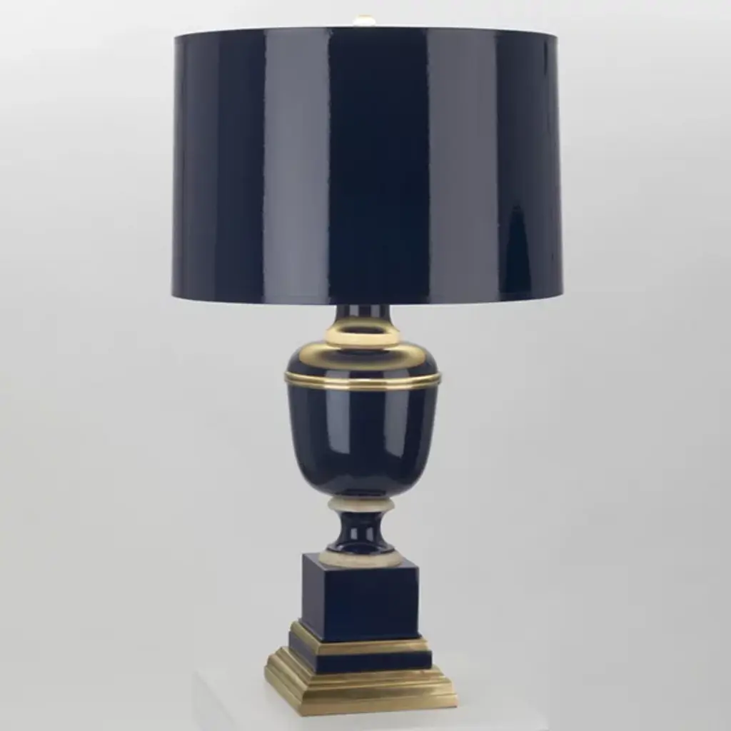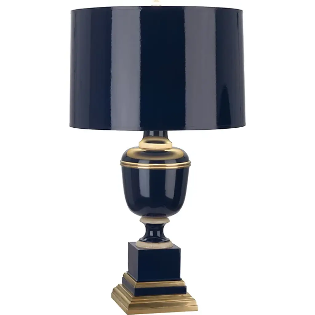 Classic luxury with modern appeal. The Annika Drum Table Lamp by Robert Abbey is exquisitely designed with a combination of geometric lines and curves and a sleek glossy lacquered column base. The metal base features contrasting ribbons of molding-like accents which serve to break up and accentuate each shape while adding a regal touch. Its rounded fabric shade complements the lamp’s sheen as it diffuses warm light throughout the space.