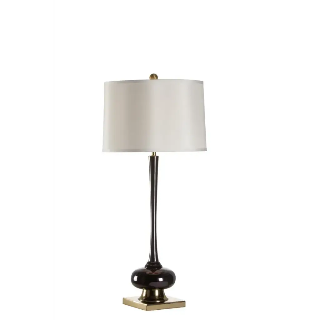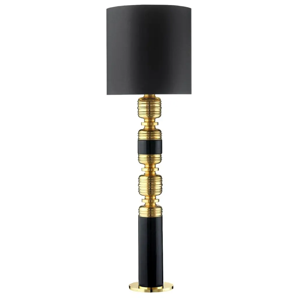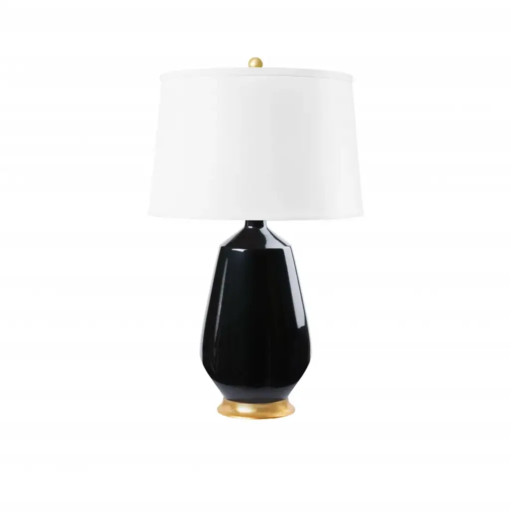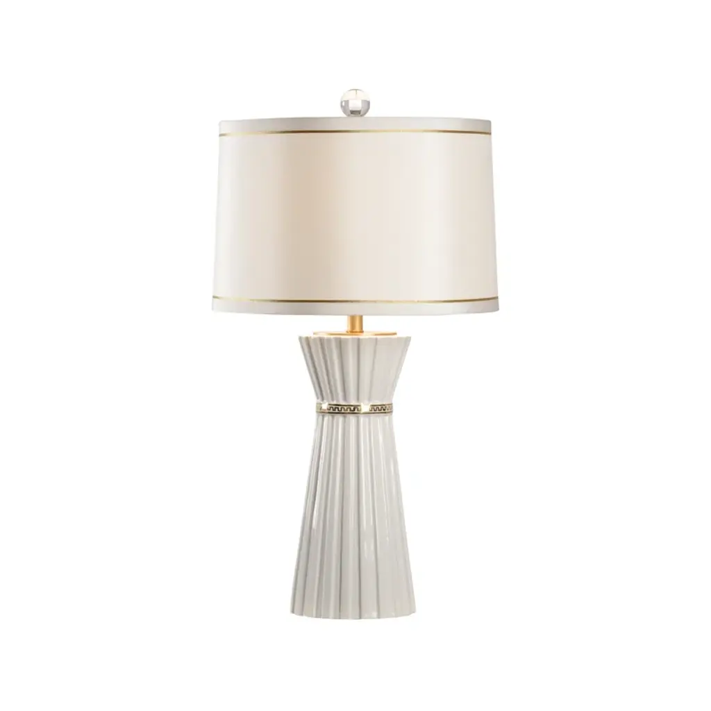Classic luxury with modern appeal. The Annika Drum Table Lamp by Robert Abbey is exquisitely designed with a combination of geometric lines and curves and a sleek glossy lacquered column base. The metal base features contrasting ribbons of molding-like accents which serve to break up and accentuate each shape while adding a regal touch. Its rounded fabric shade complements the lamp’s sheen as it diffuses warm light throughout the space.