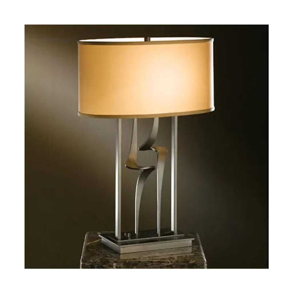 Graceful, sophisticated, with a sense of flowing movement. The refined curves and tapered shapes of the Antasia Table Lamp - 272815 from Hubbardton Forge elevate it into a piece that commands interest in a variety of viewing angles. Its hand-forged steel body dances with a dynamic quality and tapers at both ends, producing an elegantly balanced design. A clean fabric drum shade funnels its light upwards and downwards, further highlighting its gestural structure. Ambient lighting and a stylish construction make it an exceptional piece atop an end or side table.