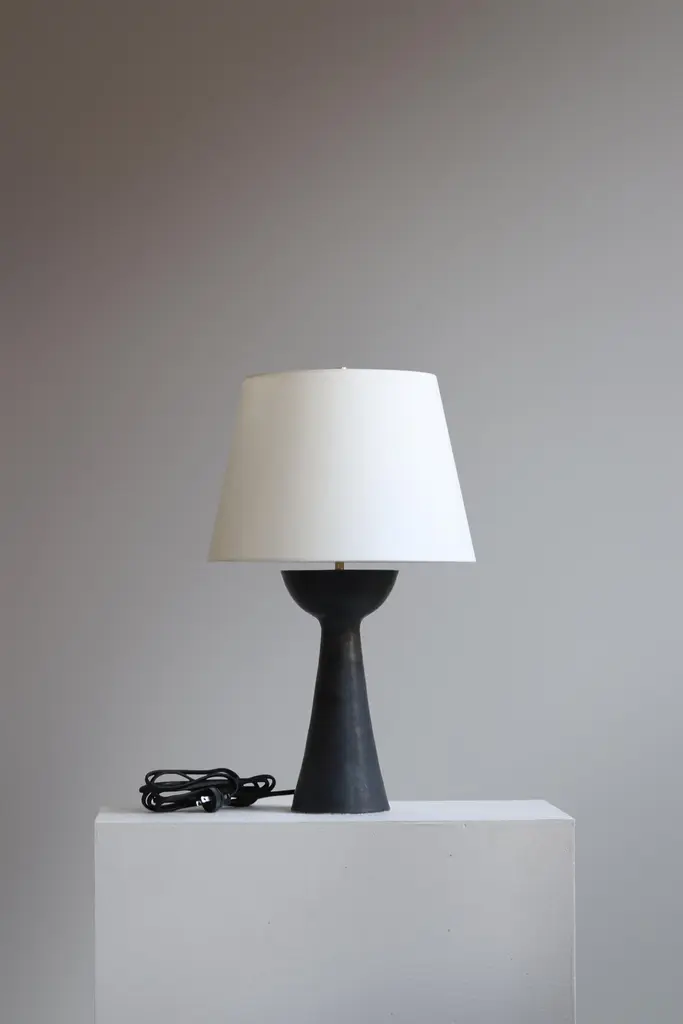 Anthracite Seneca 24 Table Lamp by Danny Kaplan StudioDimensions: ⌀ 36 x H 61 cmMaterials: Glazed Ceramic, Unfinished Brass, LinenThis item is handmade, and may exhibit variability within the same piece. We do our best to maintain a consistent product, but honor the handmade craftsmanship. Dimensions may vary within an inch.UL Certification available upon request.All our lamps can be wired according to each country. If sold to the USA it will be wired for the USA for instance.Danny Kaplan Studio is a ceramic studio based in Brooklyn focused on lighting and sculptural furniture. Everything is handmade to order.