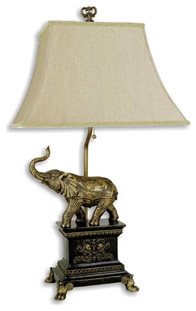 Add classical whimsy to any space in your home with this Antique Elephant Table Lamp. The base of the lamp is a square cube shape with a brown background and gold details on top. Sitting On top of this base, there are an elephant statue that has the same brown and gold colorway. The textured beige fabric shade complements the darker base and body perfectly. This lamp will look great as a statement lamp in your bedroom, living room, or even dining area. 29" H x 17" W x 14" D
