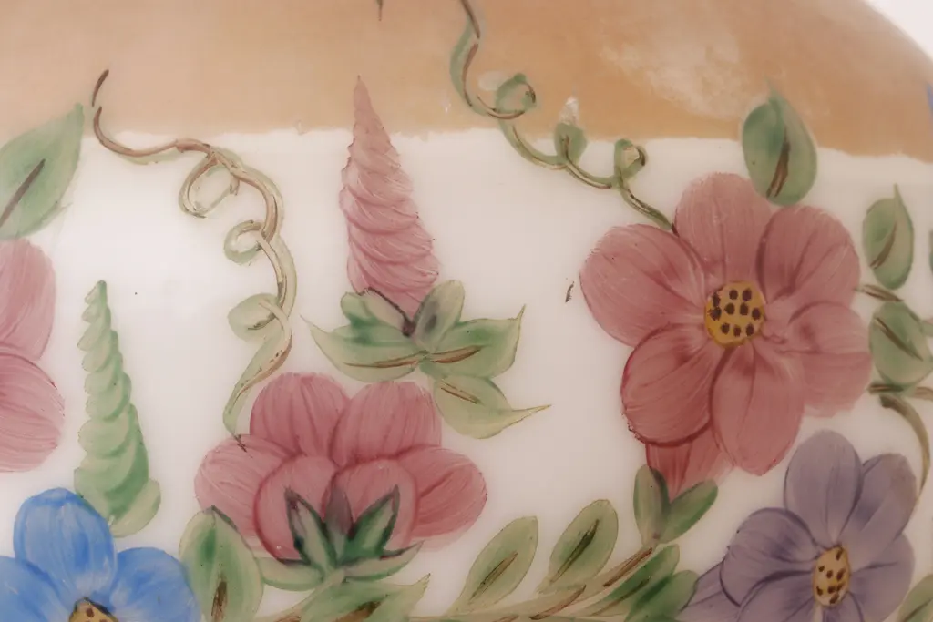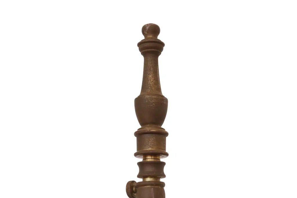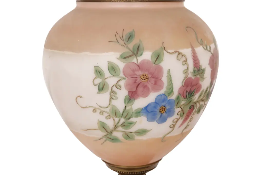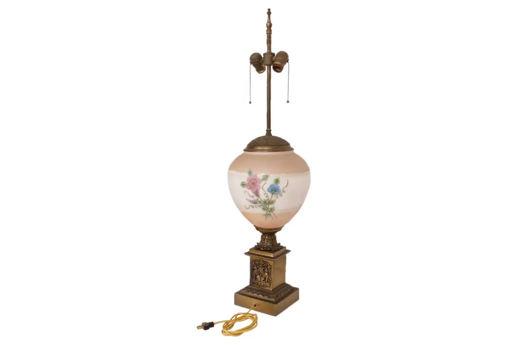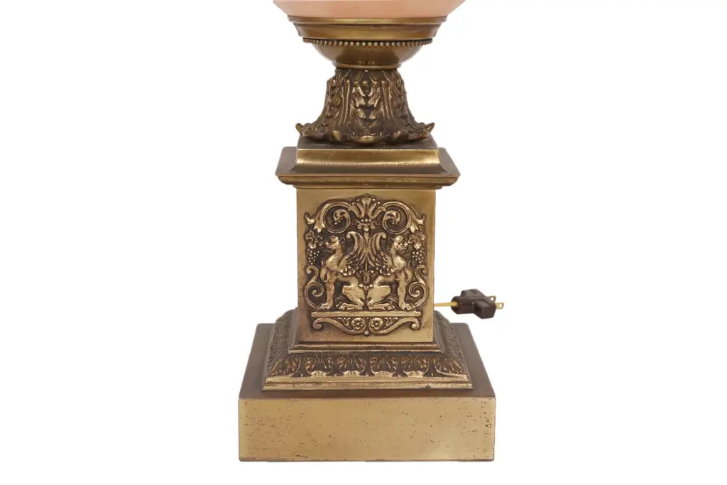 An antique Empire style brass lamp with a hand painted glass globe. A slender central column topped with an urn finial has two sockets that light with brass chain pulls. A blush and white glass globe secured with an acanthus pressed brass cap is hand painted with a floral spray. Below, a brass block is cast front and back with winged lions, framed with scrolled acanthus and grapes. Set on a square base trimmed with an acanthus motif.