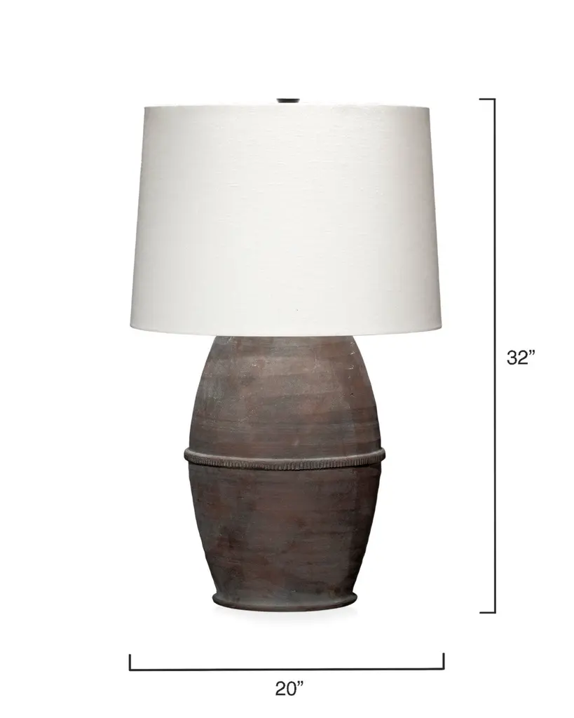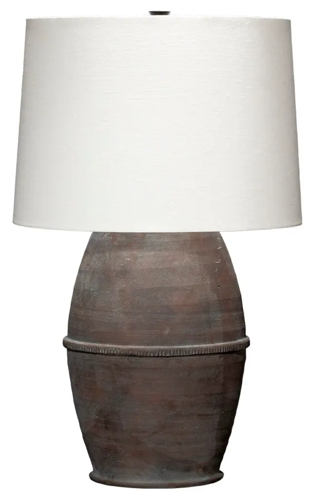 This large table lamp introduces an earthy tone and texture to a classic silhouette. The unique detail of a thin raised band draws attention to the body's midline, and the dark grey ceramic of the lamp's oversized body contrasts well with its clean white linen drum shade. This lamp is sure to make a substantial statement anywhere in your home, like an entry console or a dining room buffet.