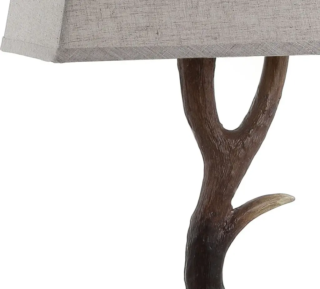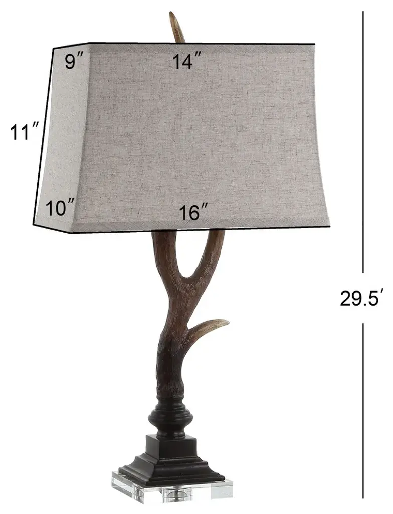 Infuse your home with the warm, rustic feel of the natural outdoors. Designed with a faux antler base, this cabin-inspired table lamp is topped with a natural gray linen drum shade. A crystal pedestal adds an unexpected elegant touch.Features:• No design element was overlooked -- even the 60" cord is silk-wrapped• The shade is made from 100% cotton• On-off inline switch• Eco-friendly 9W LED bulb included• Takes one bulb and compatible with any 9W LED or 60W TYPE "A" or 13W CFL• UL Listed • Color: Brown/Clear with light grey shade• Body Material: Resin/Crystal• Base Material: Crystal• Finial Material: -• Finial Color: -• Harp Color: -• Includes: One (1) lamp(s)• Minor Assembly RequiredDimensions:• Lamp: 29.5 inches high x 16 inches wide x 10 inches deep• Shade: 11 inches high x 16 inches wide x 10 inches deepAbout us:You see a lamp.We see a decorative work of art.A perfectly curved shade casts a dramatic shadow on a floor. A silk cord you never want to hide. LED lightbulbs: as easy on the environment as they are on the eyes. The JONATHAN Y Lighting collection considers every detail from impeccably sourced materials to designer styling. And our prices are so attractive, we''ve transformed a functional necessity into a fashion accessory.JONATHAN Y Lighting - a fashion revolution in home decor.