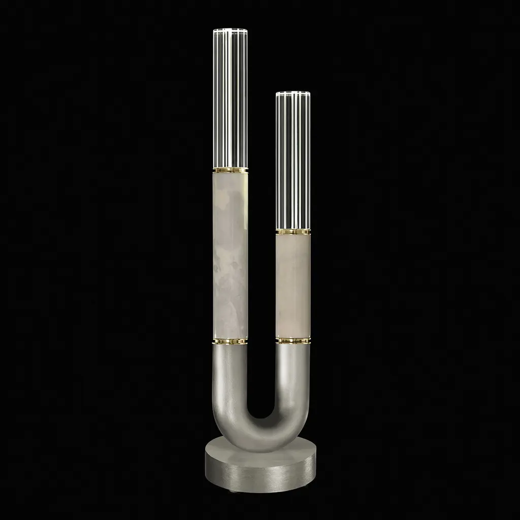 Table lamp featuring soft curves and the inclusion of metals carefully handcrafted to transition from parchment to magnificent glass, culminating in a stunning beam of light. Available in a wide range of exquisite finishes, including our five standard finishes and our newest Soft Ombre Bronze & Soft Ombre Silver, with the choice of two parchment colors, Charcoal and Smoke. Also available with no parchment.