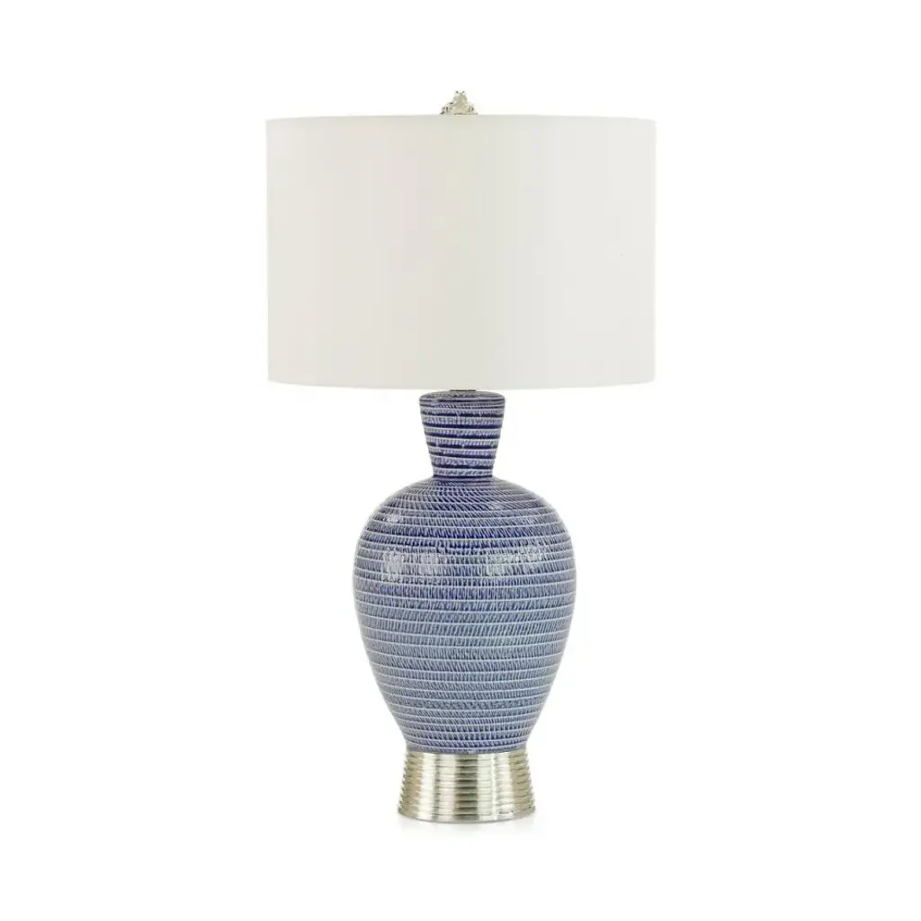 The Anura Table Lamp is a gorgeous decorative accent with a contemporary look that contributes a light, breezy atmosphere to an interior space. Crafted from porcelain, the piece demonstrates a wealth of visual interest through a gorgeous display of blue and white stripes. This turnkey lamp sits atop a striated brass base in a nickel finish, matched by an intricately detailed frog finial perched atop the rim.