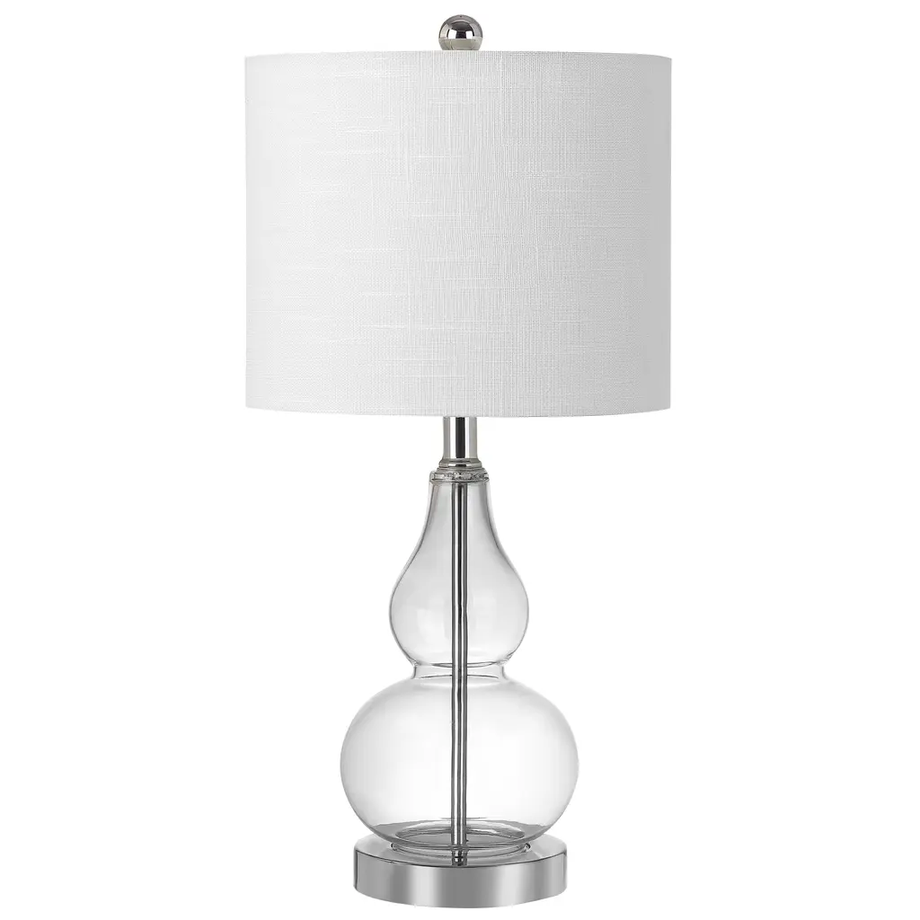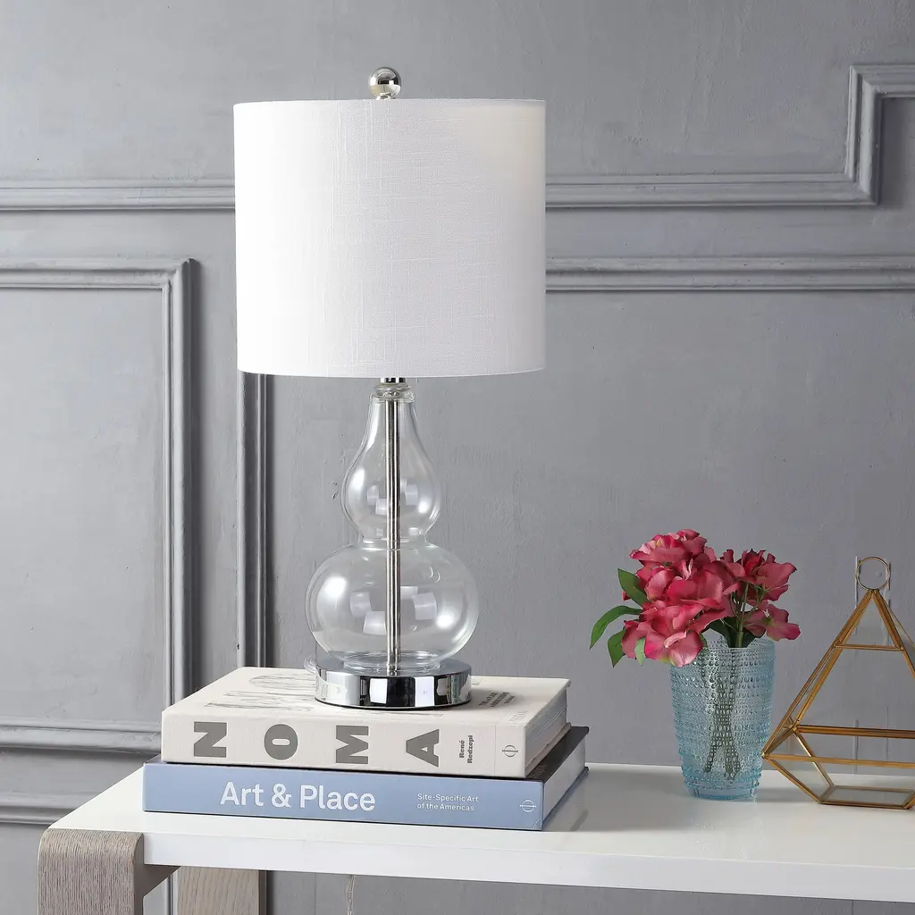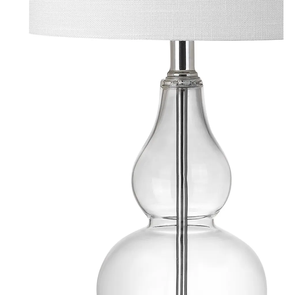The smaller scale of this classic double-gourd table lamp makes it the perfect fashionable and functional accent for a console table or nightstand. The hand-blown glass body stuns in a gorgeous shade of gray, finished with a chrome base pedestal and matching accents. Up top is a white linen fabric shade and chrome sphere finial. A classic glass lamp with a modern shape, this piece will add both light and style to a variety of rooms. Features:Dimensions:About us:You see a lamp.We see a decorative work of art.A perfectly curved shade casts a dramatic shadow on a floor. Compatible with LED lightbulbs: as easy on the environment as they are on the eyes. The JONATHAN Y Lighting collection considers every detail from impeccably sourced materials to designer styling. And our prices are so attractive, we've transformed a functional necessity into a fashion accessory.JONATHAN Y Lighting - a fashion revolution in home decor.